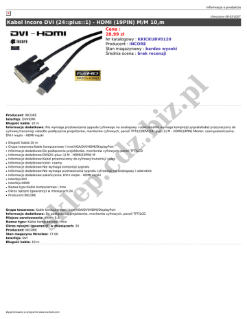 Informacje o produkcie Utworzono 08-03-2017 Kabel Incore DVI (24::plus::1) - HDMI (19PIN) M/M 10,m Cena : 28,99 zł iz .p l Nr katalogowy : KKICKUBV0120 Producent : INCORE Stan magazynowy : bardzo wysoki Średnia ocena : brak recenzji ● ● ● ● ● ● ● ● ● ● ● dz ● Długość kabla:10 m Grupa towarowa:Kable komputerowe i inne\VGA/DVI/HDMI/DisplayPort Informacje dodatkowe:Do podłączenia projektorów, monitorów cyfrowych, paneli TFT/LCD Informacje dodatkowe:DVI(24::plus::1) M - HDMI(19PIN) M Informacje dodatkowe:Kabel przeznaczony do cyfrowej transmisji video Informacje dodatkowe:kolor: czarny Informacje dodatkowe:Nie wymaga kompresji sygnału Informacje dodatkowe:Nie wymaga przetwarzania sygnału cyfrowego na analogowy i odwrotnie Informacje dodatkowe:zakończenia: DVI-I męski - HDMI męski Interfejs:DVI Interfejs:HDMI Nazwa typu:Kable komputerowe i inne Okres rękojmi (gwarancji) w miesiącach:24 Producent:INCORE .c ● le p ● .b Producent: INCORE Interfejs: DVIHDMI Długość kabla: 10 m Informacje dodatkowe: Nie wymaga przetwarzania sygnału cyfrowego na analogowy i odwrotnieNie wymaga kompresji sygnałuKabel przeznaczony do cyfrowej transmisji videoDo podłączenia projektorów, monitorów cyfrowych, paneli TFT/LCDDVI(24::plus::1) M - HDMI(19PIN) Mkolor: czarnyzakończenia: DVI-I męski - HDMI męski sk Grupa towarowa: Kable komputerowe i inne\VGA/DVI/HDMI/DisplayPort Informacje dodatkowe: Do podłączenia projektorów, monitorów cyfrowych, paneli TFT/LCD Miejsce serwisowania: Incom S.A. Nazwa typu: Kable komputerowe i inne Okres rękojmi (gwarancji) w miesiącach: 24 Producent: INCORE Stan magazynu Wrocław: 77.00 Interfejs: DVI Długość kabla: 10 m Wygenerowano w programie www.oscGold.com