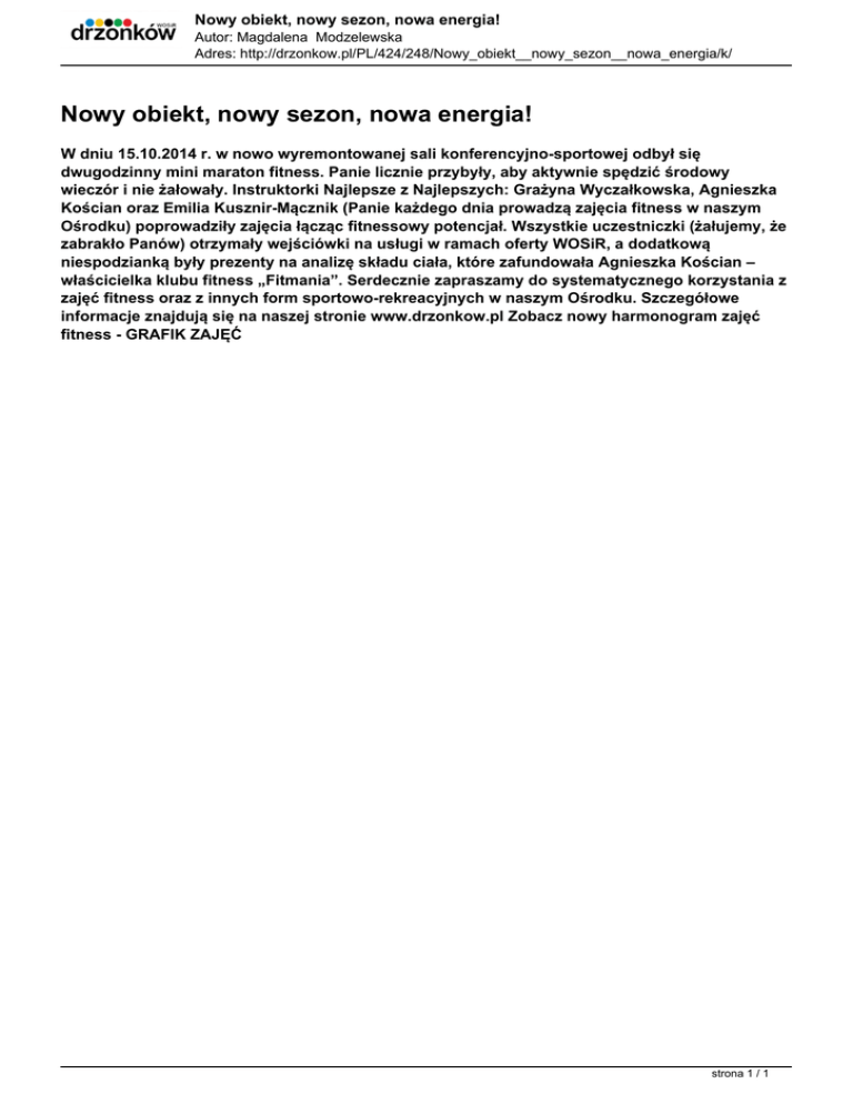 Nowy obiekt, nowy sezon, nowa energia! Autor: Magdalena Modzelewska Adres: http://drzonkow.pl/PL/424/248/Nowy_obiekt__nowy_sezon__nowa_energia/k/ Nowy obiekt, nowy sezon, nowa energia! W dniu 15.10.2014 r. w nowo wyremontowanej sali konferencyjno-sportowej odbył się dwugodzinny mini maraton fitness. Panie licznie przybyły, aby aktywnie spędzić środowy wieczór i nie żałowały. Instruktorki Najlepsze z Najlepszych: Grażyna Wyczałkowska, Agnieszka Kościan oraz Emilia Kusznir-Mącznik (Panie każdego dnia prowadzą zajęcia fitness w naszym Ośrodku) poprowadziły zajęcia łącząc fitnessowy potencjał. Wszystkie uczestniczki (żałujemy, że zabrakło Panów) otrzymały wejściówki na usługi w ramach oferty WOSiR, a dodatkową niespodzianką były prezenty na analizę składu ciała, które zafundowała Agnieszka Kościan – właścicielka klubu fitness „Fitmania”. Serdecznie zapraszamy do systematycznego korzystania z zajęć fitness oraz z innych form sportowo-rekreacyjnych w naszym Ośrodku. Szczegółowe informacje znajdują się na naszej stronie www.drzonkow.pl Zobacz nowy harmonogram zajęć fitness - GRAFIK ZAJĘĆ strona 1 / 1 Powered by TCPDF (www.tcpdf.org)