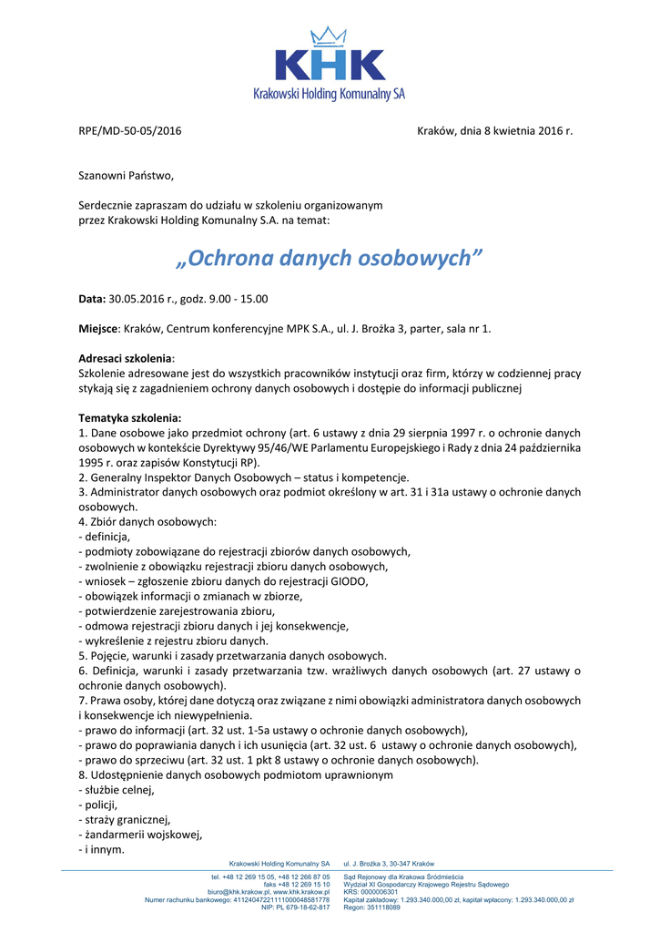 RPE/MD-50-05/2016 Kraków, dnia 8 kwietnia 2016 r. Szanowni Państwo, Serdecznie zapraszam do udziału w szkoleniu organizowanym przez Krakowski Holding Komunalny S.A. na temat: „Ochrona danych osobowych” Data: 30.05.2016 r., godz. 9.00 - 15.00 Miejsce: Kraków, Centrum konferencyjne MPK S.A., ul. J. Brożka 3, parter, sala nr 1. Adresaci szkolenia: Szkolenie adresowane jest do wszystkich pracowników instytucji oraz firm, którzy w codziennej pracy stykają się z zagadnieniem ochrony danych osobowych i dostępie do informacji publicznej Tematyka szkolenia: 1. Dane osobowe jako przedmiot ochrony (art. 6 ustawy z dnia 29 sierpnia 1997 r. o ochronie danych osobowych w kontekście Dyrektywy 95/46/WE Parlamentu Europejskiego i Rady z dnia 24 października 1995 r. oraz zapisów Konstytucji RP). 2. Generalny Inspektor Danych Osobowych – status i kompetencje. 3. Administrator danych osobowych oraz podmiot określony w art. 31 i 31a ustawy o ochronie danych osobowych. 4. Zbiór danych osobowych: - definicja, - podmioty zobowiązane do rejestracji zbiorów danych osobowych, - zwolnienie z obowiązku rejestracji zbioru danych osobowych, - wniosek – zgłoszenie zbioru danych do rejestracji GIODO, - obowiązek informacji o zmianach w zbiorze, - potwierdzenie zarejestrowania zbioru, - odmowa rejestracji zbioru danych i jej konsekwencje, - wykreślenie z rejestru zbioru danych. 5. Pojęcie, warunki i zasady przetwarzania danych osobowych. 6. Definicja, warunki i zasady przetwarzania tzw. wrażliwych danych osobowych (art. 27 ustawy o ochronie danych osobowych). 7. Prawa osoby, której dane dotyczą oraz związane z nimi obowiązki administratora danych osobowych i konsekwencje ich niewypełnienia. - prawo do informacji (art. 32 ust. 1-5a ustawy o ochronie danych osobowych), - prawo do poprawiania danych i ich usunięcia (art. 32 ust. 6 ustawy o ochronie danych osobowych), - prawo do sprzeciwu (art. 32 ust. 1 pkt 8 ustawy o ochronie danych osobowych). 8. Udostępnienie danych osobowych podmiotom uprawnionym - służbie celnej, - policji, - straży granicznej, - żandarmerii wojskowej, - i innym. Krakowski Holding Komunalny SA tel. +48 12 269 15 05, +48 12 266 87 05 faks +48 12 269 15 10 [email protected], www.khk.krakow.pl Numer rachunku bankowego: 41124047221111000048581778 NIP: PL 679-18-62-817 ul. J. Brożka 3, 30-347 Kraków Sąd Rejonowy dla Krakowa Śródmieścia Wydział XI Gospodarczy Krajowego Rejestru Sądowego KRS: 0000006301 Kapitał zakładowy: 1.293.340.000,00 zł, kapitał wpłacony: 1.293.340.000,00 zł Regon: 351118089 9. Zabezpieczenie danych osobowych (obowiązki administratora danych i konsekwencje ich niewypełnienia), instytucja tzw. ABI (tryb zgłaszania, rejestry ABI). 10. Aspekty praktyczne oraz orzecznictwo sądowe z zakresu ochrony danych osobowych. Wykładowca: Agnieszka Jakimowicz – sędzia Wojewódzkiego Sądu Administracyjnego w Krakowie, wcześniej adwokat, absolwentka Wydziału Prawa i Administracji Uniwersytetu Jagiellońskiego. Autorka publikacji m.in. z zakresu prawa i postępowania administracyjnego i sądowo-administracyjnego. Specjalistka z zakresu prawa podatkowego. Warunki uczestnictwa: Koszt udziału w szkoleniu dla jednej osoby to 250 zł netto (tj. 307,50 zł brutto w tym 23% VAT) i obejmuje udział w szkoleniu, materiały szkoleniowe, zaświadczenie o uczestnictwie w szkoleniu oraz wyżywienie. Nasze szkolenia objęte są normą ISO 9001:2008. Termin nadsyłania zgłoszeń: 17 maja 2016 r. Mam nadzieję, że nasza propozycja zainteresuje Państwa i zachęci do skorzystania z naszych usług. W razie dodatkowych pytań i sugestii prosimy o kontakt: Małgorzata Domaradzka, Specjalista ds. marketingu, tel. 12 269 15 05, [email protected].