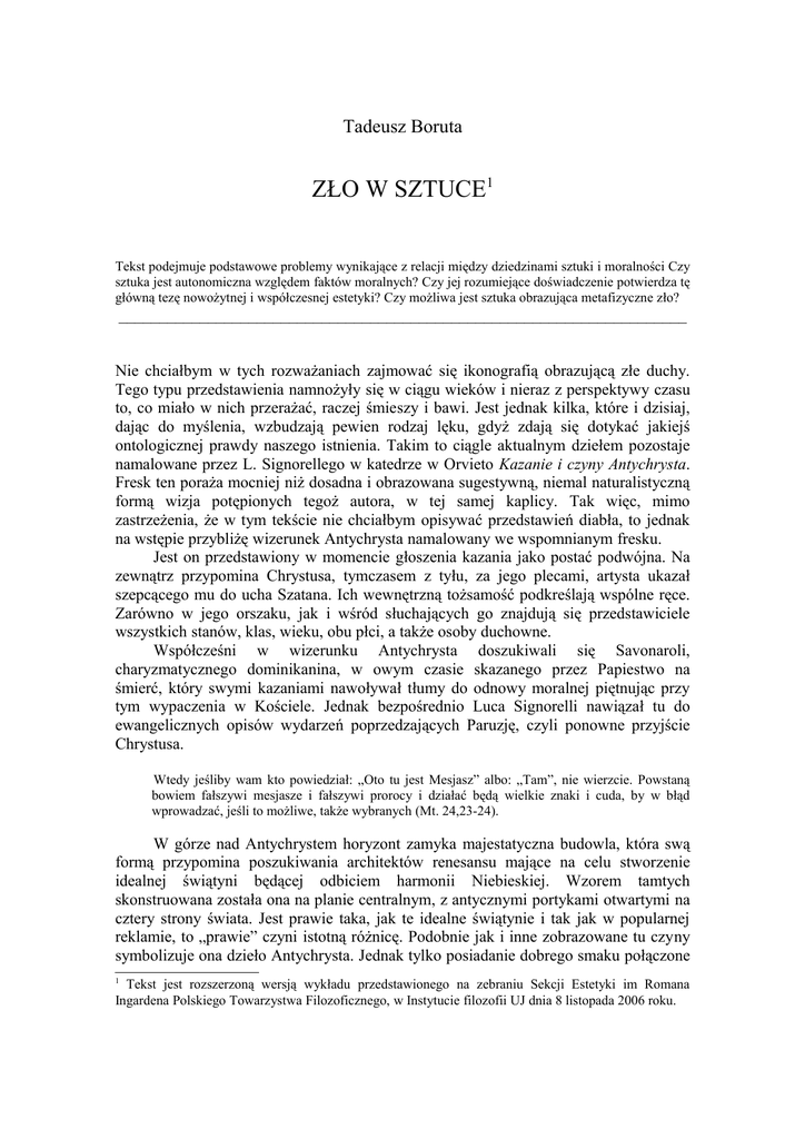 Tadeusz Boruta ZŁO W SZTUCE1 Tekst podejmuje podstawowe problemy wynikające z relacji między dziedzinami sztuki i moralności Czy sztuka jest autonomiczna względem faktów moralnych? Czy jej rozumiejące doświadczenie potwierdza tę główną tezę nowożytnej i współczesnej estetyki? Czy możliwa jest sztuka obrazująca metafizyczne zło? ______________________________________________________________________ Nie chciałbym w tych rozważaniach zajmować się ikonografią obrazującą złe duchy. Tego typu przedstawienia namnożyły się w ciągu wieków i nieraz z perspektywy czasu to, co miało w nich przerażać, raczej śmieszy i bawi. Jest jednak kilka, które i dzisiaj, dając do myślenia, wzbudzają pewien rodzaj lęku, gdyż zdają się dotykać jakiejś ontologicznej prawdy naszego istnienia. Takim to ciągle aktualnym dziełem pozostaje namalowane przez L. Signorellego w katedrze w Orvieto Kazanie i czyny Antychrysta. Fresk ten poraża mocniej niż dosadna i obrazowana sugestywną, niemal naturalistyczną formą wizja potępionych tegoż autora, w tej samej kaplicy. Tak więc, mimo zastrzeżenia, że w tym tekście nie chciałbym opisywać przedstawień diabła, to jednak na wstępie przybliżę wizerunek Antychrysta namalowany we wspomnianym fresku. Jest on przedstawiony w momencie głoszenia kazania jako postać podwójna. Na zewnątrz przypomina Chrystusa, tymczasem z tyłu, za jego plecami, artysta ukazał szepcącego mu do ucha Szatana. Ich wewnętrzną tożsamość podkreślają wspólne ręce. Zarówno w jego orszaku, jak i wśród słuchających go znajdują się przedstawiciele wszystkich stanów, klas, wieku, obu płci, a także osoby duchowne. Współcześni w wizerunku Antychrysta doszukiwali się Savonaroli, charyzmatycznego dominikanina, w owym czasie skazanego przez Papiestwo na śmierć, który swymi kazaniami nawoływał tłumy do odnowy moralnej piętnując przy tym wypaczenia w Kościele. Jednak bezpośrednio Luca Signorelli nawiązał tu do ewangelicznych opisów wydarzeń poprzedzających Paruzję, czyli ponowne przyjście Chrystusa. Wtedy jeśliby wam kto powiedział: „Oto tu jest Mesjasz” albo: „Tam”, nie wierzcie. Powstaną bowiem fałszywi mesjasze i fałszywi prorocy i działać będą wielkie znaki i cuda, by w błąd wprowadzać, jeśli to możliwe, także wybranych (Mt. 24,23-24). W górze nad Antychrystem horyzont zamyka majestatyczna budowla, która swą formą przypomina poszukiwania architektów renesansu mające na celu stworzenie idealnej świątyni będącej odbiciem harmonii Niebieskiej. Wzorem tamtych skonstruowana została ona na planie centralnym, z antycznymi portykami otwartymi na cztery strony świata. Jest prawie taka, jak te idealne świątynie i tak jak w popularnej reklamie, to „prawie” czyni istotną różnicę. Podobnie jak i inne zobrazowane tu czyny symbolizuje ona dzieło Antychrysta. Jednak tylko posiadanie dobrego smaku połączone 1 Tekst jest rozszerzoną wersją wykładu przedstawionego na zebraniu Sekcji Estetyki im Romana Ingardena Polskiego Towarzystwa Filozoficznego, w Instytucie filozofii UJ dnia 8 listopada 2006 roku. z wprawnym okiem i odrobiną wiedzy pozwala wyłapać dysharmonię formy i złe proporcje tej szatańskiej świątyni. Brak tu owej interakcji koła i kwadratu będącej podstawą każdej idealnej budowli centralnej, która wyraża emanację Ducha w materię Ziemi. Nie ma tu zwieńczenia kopułą symbolizującej Sfery Niebieskie. Swą strukturą przypomina ona znacznie późniejszą architekturę socrealistyczną (pałace dla ludu) i budowle faszystowskie wyrażające moc i trwałość. Świątynia Antychrysta, tak jak tamte, zarówno formą, jak i detalem nawiązuje do porządków antycznych, ale podobnie jak współczesny postmodernizm nie ma ona wewnętrznej zasady porządkującej: przyporządkowania części całości. Zbyt rozbudowane portyki podkreślają wymiar horyzontalny. Są niczym doklejone do formy centralnej antyczne świątynie i jako nie podporządkowane jedności symbolizują politeizm. Wieloboczny tamburyn jest zawieszony na suficie głównej budowli bez pośredniczących pendentywów, które przenosiłyby jego ciężar na ściany boczne i fundamenty. Taka budowla była wówczas niewykonalna (gdyż nie znano żelbetonu) a więc była rodzajem mirażu łudzącym przepychem i wielkością, ale jako naruszająca naturalne prawa ciążenia próba jej urzeczywistnienia wróżyła pewną katastrofę. Fresk L. Signorellego zdaje się mówić, że dzieła Szatana wyrażają się w relatywizmie, tworzeniu nierzeczywistych, powierzchownych wizji, które zafascynowanych nimi wyznawców prowadzą ku zatraceniu. Może to także miał na myśli Jerzy Nowosielski wydając przed laty sąd o diaboliczności sztuki nowych mediów? A diagnoza ta właściwie dotyczyłaby całej współczesnej kultury. Zastanawiając się nad obecnością zła w sztuce przypomniałem sobie ową refleksję Jerzego Nowosielskiego na temat twórczości artystów, którzy w swoich realizacjach stosują komputery, lasery i inne tzw. nowe media. Opowiadał on swoje doświadczenie po oglądnięciu, bodaj w Paryżu, wystawy prezentującej takie dzieła. Miało to miejsce z początkiem lat osiemdziesiątych i z perspektywy dzisiejszej, zarówno te elektroniczne narzędzia były stosunkowo prymitywne, jak i stosujący je artyści jeszcze "raczkowali" w nowych mediach. Jerzy Nowosielski długo błądził po ekspozycji, został oczarowany możliwościami i efektami komputerowych prac, trudno mu było oderwać oczy; jednak gdy stamtąd wyszedł i ochłonął z wrażeń uświadomił sobie, że oto miał do czynienia ze sztuką diabelską, która w przeciwieństwie do sztuki anielskiej duchowo ogołaca. Oglądający ją człowiek, po obudzeniu się z fascynującego mirażu, pozostaje w jeszcze większej pustce. W sztuce komputerów nie chodzi o obrazowanie substancjalnego zła, czyli szatana, lecz o jego działanie n