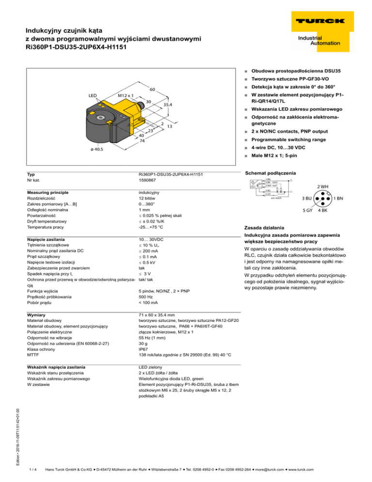 Indukcyjny czujnik kąta z dwoma programowalnymi wyjściami dwustanowymi Ri360P1-DSU35-2UP6X4-H1151 ■ Obudowa prostopadłościenna DSU35 ■ Tworzywo sztuczne PP-GF30-VO ■ Detekcja kąta w zakresie 0° do 360° ■ W zestawie element pozycjonujący P1Ri-QR14/Q17L ■ Wskazania LED zakresu pomiarowego ■ Odporność na zakłócenia elektromagnetyczne ■ 2 x NO/NC contacts, PNP output ■ Programmable switching range ■ 4-wire DC, 10…30 VDC ■ Male M12 x 1; 5-pin Typ Nr kat. Ri360P1-DSU35-2UP6X4-H1151 1590867 Measuring principle Rozdzielczość Zakres pomiarowy [A…B] Odległość nominalna Powtarzalność Dryft temperaturowy Temperatura pracy indukcyjny 12 bitów 0…360° 1 mm ð 0.025 % pełnej skali ð ± 0.02 %/K -25…+75 °C Napięcie zasilania Tętnienia szczątkowe Nominalny prąd zasilania DC Prąd szczątkowy Napięcie testowe izolacji Zabezpieczenie przed zwarciem Spadek napięcia przy Ie Ochrona przed przerwą w obwodzie/odwrotną polaryzacją Funkcja wyjścia Prędkość próbkowania Pobór prądu 10… 30VDC ð 10 % Uss ð 200 mA ð 0.1 mA ð 0.5 kV tak ð 3V tak/ tak Wymiary Materiał obudowy Materiał obudowy, element pozycjonujący Połączenie elektryczne Odporność na wibracje Odporność na uderzenia (EN 60068-2-27) Klasa ochrony MTTF 71 x 60 x 35.4 mm tworzywo sztuczne, tworzywo sztuczne PA12-GF20 tworzywo sztuczne, PA66 + PA6I/6T-GF40 złącze kołnierzowe, M12 x 1 55 Hz (1 mm) 30 g IP67 138 rok/lata zgodnie z SN 29500 (Ed. 99) 40 °C Wskaźnik napięcia zasilania Wskaźnik stanu przełączenia Wskaźnik zakresu pomiarowego W zestawie LED zielony 2 x LED żółta / żółta Wielofunkcyjna dioda LED, green Element pozycjonujący P1-Ri-DSU35, śruba z łbem stożkowym M6 x 25, 2 śruby okrągłe M5 x 12, 2 podkładki A5 Zasada działania Indukcyjna zasada pomiarowa zapewnia większe bezpieczeństwo pracy W oparciu o zasadę oddziaływania obwodów RLC, czujnik działa całkowicie bezkontaktowo i jest odporny na namagnesowane opiłki metali czy inne zakłócenia. W przypadku odchyleń elementu pozycjonującego od położenia idealnego, sygnał wyjściowy pozostaje prawie niezmienny. Edition • 2016-11-09T11:51:42+01:00 5 pinów, NO/NZ , 2 × PNP 500 Hz < 100 mA Schemat podłączenia 1/4 Hans Turck GmbH & Co.KG ñ D-45472 Mülheim an der Ruhr ñ Witzlebenstraße 7 ñ Tel. 0208 4952-0 ñ Fax 0208 4952-264 ñ [email protected] ñ www.turck.com Indukcyjny czujnik kąta z dwoma programowalnymi wyjściami dwustanowymi Ri360P1-DSU35-2UP6X4-H1151 Ri-DSU35 do instalacji na napędach obrotowych Czujnik kąta Ri-DSU35 i starszy, dobrze znany indukcyjny czujnik podwójny Ni4-DSU35 posiadają identyczną budowę. Użytkownik uzyskuje urządzenie o wysokiej elastyczności montażowej. Czujnik może być instalowany na wszystkich standardowych napędach obrotowych z wałkiem o średnicy nie większej niż 14 mm dzięki szerokiej ofercie akcesoriów montażowych. W przypadku większych średnic wałka stosuje się akcesoria BTS-DSU35-Z02. Funkcja diody LED Napięcie zasilania Zielona: Zasilanie zał. Zakres pomiarowy Zielona: Element pozycjonujący jest w zakresie pomiarowym Zielona migająca: Element pozycjonujący w zakresie pomiarowym, sygnał niski (np. za duża odległość) Dioda LED jest wyłączona: Element pozycjonujący poza zakresem detekcji Stan przełączania Edition • 2016-11-09T11:51:42+01:00 2 x żółty: Wyjście w stanie przełączenia 2/4 Hans Turck GmbH & Co.KG ñ D-45472 Mülheim an der Ruhr ñ Witzlebenstraße 7 ñ Tel. 0208 4952-0 ñ Fax 0208 4952-264 ñ [email protected] ñ www.turck.com Indukcyjny czujnik kąta z dwoma programowalnymi wyjściami dwustanowymi Ri360P1-DSU35-2UP6X4-H1151 Instrukcje uczące Indywidualnie (nauka z elementem pozycjonującym) Mostek z wejściem teach pin Masa Ub 5 (szary) Pin 3 (nieb.) Pin 1 (brąz.) 2 sekundy wartość startowa wyjścia dwu- wartość startowa wyjścia dwustano- zielona dioda LED miga, po 2 sek. stanowego 1 szybko miga 2 sekundy LED wego 2 wartość końcowa wyjścia dwu- wartość końcowa wyjścia dwustano- zielona dioda LED miga, po 2 sek. stanowego 1 wego 2 świeci w sposób stały, odpowied- Obrót przeciwnie do kierunku Obrót zgodny z kierunkiem wskazó- nia żółta dioda LED stanu miga 10 sekund po 10 sek. diody LED stanu i zasi- wskazówek zegara lub ewentu- wek zegara lub ewentualnie inwersja lania migają równocześnie na ziealnie inwersja wyjść dwustano- wyjść dwustanowych lono wych 15 sekund - Ustawienia fabryczne po 15 sek. diody LED stanu i zasi- S1 = 90°, S2 = 0° lania migają na zmianę na zielono Tryb ustawień fabrycznych (nauka bez elementu pozycjonującego) Mostek z wejściem teach pin Masa Ub 5 (szary) Pin 3 (nieb.) Pin 1 (brąz.) 2 sekundy aktywny tryb ustawień fabrycz- aktywny tryb ustawień fabrycznych po 2 sek. dioda LED zasilania mi- nych ga na zielono 15 sekund - LED Ustawienia fabryczne po 15 sek. diody LED stanu i za- S1 = 90°, S2 = 0° silania migają na zmianę na zielono Punkty przełączania Masa Ub Pin 3 (nieb.) Pin 1 (brąz.) Dioda LED stanu S1 = 45 °, S2 = 0° naciśnij raz - pojedyncze mignięcie S1 = 135 °, S2 = 0° naciśnij dwa razy - podwójne mignięcie S1 = 90°, S2 = 0°, duży za- - naciśnij raz pojedyncze mignięcie - naciśnij dwa razy podwójne mignięcie kres detekcji Ustawienia fabryczne Edition • 2016-11-09T11:51:42+01:00 S1 = 90°, S2 = 0° 3/4 Hans Turck GmbH & Co.KG ñ D-45472 Mülheim an der Ruhr ñ Witzlebenstraße 7 ñ Tel. 0208 4952-0 ñ Fax 0208 4952-264 ñ [email protected] ñ www.turck.com Indukcyjny czujnik kąta z dwoma programowalnymi wyjściami dwustanowymi Ri360P1-DSU35-2UP6X4-H1151 Akcesoria montażowe Typ Nr kat. BTS-DSU35-Z01 6900229 Rysunek wymiarowy Zestaw montażowy czujników podwójnych przeznaczony dla większych napędów obrotowych: Dystans i pierścień maks. Ø 65 mm; rozstaw otworów na powierzchni montażowej 30 x 80 mm (30 x 130 mm); trzpień mocujący: wysokość 30 mm / Ø maks. 30 mm BTS-DSU35-Z02 69002