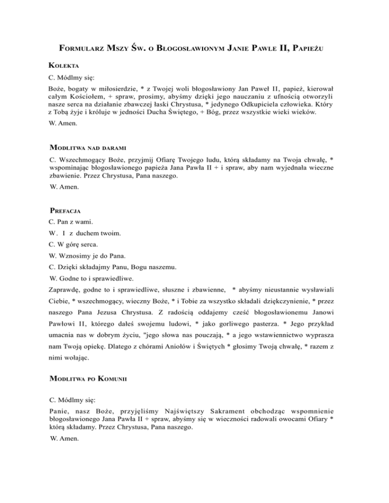 FORMULARZ MSZY ŚW. O BŁOGOSŁAWIONYM JANIE PAWLE II, PAPIEŻU KOLEKTA C. Módlmy się: Boże, bogaty w miłosierdzie, * z Twojej woli błogosławiony Jan Paweł II, papież, kierował całym Kościołem, + spraw, prosimy, abyśmy dzięki jego nauczaniu z ufnością otworzyli nasze serca na działanie zbawczej łaski Chrystusa, * jedynego Odkupiciela człowieka. Który z Tobą żyje i króluje w jedności Ducha Świętego, + Bóg, przez wszystkie wieki wieków. W. Amen. MODLITWA NAD DARAMI C. Wszechmogący Boże, przyjmij Ofiarę Twojego ludu, którą składamy na Twoja chwałę, * wspominając błogosławionego papieża Jana Pawła II + i spraw, aby nam wyjednała wieczne zbawienie. Przez Chrystusa, Pana naszego. W. Amen. PREFACJA C. Pan z wami. W . I z duchem twoim. C. W górę serca. W. Wznosimy je do Pana. C. Dzięki składajmy Panu, Bogu naszemu. W. Godne to i sprawiedliwe. Zaprawdę, godne to i sprawiedliwe, słuszne i zbawienne, * abyśmy nieustannie wysławiali Ciebie, * wszechmogący, wieczny Boże, * i Tobie za wszystko składali dziękczynienie, * przez naszego Pana Jezusa Chrystusa. Z radością oddajemy cześć błogosławionemu Janowi Pawłowi II, którego dałeś swojemu ludowi, * jako gorliwego pasterza. * Jego przykład umacnia nas w dobrym życiu, "jego słowa nas pouczają, * a jego wstawiennictwo wyprasza nam Twoją opiekę. Dlatego z chórami Aniołów i Świętych * głosimy Twoją chwałę, * razem z nimi wołając. MODLITWA PO KOMUNII C. Módlmy się: Panie, nasz Boże, przyjęliśmy Najświętszy Sakrament obchodząc wspomnienie błogosławionego Jana Pawła II + spraw, abyśmy się w wieczności radowali owocami Ofiary * którą składamy. Przez Chrystusa, Pana naszego. W. Amen.