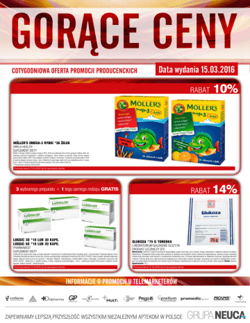 COTYGODNIOWA OFERTA PROMOCJI PRODUCENCKICH Data wydania 15.03.2016 RABAT 10% RABAT 14% MÖLLER’S OMEGA-3 RYBKI *36 ŻELEK ORKLA HEALTH SUPLEMENT DIETY Möller’s Omega-3 Rybki to kwasy omega-3 EPA i DHA oraz witamina D3 w formie pysznych żelków, które nie zawierają sztucznych barwników i substancji słodzących. Twoje dziecko je pokocha. Nowa formuła zawiera jeszcze więcej kwasu DHA! Teraz dostępne w dwóch smakach: owocowym i cytrynowo-pomarańczowym. DHA korzystnie wpływa na pracę mózgu i oczu1. Witamina D wspomaga odporność oraz prawidłowy wzrost i rozwój kości u dzieci. Produkt przeznaczony dla dzieci powyżej 3 roku życia. www.mollers.pl 1 Przy dziennym spożyciu 250 mg DHA Promocja trwa do 21.03.2016 lub do wyczerpania stanów. 3 wybranego preparatu + 1 tego samego rodzaju GRATIS LOGGIC 30 *10 LUB 30 KAPS. LOGGIC 60 *10 LUB 20 KAPS. PHARMABEST SUPLEMENT DIETY GLUKOZA *75 G TOREBKA LABORATORIUM GALENOWE OLSZTYN PRODUKT LECZNICZY OTC LoGGic® jest suplementem diety w postaci kapsułek. Przeznaczony do suplementacji diety niemowląt, dzieci i osób dorosłych. Kapsułka zawiera 3 lub 6 miliardów jednostek tworzących kolonie (jtk.) szczepu probiotycznego Lactobacillus rhamnosus GG (ATCC 53103). Postać produktu: kapsułki żelatynowe twarde. Zalecana dzienna porcja do spożycia: 1 kapsułka. Składniki: maltodekstryna, liofilizat bakterii kwasu mlekowego: Lactobacillus rhamnosus GG (ATCC 53103) - wytworzono z udziałem kazeiny z mleka; substancja przeciwzbrylająca - mono- i diglicerydy kwasów tłuszczowych; składniki otoczki kapsułki: żelatyna, barwnik - dwutlenek tytanu. Promocja trwa do 21.03.2016 lub do wyczerpania stanów. Wskazania: Zalecana w stanach wyczerpania długotrwałego wysiłku fizycznego oraz w stanach silnego odwodnienia i osłabienia mięśnia sercowego. Właściwości: Podstawowe źródło energii, łatwo wchłania się. Niezbędna we wszystkich stanach niedoborów węglowodanów. Zalecana jest jako substancja odżywcza dla niemowląt i ludzi starszych z upośledzeniem wchłaniania cukru. Zmniejsza zapotrzebowanie na metabolizm tłuszczów, zapobiega ketonemii i kwasicy. Pobudza akcję serca, stąd konieczność podawania jej w niedomogach mięśnia sercowego, Stosowania, jest również w krwawieniach i krwotokach, ponieważ zwiększa krzepliwość krwi. Sposób użycia: W dawkach indywidualnych w zależności od stanu zdrowia i wieku pacjenta. Skład: Glukoza. Opakowanie: 75 g. Promocja trwa do 21.03.2016 lub do wyczerpania stanów. INFORMACJE O PROMOCJI U TELEMARKETERÓW COTYGODNIOWA OFERTA PROMOCJI PRODUCENCKICH Data wydania 15.03.2016 2+1 groszówka, 4+3 groszówki, 5+5 groszówek 2+1 groszówka, 4+3 groszówki, 5+5 groszówek VITA D FORTE 1000 *45 KAPS. MIEKK. VITA D FORTE 2000 *45 KAPS. MIEKK. VITIS PHARMA SUPLEMENT DIETY VITIS PHARMA SUPLEMENT DIETY VITA D FORTE - do stosowania przez wszystkie grupy pacjentów niezależnie od wieku! Vita D 1000 Forte to suplement diety w postaci kapsułek miękkich, łatwych do połknięci w szczególności przez osoby starsze. Opakowanie zawiera 45 kapsułek miękkich – wystarcza na ponad miesiąc terapii! Vita D Forte uzupełnia dietę w witaminę D, która pomaga w utrzymaniu prawidłowego poziomu wapnia we krwi oraz w prawidłowym wykorzystywaniu wapnia i fosforu. Pomaga także w utrzymaniu zdrowych kości i w prawidłowym funkcjonowaniu mięśni. Ponadto witamina D pomaga zmniejszyć ryzyko upadku związanego z niestabilnością postawy i osłabieniem mięśni. Promocja trwa do 21.03.2016 lub do wyczerpania stanów. VITA D FORTE - do stosowania przez wszystkie grupy pacjentów niezależnie od wieku! Vita D 2000 Forte to suplement diety w postaci kapsułek miękkich, łatwych do połknięci w szczególności przez osoby starsze. Opakowanie zawiera 45 kapsułek miękkich – wystarcza na ponad miesiąc terapii! Vita D Forte uzupełnia dietę w witaminę D, która pomaga w utrzymaniu prawidłowego poziomu wapnia we krwi oraz w prawidłowym wykorzystywaniu wapnia i fosforu. Pomaga także w utrzymaniu zdrowych kości i w prawidłowym funkcjonowaniu mięśni. Ponadto witamina D pomaga zmniejszyć ryzyko upadku związanego z niestabilnością postawy i osłabieniem mięśni. Promocja trwa do 21.03.2016 lub do wyczerpania stanów. RABAT 10% RABAT 4% GO-ON PŁYN 25 MG/2,5 ML *1 AMP.STRZ. ROTTAPHARM WYRÓB MEDYCZNY Skład: Każda sterylna strzykawka do jednorazowego stosowania zawiera 2,5 ml 1% roztworu hialuronianu sodu oraz sodu chlorek, sodu monowodorofosforan, sodu dwuwodorofosforan i wodę do wstrzykiwań. Wskazania do stosowania: Uzupełnienie deficytów lepkości i sprężystości mazi stawowej w stawach kolanowych i ramieniowych, przeznaczony jest również do wiskosuplementacji pozostałych stawów maziowych. Działa smarująco na stawy oraz poprawia ich funkcje mechaniczne, ma zastosowanie w łagodzeniu objawów choroby zwyrodnieniowej stawów. Dawkowanie i sposób podawania: Podawać dostawowo. Zaleca się 5 iniekcji w odstępach tygodniowych. W zależności od stopnia nasilenia choroby efekt leczniczy po 5-ciu iniekcjach może trwać przez ponad 6 miesięcy. W przypadku wysięku do stawu zaleca się przeprowadzenie punkcji wysięku, unieruchomienie stawu, okład z lodu oraz/lub dostawowe podanie kortykosteroidów. Przeciwwskazania: Nadwrażliwość na którykolwiek ze składników preparatu w przeszłości. Choroby zapalne stawów, takie jak reumatoidalne zapalenie stawów lub choroba Bechterewa. Ostrzeżenia i środki ostrożności: Długotrwała wiskosuplementacja preparatem GO-ON w stawach innych niż kolanowe i ramieniowe może być stosowana tylko w przypadkach planowanej wymiany danego stawu. Należy zachować ogólne środki ostrożności przy wstrzykiwaniach dostawowych. Stosowanie u osób starszych: podawać ostrożnie, ze względu na osłabienie funkcji fizjologicznych u tych pacjentów. Stosowanie u dzieci: ze względu na brak potwierdzenia bezpieczeństwa stosowania u dzieci, sto