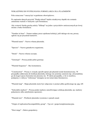 WSKAZÓWKI DO WYPEŁNIANIA FORMULARZA DLA PLAZMIDÓW Pola oznaczone * muszą być wypełnione obowiązkowo. Po zapisaniu danych przycisk "Dodaj rekord" będzie nieaktywny dopóki nie zostanie zmieniona wartość w którymś z pól formularza. Aby wstawić literkę grecką należy "kliknąć" na jeden z przycisków umieszczonych po lewej stronie z boku formularza. "Number in base" - Numer nadany przez opiekuna kolekcji, jeśli takiego nie ma, proszę zgłosić się po przydział numerów. "Plasmid name" - Nazwa własna plazmidu. "Species" - Nazwa gatunkowa organizmu. "Strain" - Nazwa własna szczepu. "Genotype" - Proszę podać pełen genotyp. "Plasmid Sequence" - Bez komentarza. "Construction" - Proszę w zwięzły sposób opisać jak plazmid został skonstruowany. W przypadku oddawania do kolekcji plazmidu, którego nie jesteśmy autorem (np. otrzymaliśmy go do kogoś spoza Instytutu) nie piszemy nic. W takim przypadku, o ile to możliwe, podajemy w rubryce "referencje" dostępne na ten temat dane literaturowe. "Plasmid map" - Mapa plazmidu może być załączona w postaci pliku graficznego np. jpg, tiff. "Selectable markers" - Proszę podać markery umożliwiające selekcję plazmidu, np. markery pokarmowe albo antybiotyko-oporności. "Plasmid size" - Wielkość plazmidu wyrażona w parach zasad. "Origin of replication/Incompatibility group" - Typ ori / grupa komplementacyjna. "Host range" - Zakres gospodarzy. "Other genetic elements" - Bez komentarza. "Strain properties/Comments" - Np.: termowrażliwość, nietypowy czas wzrostu (dłuższy niż zwykły dla danego organizmu), nietypowe stężenie antybiotyków i inne. "Author" - Podajemy imię i nazwisko autora, a nie osoby oddającej szczep do kolekcji. "Availability" - Proszę określić, czy dany szczep ma być dla zainteresowanych dostępny bez konsultacji, za każdorazową zgodą czy też całkowicie niedostępny. "Patent" - Bez komentarza. "Depositor" - Osoba deponująca szczep, niekoniecznie autor szczepu. "Deposition date" - Bez komentarza. "Storage details" – Wypełnia opiekun kolekcji. "Date of picking the strain" - Wypełnia opiekun kolekcji. "References" - Proszę ograniczyć się do podania autora i dokładnych danych o czasopiśmie (tytuł zbędny).