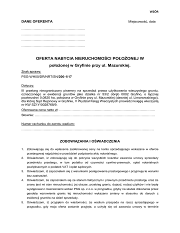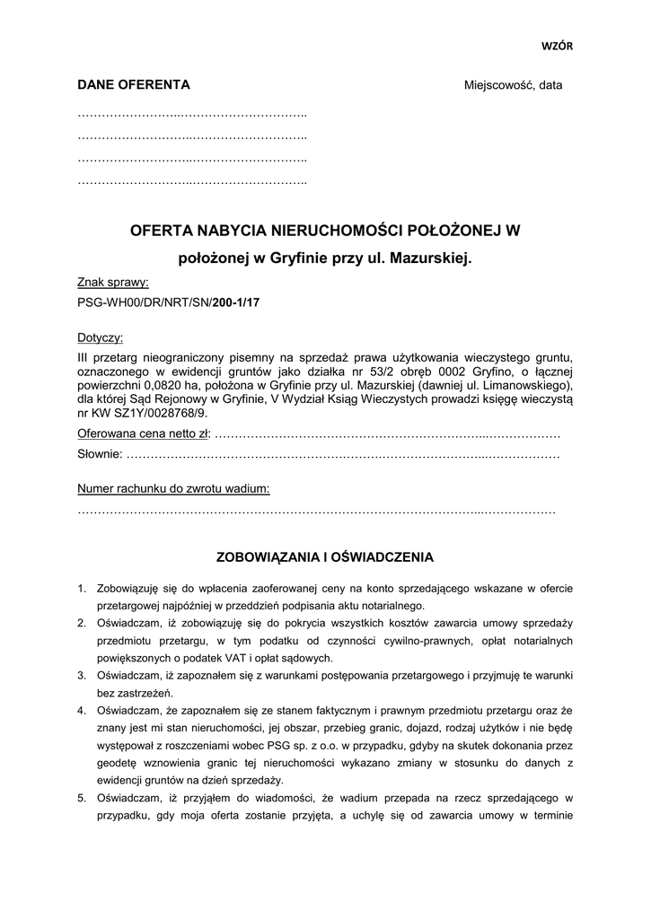 WZÓR Miejscowość, data DANE OFERENTA ……………………..………………………….. ………………………..……………………….. ………………………..……………………….. ………………………..……………………….. OFERTA NABYCIA NIERUCHOMOŚCI POŁOŻONEJ W położonej w Gryfinie przy ul. Mazurskiej. Znak sprawy: PSG-WH00/DR/NRT/SN/200-1/17 Dotyczy: III przetarg nieograniczony pisemny na sprzedaż prawa użytkowania wieczystego gruntu, oznaczonego w ewidencji gruntów jako działka nr 53/2 obręb 0002 Gryfino, o łącznej powierzchni 0,0820 ha, położona w Gryfinie przy ul. Mazurskiej (dawniej ul. Limanowskiego), dla której Sąd Rejonowy w Gryfinie, V Wydział Ksiąg Wieczystych prowadzi księgę wieczystą nr KW SZ1Y/0028768/9. Oferowana cena netto zł: …………………………………………………………...……………… Słownie: ……………………………………………………….……………………...……………… Numer rachunku do zwrotu wadium: ………………………………………………………………………………………...……………… ZOBOWIĄZANIA I OŚWIADCZENIA 1. Zobowiązuję się do wpłacenia zaoferowanej ceny na konto sprzedającego wskazane w ofercie przetargowej najpóźniej w przeddzień podpisania aktu notarialnego. 2. Oświadczam, iż zobowiązuję się do pokrycia wszystkich kosztów zawarcia umowy sprzedaży przedmiotu przetargu, w tym podatku od czynności cywilno-prawnych, opłat notarialnych powiększonych o podatek VAT i opłat sądowych. 3. Oświadczam, iż zapoznałem się z warunkami postępowania przetargowego i przyjmuję te warunki bez zastrzeżeń. 4. Oświadczam, że zapoznałem się ze stanem faktycznym i prawnym przedmiotu przetargu oraz że znany jest mi stan nieruchomości, jej obszar, przebieg granic, dojazd, rodzaj użytków i nie będę występował z roszczeniami wobec PSG sp. z o.o. w przypadku, gdyby na skutek dokonania przez geodetę wznowienia granic tej nieruchomości wykazano zmiany w stosunku do danych z ewidencji gruntów na dzień sprzedaży. 5. Oświadczam, iż przyjąłem do wiadomości, że wadium przepada na rzecz sprzedającego w przypadku, gdy moja oferta zostanie przyjęta, a uchylę się od zawarcia umowy w terminie WZÓR ustalonym przez sprzedającego lub jeżeli żaden z uczestników przetargu nie zaoferuje ceny wywoławczej. 6. Oświadczam, że wyrażam zgodę na przetwarzanie przez PSG sp. z o.o. z siedzibą w Warszawie przy ul. Kasprzaka 25 moich danych osobowych w celu przeprowadzenia postępowania przetargowego i zawarcia umowy sprzedaży nieruchomości, zgodnie z ustawą z dnia 29 sierpnia 1997 r. o ochronie danych osobowych (Dz.U.2014.1182 z późn. zm) 7. Zostałem(am) poinformowany(a), że dane osobowe nabywcy nieruchomości oraz cena nabycia zostaną podane w ogłoszeniu o wynikach przetargu. 8. Jednocześnie potwierdzam, iż zostałem(am) poinformowany(a) o prawie dostępu do treści moich danych, prawie ich poprawiania, a także w przypadkach określonych w ustawie o ochronie danych osobowych, o prawie sprzeciwu wobec ich przetwarzania. Załączniki: 1. ……………………………………………………………………………………………………………. 2. ……………………………………………………………………………………………………………. 3. ……………………………………………………………………………………………………………. 4. ……………………………………………………………………………………………………………. PODPIS OFERENTA