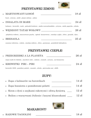 PRZYSTAWKI ZIMNE: MARYNOWANY ŁOSOŚ _________________________ 18 zł _________________________ 24 zł łosoś , cytryna , miód , pieprz zielony , sałaty INSALATA DI MARE kalmary , krewetki , mule , paluszki krabowe , małże nowozelandzkie , cytryna , miód, papryka , cebula. WĘDZONY TATAR WOŁOWY _________________________ 26 zł polędwica wołowa , marynowane grzyby , ogórek konserwowy , emulsja z jajka , oliwa , grzanki , dym . BRESAOLA _________________________ 25 zł suszona wołowina , rukola , emulsja ziołowa , oliwa , parmezan , pomidorki koktajlowe. PRZYSTAWKI CIEPŁE: PRZEGRZEBKI A LA PLANETA ____________________ 26 zł mięso małż św Jakuba , marchew seler , cukinia , czosnek , cytryna , sos homarowy KREWETKI PIRI – PIRI ____________________ 24 zł krewetki 16/20 , pomidory pelatti , czosnek , cebula , pietruszka nać , chilli . ZUPY: Zupa z kalmarów na borowikach ________________ 14 zł Zupa łososiowa z pomidorami pelatti ________________ 14 zł Krem z dyni z szyjkami rakowymi i oliwą dyniową _____ 12 zł Bulion z warzywami Julienie i lanymi kluseczkami ____ 12 zł MAKARONY: RAZOWE TAGIOLINI _____________________________ 18 zł suszone pomidory , pesto , oliwki , pietruszka , czosnek , oliwa , parmezan. PENNE TOSCANA 22 zł _____________________________ szynka parmeńska , borowik , cebula , czosnek , pomidorki koktajlowe , parmezan. 25 zł LINGUINE AGLIO OLIO _____________________________ krewetki , mule , vongole , czosnek , oliwa , pietruszka , chilli , bulion. CARBONARA 20 zł _____________________________ makaron linguine , boczek , cebula , czosnek , śmietana , żółtko , parmezan . RYBY: SANDACZ ___________________ 32 zł sos krewetkowy , kasza pęczak , kurki , tagiolini z blanszowanej marchewki DORSZ Z GRILLA W BULIONIE ___________________ 30 zł marchew , seler , cukinia , pieczarki , bulion szafranowy , molekularna pianka z czarnej porzeczki . ŁOSOŚ W PERGAMINIE ___________________ ziemniaki konfit , pieczarki , cebula , papryka , sos Bernasie PSTRĄG Z RUSZTU 36 zł . ___________________ 32 zł _____________ 56 zł _____________ 42 zł sos borowikowy, ziemniaki z truflą, brokuł. MIĘSA: GICZ CIELĘCA puree z selera , blanszowana marchew , sos tymiankowy. GRILLATA comber jagnięcy , polędwiczka wieprzowa , indyk , polędwica wołowa , sałaty , sos jogurtowo ziołowy SCHAB Z KOŚCIĄ NA PEPERONACIE ______________ 32 zł ______________ 52 zł cukinia , papryka , cebula , pieczarki, tymianek , sos Koniakowy . STEK WOŁOWY polędwica wołowa, grzyby , sos pieprzowy , cukinia , bakłażan . KACZKA ______________ czerwona kapusta , żurawina , pomarańcz , pieczony ziemniak , sos grand marnier GĘŚ 42 zł . ______________ 42 zł sos z węgierek , szare kluski , warzywa blanszowane DESERY: KREM BRULE __________________________ 14 zł _________________________ 16 zł _________________________ 16 zł _________________________ 36 zł Z CHAŁWĄ I CUKREM TRZCINOWYM PIECZONE LODY NA SOSIE WANILIOWO TRUSKAWKOWYM SERNIK CYNAMONOWY Z GRUSZKĄ NA PUREE Z PORZECZKI DESKA SERÓW Z SUSZONYMI OWOCAMI I KONFITURĄ MANU RESTAURACJI PLANETA AUTORSTWA WIESŁAW OGRODOWSKI SZEF KUCHNI SZEF KUCHNI POLECA Sałatka szefa kuchni –krucha sałata , ogórek ,pomidor, szynka parmeńska, jajko, ser gorgonzola , sos koktajlowy , prażone migdały, marchew , oliwa , bagietka. 20zł Sałatka grecka – pomidor , ogórek , cebula , greckie oliwki , ser feta , papryka , sos bazyliowy , bagietka. 18zł Mule – marchew , seler , cukinia, papryka , czosnek, białe wino ,pietruszka ,bulion, bagietka. 24 zł Pieczony filet z kurczaka – suszone pomidory , mozzarella , szynka parmeńska , szpinak , blanszowany makaron linguinii , sos pellatti , brokuł . 34 zł