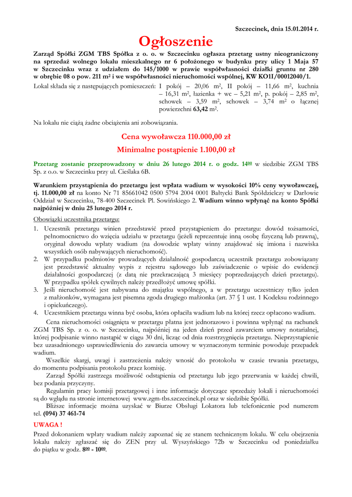 Szczecinek, dnia 15.01.2014 r. Ogłoszenie Zarząd Spółki ZGM TBS Spółka z o. o. w Szczecinku ogłasza przetarg ustny nieograniczony na sprzedaŜ wolnego lokalu mieszkalnego nr 6 połoŜonego w budynku przy ulicy 1 Maja 57 w Szczecinku wraz z udziałem do 145/1000 w prawie współwłasności działki gruntu nr 280 w obrębie 08 o pow. 211 m2 i we współwłasności nieruchomości wspólnej, KW KO1I/00012040/1. Lokal składa się z następujących pomieszczeń: I pokój – 20,06 m2, II pokój – 11,66 m2, kuchnia – 16,31 m2, łazienka + wc – 5,21 m2, p. pokój – 2,85 m2, schowek – 3,59 m2, schowek – 3,74 m2 o łącznej powierzchni 63,42 m2. Na lokalu nie ciąŜą Ŝadne obciąŜenia ani zobowiązania. Cena wywoławcza 110.000,00 zł Minimalne postąpienie 1.100,00 zł Przetarg zostanie przeprowadzony w dniu 26 lutego 2014 r. o godz. 1400 w siedzibie ZGM TBS Sp. z o.o. w Szczecinku przy ul. Cieślaka 6B. Warunkiem przystąpienia do przetargu jest wpłata wadium w wysokości 10% ceny wywoławczej, tj. 11.000,00 zł na konto Nr 71 85661042 0500 5794 2004 0001 Bałtycki Bank Spółdzielczy w Darłowie Oddział w Szczecinku, 78-400 Szczecinek Pl. Sowińskiego 2. Wadium winno wpłynąć na konto Spółki najpóźniej w dniu 25 lutego 2014 r. Obowiązki uczestnika przetargu: 1. Uczestnik przetargu winien przedstawić przed przystąpieniem do przetargu: dowód toŜsamości, pełnomocnictwo do wzięcia udziału w przetargu (jeŜeli reprezentuje inną osobę fizyczną lub prawną), oryginał dowodu wpłaty wadium (na dowodzie wpłaty winny znajdować się imiona i nazwiska wszystkich osób nabywających nieruchomość). 2. W przypadku podmiotów prowadzących działalność gospodarczą uczestnik przetargu zobowiązany jest przedstawić aktualny wypis z rejestru sądowego lub zaświadczenie o wpisie do ewidencji działalności gospodarczej (z datą nie przekraczającą 3 miesięcy poprzedzających dzień przetargu). W przypadku spółek cywilnych naleŜy przedłoŜyć umowę spółki. 3. Jeśli nieruchomość jest nabywana do majątku wspólnego, a w przetargu uczestniczy tylko jeden z małŜonków, wymagana jest pisemna zgoda drugiego małŜonka (art. 37 § 1 ust. 1 Kodeksu rodzinnego i opiekuńczego). 4. Uczestnikiem przetargu winna być osoba, która opłaciła wadium lub na której rzecz opłacono wadium. Cena nieruchomości osiągnięta w przetargu płatna jest jednorazowo i powinna wpłynąć na rachunek ZGM TBS Sp. z o. o. w Szczecinku, najpóźniej na jeden dzień przed zawarciem umowy notarialnej, której podpisanie winno nastąpić w ciągu 30 dni, licząc od dnia rozstrzygnięcia przetargu. Nieprzystąpienie bez uzasadnionego usprawiedliwienia do zawarcia umowy w wyznaczonym terminie powoduje przepadek wadium. Wszelkie skargi, uwagi i zastrzeŜenia naleŜy wnosić do protokołu w czasie trwania przetargu, do momentu podpisania protokołu przez komisję. Zarząd Spółki zastrzega moŜliwość odstąpienia od przetargu lub jego przerwania w kaŜdej chwili, bez podania przyczyny. Regulamin pracy komisji przetargowej i inne informacje dotyczące sprzedaŜy lokali i nieruchomości są do wglądu na stronie internetowej www.zgm-tbs.szczecinek.pl oraz w siedzibie Spółki. BliŜsze informacje moŜna uzyskać w Biurze Obsługi Lokatora lub telefonicznie pod numerem tel. (094) 37 461-74 UWAGA ! Przed dokonaniem wpłaty wadium naleŜy zapoznać się ze stanem technicznym lokalu. W celu obejrzenia lokalu naleŜy zgłaszać się do ZEN przy ul. Wyszyńskiego 72b w Szczecinku od poniedziałku do piątku w godz. 800 - 1000.