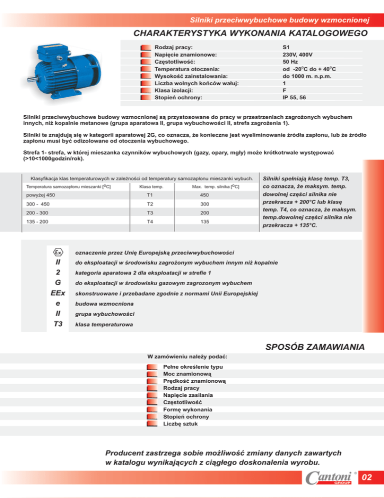 Silniki przeciwwybuchowe budowy wzmocnionej CHARAKTERYSTYKA WYKONANIA KATALOGOWEGO Rodzaj pracy: Napiêcie znamionowe: Czêstotliwoœæ: Temperatura otoczenia: Wysokoœæ zainstalowania: Liczba wolnych koñców wa³uj: Klasa izolacji: Stopieñ ochrony: S1 230V, 400V 50 Hz O O od -20 C do + 40 C do 1000 m. n.p.m. 1 F IP 55, 56 Silniki przeciwwybuchowe budowy wzmocnionej s¹ przystosowane do pracy w przestrzeniach zagro¿onych wybuchem innych, ni¿ kopalnie metanowe (grupa aparatowa II, grupa wybuchowoœci II, strefa zagro¿enia 1). Silniki te znajduj¹ siê w kategorii aparatowej 2G, co oznacza, ¿e konieczne jest wyeliminowanie Ÿród³a zap³onu, lub ¿e Ÿród³o zap³onu musi byæ odizolowane od otoczenia wybuchowego. Strefa 1- strefa, w której mieszanka czynników wybuchowych (gazy, opary, mg³y) mo¿e krótkotrwale wystêpowaæ (>10<1000godzin/rok). Klasyfikacja klas temperaturowych w zale¿noœci od temperatury samozap³onu mieszanki wybuch. Temperatura samozap³onu mieszanki [oC] Klasa temp. Max. temp. silnika [oC] powy¿ej 450 T1 450 300 - 450 T2 300 200 - 300 T3 200 135 - 200 T4 135 Silniki spe³niaj¹ klasê temp. T3, co oznacza, ¿e maksym. temp. dowolnej czêœci silnika nie przekracza + 200°C lub klasê temp. T4, co oznacza, ¿e maksym. temp.dowolnej czêœci silnika nie przekracza + 135°C. oznaczenie przez Uniê Europejsk¹ przeciwwybuchowoœci II 2 G EEx e II T3 do eksploatacji w œrodowisku zagro¿onym wybuchem innym ni¿ kopalnie kategoria aparatowa 2 dla eksploatacji w strefie 1 do eksploatacji w œrodowisku gazowym zagrozonym wybuchem skonstruowane i przebadane zgodnie z normami Unii Europejskiej budowa wzmocniona grupa wybuchowoœci klasa temperaturowa SPOSÓB ZAMAWIANIA W zamówieniu nale¿y podaæ: Pe³ne okreœlenie typu Moc znamionow¹ Prêdkoœæ znamionow¹ Rodzaj pracy Napiêcie zasilania Czêstotliwoœæ Formê wykonania Stopieñ ochrony Liczbê sztuk Producent zastrzega sobie mo¿liwoœæ zmiany danych zawartych w katalogu wynikaj¹cych z ci¹g³ego doskonalenia wyrobu. 02 Silniki przeciwwybuchowe budowy wzmocnionej £O¯YSKA, STOPIEÑ OCHRONY OPIS TECHNICZNY W silnikach EExe zastosowano dodatkowe œrodki zwiêkszaj¹ce bezpieczeñstwo wobec mo¿liwoœci powstania nadmiernej temperatury oraz wystêpowania ³uków i iskier na wewnêtrznych i zewnêtrznych czêœciach silnika. S¹ to specjalna tabliczka zaciskowa, skrzynka zaciskowa zapewniaj¹ca odpowiednie odstêpy izolacyjne, certyfikowany wpust kablowy, dwa zaciski uziemiaj¹ce, wzmocniony uk³ad izolacyjny itd.Elementy obudowy silników wykonane s¹ ze stopu aluminium o zawartoœci magnezu mniejszej lub równej 6% (oprócz os³ony przewietrznika, która wykonana jest z blachy stalowej). Zabezpieczenie przeci¹¿eniowe silnika musi posiadaæ charakterystykê pr¹dowoczasow¹ gwarantuj¹c¹, ¿e silnik zostanie od³¹czony od napiêcia zasilaj¹cego w czasie krótszym od okreœlonego dla niego czasu tE przy pr¹dzie równym pr¹dowi rozruchowemu silnika. Czas tE to czas, w którym uzwojenie pr¹du przemiennego podczas przep³ywu pr¹du rozruchowego Ir nagrzeje siê od temperatury osi¹ganej przy pracy znamionowej i przy maksymalnej temperaturze otoczenia do temperatury granicznej. Silnik £o¿yska Ochrona Sg 63 6202 2Z IP 56 Sh 71 6203 2Z IP 56 Sh 80 6204 2Z IP 56 Sh 90 6205 2Z IP 55 Sg 100 6206 2Z IP 55 Sg 112 6306 2Z IP 55 Sg 132 6308 2Z IP 55 Sg 160 6309 2Z IP 55 Sg 180 6311 2Z IP 55 Silniki mog¹ byæ wyposa¿one we wpust kablowy z mocownikiem (zabezpieczaj¹cym przewód zasilaj¹cy przed wyrwaniem). Silniki wyposa¿one w specjaln¹ os³onê przewietrznika mog¹ pracowaæ pionowo z czopem napêdowym skierowanym w dó³, w warunkach okreœlonych w Instrukcji Techniczno-Ruchowej. NORMY Ka¿dy silnik wykonany jest zgodnie z wymaganiami Dyrektywy ATEX 94/9/EC oraz posiada zaœwiadczenie wydane przez holendersk¹ organizacjê KEMA b.v. potwierdzaj¹ce zgodnoœæ wykonania z tymi wymaganiami. Silniki wykonane s¹ zgodnie z normami: Wymagania elektryczne Wymagania Mechaniczne IEC 600 34-1 IEC 600 34-5 IEC 600 34-6 IEC 600 34-9 IEC 600 34-5 IEC 600 34-6 IEC 600 34-7 IEC 600 34-14 IEC 600 72-1 Ponadto silniki spe³niaj¹ wymagania norm EN 50014, EN-50019 oraz EN-13980 Wyroby spe³niaj¹ wymagania dotycz¹ce kompatybilnoœci elektromagnetycznej w zakresie emisyjnoœci jak i odpornoœci ujête w normach: EN 50081-1, EN 50081-2, EN 50082-1, EN 50082-2. Typ Sg63.- KEMA 03 ATEX2176 dla klasy temp. T3 KEMA 03 ATEX2177 dla klasy temp. T4 Typ Sh71.- KEMA 03 ATEX2178 dla klasy temp. T3 KEMA 03 ATEX2179 dla klasy temp. T4 Typ Sh80.- KEMA 03 ATEX2180 dla klasy temp. T3 KEMA 03 ATEX2181 dla klasy temp. T4 Typ Sh90.- KEMA 02 ATEX2136 dla klasy temp. T3 KEMA 02 ATEX2137 dla klasy temp. T4 Typ Sg100.- KEMA 02 ATEX2138 dla klasy temp. T3 KEMA 02 ATEX2139 dla klasy temp. T4 Typ Sg112.- KEMA 02 ATEX2140 dla klasy temp. T3 KEMA 02 ATEX2141 dla klasy temp. T4 Typ Sg132.- KEMA 02 ATEX2142 dla klasy temp. T3 KEMA 02 ATEX2143 dla klasy temp. T4 Typ Sg160.- KEMA 02 ATEX2144 dla klasy temp. T3 KEMA 02 ATEX2145 dla klasy temp. T4 Typ Sg 180.- KEMA 02 ATEX2146 dla klasy temp. T3 KEMA 02 ATEX2147 dla klasy temp. T4 Wszystkie silniki s¹ produkowane w Systemie Zapewnienia Jakoœci ISO 9001. Silniki objête niniejszym katalogiem odpowiadaj¹ przepisom oraz normom obowi¹zuj¹cym w innych krajach zgodnym z normami. Wszystkie silniki opisane w tym katalogu posiadaj¹ znak CE. Oznacza to, ¿e nasze wyroby s¹ zgodne z dyrektywami Unii Europejskiej w zakresie bezpieczeñstwa. 03 Silniki przeciwwybuchowe budowy wzmocnionej Silniki budowy zamkniêtej IP55,56 Klasa izolacji F 1. 2. 3. 4. 5. 6. 7. 8. 9. 10. 11. 12. 13. 14. 15. 16. 17. 18. 19. 20. 21. 22. 23. 24. 25. 26. 27. 28. 29. 30. ExSg63-2A-T3 ExSg63-2A-T4 ExSg63-2B-T3 ExSg63-2B-T4 ExSh71-2A-T3 ExSh71-2A-T4 ExSh71-2B-T3 ExSh71-2B-T4 ExSh80-2A-T3 ExSh80-2A-T4 ExSh80-2B-T3 Sh90S-2-T3 Sh90S-2-T4 Sh90L-2-T3 Sh90L-2-T4 Sg100L-2-T3 Sg100L-2-T4 Sg112M-2-T3 Sg112M-2-T4 Sg132S-2A-T3 Sg132S-2A-T4 Sg132