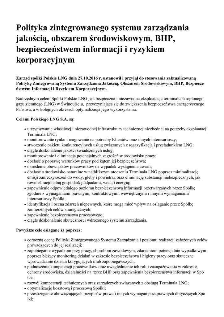 Polityka zintegrowanego systemu zarządzania jakością, obszarem środowiskowym, BHP, bezpieczeństwem informacji i ryzykiem korporacyjnym Zarząd spółki Polskie LNG dnia 27.10.2016 r. ustanowił i przyjął do stosowania zaktualizowaną Politykę Zintegrowaną Systemu Zarządzania Jakością, Obszarem Środowiskowym, BHP, Bezpiecze ństwem Informacji i Ryzykiem Korporacyjnym. Nadrzędnym celem Spółki Polskie LNG jest bezpieczna i niezawodna eksploatacja terminalu skroplonego gazu ziemnego (LNG) w Świnoujściu, przyczyniająca się do zwiększenia bezpieczeństwa energetycznego Państwa, a w kolejnych okresach optymalizacja jego wykorzystania. Celami Polskiego LNG S.A. są: utrzymywanie właściwej i niezawodnej infrastruktury technicznej niezbędnej na potrzeby eksploatacji Terminala LNG; monitorowanie rynku i reagowanie na potrzeby Klientów oraz innych interesariuszy; stworzenie pakietu konkurencyjnych usług związanych z regazyfikacją i przeładunkiem LNG; ciągłe doskonalenie jakości świadczonych usług; monitorowanie i eliminacja potencjalnych zagrożeń w środowisku pracy; dbałość o poprawę warunków pracy pod kątem jej bezpieczeństwa; określenie obowiązków pracowników na wypadek wystąpienia awarii; dbałość o środowisko naturalne w najbliższym otoczeniu Terminala LNG poprzez minimalizację emisji zanieczyszczeń do wody, gleby i powietrza oraz eliminację substancji niebezpiecznych, jak również racjonalną gospodarkę odpadami, wodą i energią; zapewnienie odpowiedniego poziomu bezpieczeństwa informacji przetwarzanych przez Spółkę zgodnie z wymaganiami prawnymi, kontraktowymi, wewnętrznymi i innymi wymaganiami interesariuszy Spółki; identyfikacja i ocena zdarzeń niepewnych, które mogą mieć wpływ na osiąganie przez Spółkę zamierzonych celów strategicznych; zapewnienie bezpieczeństwa procesowego; ciągłe doskonalenie skuteczności wdrożonego systemu zarządzania. Powyższe cele osiągane są poprzez: coroczną ocenę Polityki Zintegrowanego Systemu Zarządzania i poziomu realizacji założonych celów prowadzących do jej realizacji; zapobieganie wypadkom przy pracy, chorobom zawodowym, zdarzeniom potencjalnie wypadkowym poprzez bieżący monitoring działań w zakresie bezpieczeństwa i higieny pracy oraz skuteczne wprowadzanie działań korygujących i/lub zapobiegawczych; podnoszenie kompetencji pracowników oraz uwzględnianie ich roli i zaangażowania w zakresie ochrony środowiska, działalności na rzecz BHP oraz zapewnienia bezpieczeństwa informacji w Spó łce; rozwój kompetencji technicznych oraz zarządczych związanych z obsługą Terminala LNG; optymalizację kosztową i procesową Spółki; przestrzeganie obowiązujących przepisów prawa i innych wymagań pozaprawnych dotyczących Spó łki; stosowanie przejrzystych zasad postępowania opisanych w regulaminach, procedurach i instrukcjach wspomaganych narzędziami teleinformatycznymi; zachowanie poufności, integralności i dostępności informacji przetwarzanych przez Spółkę zgodnie z wymaganiami prawnymi, umownymi i innymi wymaganiami interesariuszy Spółki; zarządzanie ryzykiem bezpieczeństwa informacji poprzez szacowanie ryzyka bezpieczeństwa informacji oraz podejmowanie adekwatnych działań minimalizujących zidentyfikowane ryzyka; wsparcie Zarządu i Pracowników Spółki w uzyskaniu kompleksowej informacji odnośnie ryzyk wyst ępujących w działalności operacyjnej i dostarczanie narzędzi umożliwiających ocenę i priorytetyzację ryzyk; ustanawianie procesu, który zapewnia kompleksowe podejście do monitorowania szans oraz zagrożeń dla Spółki, jak również pomaga w ustalaniu optymalnego sposobu reakcji na zidentyfikowane szanse i zagrożenia; wsparcie w podejmowaniu decyzji biznesowych, które przyczyniają się do maksymalizacji wartości Polskiego LNG S.A.; prowadzenie ciągłej identyfikacji i analizy ryzyka procesowego oraz przyjmowanie i obsługa strategii dla zidentyfikowanych ryzyk procesowych; ciągłe doskonalenie Zintegrowanego Systemu Zarządzania w celu poprawy jego skuteczności i osi ąganych efektów. Zarząd Spółki deklaruje pełne zaangażowanie w prace nad utrzymaniem i ciągłym doskonaleniem skuteczności funkcjonującego ZSZ oraz potwierdza, że przyjęta w tym zakresie Polityka została uzgodniona, zakomunikowana i udostępniona wszystkim Pracownikom Spółki, jest również dostępna publicznie. Jednocześnie Zarząd deklaruje zapewnienie niezbędnych środków realizacji przyjętej Polityki. Treść podlega okresowej analizie i aktualizacjom.