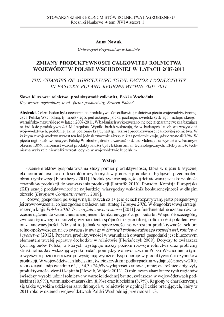 158 STOWARZYSZENIE EKONOMISTÓW ROLNICTWA I AGROBIZNESU Anna Nowak Roczniki Naukowe ● tom XVI ● zeszyt 1 Anna Nowak Uniwersytet Przyrodniczy w Lublinie ZMIANY PRODUKTYWNOŚCI CAŁKOWITEJ ROLNICTWA WOJEWÓDZTW POLSKI WSCHODNIEJ W LATACH 2007-2011 THE CHANGES OF AGRICULTURE TOTAL FACTOR PRODUCTIVITY IN EASTERN POLAND REGIONS WITHIN 2007-2011 Słowa kluczowe: rolnictwo, produktywność całkowita, Polska Wschodnia Key words: agriculture, total factor productivity, Eastern Poland Abstrakt. Celem badań była ocena zmian produktywności całkowitej rolnictwa pięciu województw tworzących Polskę Wschodnią, tj. lubelskiego, podlaskiego, podkarpackiego, świętokrzyskiego, małopolskiego i warmińsko-mazurskiego w latach 2007-2011. W badaniach wykorzystano metodę nieparametryczną bazującą na indeksie produktywności Malmquista. Wyniki badań wskazują, że w badanych latach we wszystkich województwach, podobnie jak na poziomie kraju, nastąpił wzrost produktywności całkowitej rolnictwa. W każdym z województw wzrost ten był jednak znacznie niższy niż na poziomie kraju, gdzie wynosił 38%. W pięciu regionach tworzących Polskę Wschodnią średnia wartość indeksu Malmquista wynosiła w badanym okresie 1,099, natomiast wzrost produktywności był efektem zmian technologicznych. Efektywność techniczna wykazała niewielki wzrost jedynie w województwie lubelskim. Wstęp Ocenie efektów gospodarowania służy pomiar produktywności, która w ujęciu klasycznej ekonomii odnosi się do ilości dóbr uzyskanych w procesie produkcji i będących przedmiotem obrotu rynkowego [Floriańczyk 2011]. Produktywność najczęściej definiowana jest jako zdolność czynników produkcji do wytwarzania produkcji [Latruffe 2010]. Ponadto, Komisja Europejska (KE) uznaje produktywność za najbardziej wiarygodny wskaźnik konkurencyjności w długim okresie [European Competitiveness... 2009]. Rozwój gospodarki polskiej w najbliższych dziesięcioleciach rozpatrywany jest z perspektywy jej zrównoważenia, co jest zgodne z założeniami strategii Europa 2020. W długookresowej strategii rozwoju kraju Polska 2030. Trzecia fala nowoczesności [2011] za fundamentalne uznano równoczesne dążenie do wzmocnienia spójności i konkurencyjności gospodarki. W sposób szczególny zwraca się uwagę na potrzebę wzmocnienia spójności terytorialnej, solidarności pokoleniowej oraz innowacyjności. Nie stoi to jednak w sprzeczności ze wzrostem produktywności sektora rolno-spożywczego, na co zwraca się uwagę w Strategii zrównoważonego rozwoju wsi, rolnictwa i rybactwa [2012]. Poprawa produktywności w warunkach otwartej gospodarki jest kluczowym elementem trwałej poprawy dochodów w rolnictwie [Floriańczyk 2008]. Dotyczy to zwłaszcza tych regionów Polski, w których występuje niższy poziom rozwoju rolnictwa oraz problemy strukturalne. Jak wskazują wyniki badań, pomiędzy województwami Polski Wschodniej a tymi o wyższym poziomie rozwoju, występują wyraźne dysproporcje w produktywności czynników produkcji. W województwach lubelskim, świętokrzyskim i podkarpackim wydajność pracy w 2010 roku osiągała odpowiednio 62,1, 54,3 i 24,6% wydajności krajowej, mniejsze różnice dotyczyły produktywności ziemi i kapitału [Nowak, Wójcik 2013]. O rolniczym charakterze tych regionów świadczy wysoki udział rolnictwa w wartości dodanej brutto, zwłaszcza w województwach podlaskim (10,9%), warmińsko-mazurskim (8,9%) oraz lubelskim (8,7%). Regiony te charakteryzują się także wysokim udziałem zatrudnionych w rolnictwie w ogólnej liczbie pracujących, który w 2011 roku w czterech województwach Polski Wschodniej przekraczał 1/3. Zmiany produktywności całkowitej rolnictwa województw Polski Wschodniej w latach 2007-2011 159 Produktywność może być mierzona przy pomocy wskaźników cząstkowych odnoszących się do poszczególnych czynników wytwórczych lub jako produktywność całkowita. Miary cząstkowe są przydatne, ale ich wadą są oczywiste ograniczenia w porównaniu do miar całościowych [Headey i in. 2010]. Bardziej kompleksowym podejściem do problemu produktywności w rolnictwie charakteryzują się metody opierające się na produktywności całkowitej TFP (Total Factor Productivity), które obrazują stosunek sumy efektów do sumy nakładów. Do pomiaru zmian produktywności w czasie wykorzystuje się m.in. wskaźnik Malmquista, bazujący na funkcji maksymalizacji produkcji [Trueblood, Coggins 2003]. Badania zmian produktywności całkowitej w rolnictwie Polski bądź w odniesieniu do krajów Unii Europejskiej (UE) z wykorzystaniem indeksu Malmquista prowadzone były przez wielu autorów [Floriańczyk 2008, Latruffe i in. 2008, Floriańczyk, Rembisz 2012], rzadziej badano zmiany produktywności całkowitej rolnictwa w poszczególnych regionach kraju. Analizę taką dla poszczególnych województw Polski dla lat 1998-2006 przeprowadzili Rusielik i Świtłyk [2009]. Materiał i metodyka badań Celem badań była ocena zmian w produktywności całkowitej rolnictwa województw Polski Wschodniej, tj. lubelskiego, podlaskiego, podkarpackiego, świętokrzyskiego, małopolskiego i warmińsko-mazurskiego w latach 2007-2011. Do zbadania zmian wykorzystano metodę nieparametryczną bazującą na indeksie produktywności Malmquista. Metoda ta nie narzuca tworzenia funkcjonalnych zależności w funkcji produkcji, które są potrzebne przy zastosowaniu klasycznego podejścia parametrycznego [Rusielik, Świtłyk 2009]. Do obliczenia indeksów Malmquista wykorzystuje się różne metody pomiaru funkcji odległości, w badaniach wykorzystano jedną z najbardziej popularnych, bazujących na metodzie DEA zaproponowanej przez Färe i współautorów [1995]. Metoda ta jest narzędziem wykorzystywanym do wyznaczania względnej efektywności obiektów, określanych jako DMU (Decision Making Unit). Wskaźnik Malmquista rozróżnia dwa źródła wzrostu produktywności – zmiany w ef