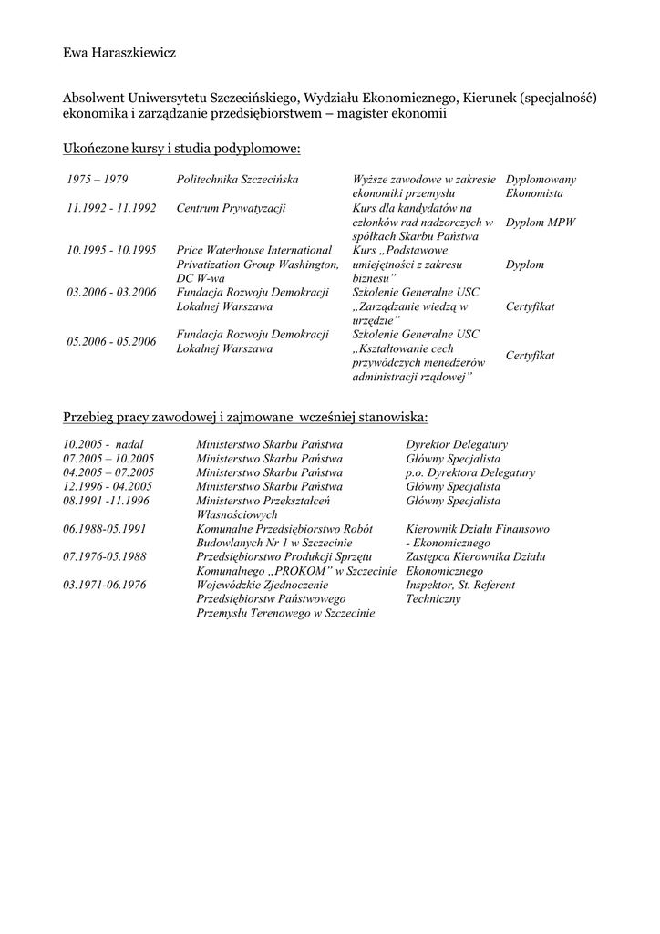 Ewa Haraszkiewicz Absolwent Uniwersytetu Szczecińskiego, Wydziału Ekonomicznego, Kierunek (specjalność) ekonomika i zarządzanie przedsiębiorstwem – magister ekonomii Ukończone kursy i studia podyplomowe: 1975 – 1979 Politechnika Szczecińska 11.1992 - 11.1992 Centrum Prywatyzacji 10.1995 - 10.1995 03.2006 - 03.2006 05.2006 - 05.2006 Price Waterhouse International Privatization Group Washington, DC W-wa Fundacja Rozwoju Demokracji Lokalnej Warszawa Fundacja Rozwoju Demokracji Lokalnej Warszawa Wyższe zawodowe w zakresie ekonomiki przemysłu Kurs dla kandydatów na członków rad nadzorczych w spółkach Skarbu Państwa Kurs „Podstawowe umiejętności z zakresu biznesu” Szkolenie Generalne USC „Zarządzanie wiedzą w urzędzie” Szkolenie Generalne USC „Kształtowanie cech przywódczych menedżerów administracji rządowej” Dyplomowany Ekonomista Dyplom MPW Dyplom Certyfikat Certyfikat Przebieg pracy zawodowej i zajmowane wcześniej stanowiska: 10.2005 - nadal 07.2005 – 10.2005 04.2005 – 07.2005 12.1996 - 04.2005 08.1991 -11.1996 06.1988-05.1991 07.1976-05.1988 03.1971-06.1976 Ministerstwo Skarbu Państwa Ministerstwo Skarbu Państwa Ministerstwo Skarbu Państwa Ministerstwo Skarbu Państwa Ministerstwo Przekształceń Własnościowych Komunalne Przedsiębiorstwo Robót Budowlanych Nr 1 w Szczecinie Przedsiębiorstwo Produkcji Sprzętu Komunalnego „PROKOM” w Szczecinie Wojewódzkie Zjednoczenie Przedsiębiorstw Państwowego Przemysłu Terenowego w Szczecinie Dyrektor Delegatury Główny Specjalista p.o. Dyrektora Delegatury Główny Specjalista Główny Specjalista Kierownik Działu Finansowo - Ekonomicznego Zastępca Kierownika Działu Ekonomicznego Inspektor, St. Referent Techniczny