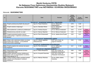 Wyniki Konkursu PZITB Na Najlepsze Prace Dyplomowe Absolwentów Studiów Wyższych Kierunku BUDOWNICTWO oraz INŻYNIERIA I OCHRONA ŚRODOWISKO Kierunek: BUDOWNICTWO Lp Tytuł Autor Promotor Punkty przyznane przez Komisję Konkursową (max. 10 pkt) Punkty ostateczne 8,78 8,39 8,28 7,64 9,43 9,715 FINAŁ Specjalność: konstrukcje budowlane i inżynierskie 1 „Projekt podwieszonej kładki dla pieszych” mgr inż. Paweł Okołowicz 2 „Projekt wiaduktu kolejowego” mgr inż. Stanisław Rećko 3 „Hala wystawowa o przekryciu powłokowym” mgr inż. Andrzej Szupica Dr inż. Aleksander Wawrusiewicz Dr inż. Aleksander Wawrusiewicz Dr inż. Mariusz Gnatowski 4 „Wielokomorowy zbiornik na wodę” mgr inż. Dariusz Stasiński Dr inż. Mariusz Gnatowski 9,46 9,73 5 „Projekt konstrukcji budynku dworca autobusowego z częściowo przeszklonym dachem” mgr inż. Piotr Chrzanowski Dr inż. Jolanta Anna Prusiel 9,32 9,41 6 „Wpływ cyklu wykonania obiektu na wzrost kosztów jego realizacji – na przykładzie budownictwa szpitalnego” mgr inż. Jolanta Jagielska Aleksandrowicz 9,32 9,16 Praca wyróżniona 7 „Projekt przejścia dla zwierząt nad pasem drogowym” mgr inż. Piotr Dobrzyński 9,21 9,105 Praca wyróżniona 8 „Wspomaganie komputerowe procesu projektowania dróg” „Analiza celowości budowy dodatkowych pasów ruchu na wyprzedzanie na odcinku drogi-krajowej Nr 19” „Analiza korelacji między wynikami kontroli nasypów komunikacyjnych metodami pośrednimi” mgr inż. Marek Motylewicz Prof. nzw. dr hab. inż. Władysław Gardziejczyk Prof. nzw. dr hab. inż. Władysław Gardziejczyk 9,64 9,82 Praca nagrodzona 9,64 9,82 Praca nagrodzona Dr nzw. Maria Jolanta Sulewska 8,21 7,86 Praca nagrodzona Praca nagrodzona Praca wyróżniona Specjalność: budownictwo ogólne Prof. nzw. dr hab. inż. Zygmunt Orłowski Specjalność: budownictwo komunikacyjne Dr inż. Aleksander Wawrusiewicz Specjalność: inżynieria drogowa 9 10 mgr inż. Krzysztof Szamreta mgr inż. Mariusz Wachuta