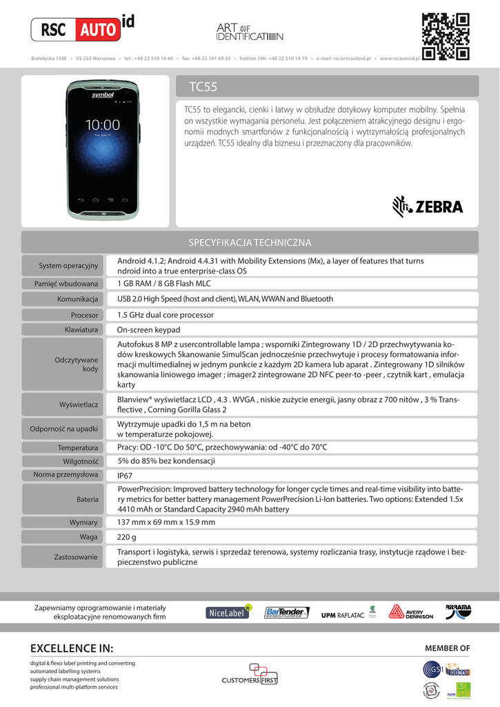 Białołęcka 158E • 03-253 Warszawa • tel.: +48 22 510 14 40 • fax: +48 22 741 69 33 • hotline 24h: +48 22 510 14 79 • e-mail: [email protected] • www.rscautoid.pl TC55 TC55 to elegancki, cienki i łatwy w obsłudze dotykowy komputer mobilny. Spełnia on wszystkie wymagania personelu. Jest połączeniem atrakcyjnego designu i ergonomii modnych smartfonów z funkcjonalnością i wytrzymałością profesjonalnych urządzeń. TC55 idealny dla biznesu i przeznaczony dla pracowników. SPECYFIKACJA TECHNICZNA System operacyjny Pamięć wbudowana Komunikacja Procesor Klawiatura Odczytywane kody Wyświetlacz Odporność na upadki Temperatura Wilgotność Norma przemysłowa Bateria Wymiary Waga Zastosowanie Android 4.1.2; Android 4.4.31 with Mobility Extensions (Mx), a layer of features that turns ndroid into a true enterprise-class OS 1 GB RAM / 8 GB Flash MLC USB 2.0 High Speed (host and client), WLAN, WWAN and Bluetooth 1.5 GHz dual core processor On-screen keypad Autofokus 8 MP z usercontrollable lampa ; wsporniki Zintegrowany 1D / 2D przechwytywania kodów kreskowych Skanowanie SimulScan jednocześnie przechwytuje i procesy formatowania informacji multimedialnej w jednym punkcie z każdym 2D kamera lub aparat . Zintegrowany 1D silników skanowania liniowego imager ; imager2 zintegrowane 2D NFC peer-to -peer , czytnik kart , emulacja karty Blanview® wyświetlacz LCD , 4.3 . WVGA , niskie zużycie energii, jasny obraz z 700 nitów , 3 % Transflective , Corning Gorilla Glass 2 Wytrzymuje upadki do 1,5 m na beton w temperaturze pokojowej. Pracy: OD -10°C Do 50°C, przechowywania: od -40°C do 70°C 5% do 85% bez kondensacji IP67 PowerPrecision: Improved battery technology for longer cycle times and real-time visibility into battery metrics for better battery management PowerPrecision Li-Ion batteries. Two options: Extended 1.5x 4410 mAh or Standard Capacity 2940 mAh battery 137 mm x 69 mm x 15.9 mm 220 g Transport i logistyka, serwis i sprzedaż terenowa, systemy rozliczania trasy, instytucje rządowe i bezpieczenstwo publiczne Zapewniamy oprogramowanie i materiały eksploatacyjne renomowanych firm EXCELLENCE IN: digital & flexo label printing and converting automated labelling systems supply chain management solutions professional multi-platform services MEMBER OF
