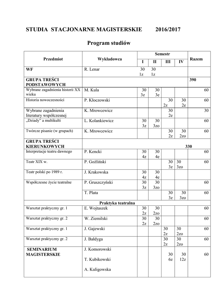 STUDIA STACJONARNE MAGISTERSKIE 2016/2017 Program studiów Przedmiot WF Wykładowca R. Lenar GRUPA TREŚCI PODSTAWOWYCH Semestr I II 30 1z 30 1z III Razem IV 390 Wybrane zagadnienia historii XX M. Kula wieku Historia nowoczesności P. Kłoczowski 30 3z 30 3e 60 30 2z Wybrane zagadnienia literatury współczesnej K. Mrowcewicz „Dziady” a multikulti L. Kolankiewicz Twórcze pisanie (w grupach) K. Mrowcewicz 30 2e 30 2e 30 3z 60 30 30 3zo 60 30 2z GRUPA TREŚCI KIERUNKOWYCH 30 2zo 60 330 Interpretacje teatru dawnego P. Kencki Teatr XIX w. P. Goźliński Teatr polski po 1989 r. J. Krakowska Współczesne życie teatralne P. Gruszczyński 30 4z 30 4e 60 30 30 3z 3zo 30 4z 30 3z 30 4e 30 3zo 60 T. Plata Warsztat praktyczny gr. 1 Praktyka teatralna E. Wojtaszek Warsztat praktyczny gr. 2 W. Ziemilski Warsztat praktyczny gr. 1 J. Gajewski Warsztat praktyczny gr. 2 J. Bałdyga SEMINARIUM MAGISTERSKIE J. Komorowski T. Kubikowski A. Kuligowska 30 3z 30 2z 30 2z 60 30 3zo 30 2zo 30 2zo 60 60 60 30 2z 30 2z 30 2zo 30 2zo 30 6z 30 12z 60 60 60 Fakultety Warsztat radiowy M. Jethon Krytyka w XX-leciu J. Opalińska Polityczne estetyki teatru W. Szczawińska Metafora w teatrze J. Opalińska Sztuka współczesna E. Toniak Witkacy B. Michalski ECTS 30 2zo 30 2zo 30 30 30 2zo 30 2zo 22 22 30 30 30 2zo 30 2zo 22 Studentów obowiązuje zaliczenie jednego fakultetu w trakcie semestru. 30 30 24 SPECJALNOŚCI Wykładowca Przedmiot Semestr I II III 30 2z 30 2zo Razem IV I. SPECJALNOŚĆ KRYTYKA – HISTORIA – PERFORMATYKA II. SPECJALNOŚĆ PERFORMATYCZNOTEATRALNA oraz DRAMATURGICZNOMEDIALNA Performens – seminarium T. Kubikowski Historia sztuki performans E. Toniak Performans w życiu publicznym D. Kosiński Performans międzykulturowy M. Lis Performans płci A. Adamiecka Kanon krytyki J. Majcherek Warsztat dramaturga P. Gruszczyński Warsztat krytyka Ł. Drewniak Warsztat redaktora J. Krakowska ECTS RAZEM 60 30 2zo 30 30 2z 30 2zo 60 30 2zo 30 30 2zo 30 30 2z 2zo 30 60 30 2zo 30 2zo 30 30 2z 2zo 60 60 30 2z 30 2zo 8 8 8 6 30 30 30 30 60 SPECJALNOŚCI Przedmiot SPECJALNOŚĆ: ANIMACJA – ORGANIZACJA – PRODUKCJA Wykładowca Semestr I II K. Torończyk Zarządzanie instytucjami 2 K. Ochab Organizacja życia teatralnego P. Płoski Polityka kulturalna K. Lewandowska NGO A. Gałązka Pedagogika teatralna A. Rochowska 30 2z 30 2zo Razem 60 30 30 2z 2zo 30 2z 30 2z 30 2zo 30 2zo 30 2zo 60 30 30 30 2zo 30 2zo 30 2zo Finanse i księgowość Budowanie publiczności PR i marketing 30 30 30 30 2zo 30 2zo Współpraca międzynarodowa 8 30 60 60 30 2zo Elementy prawa RAZEM IV Od 2017/2018 Zarządzanie instytucjami 1 ECTS III 8 30 8 6 30 30 30 30