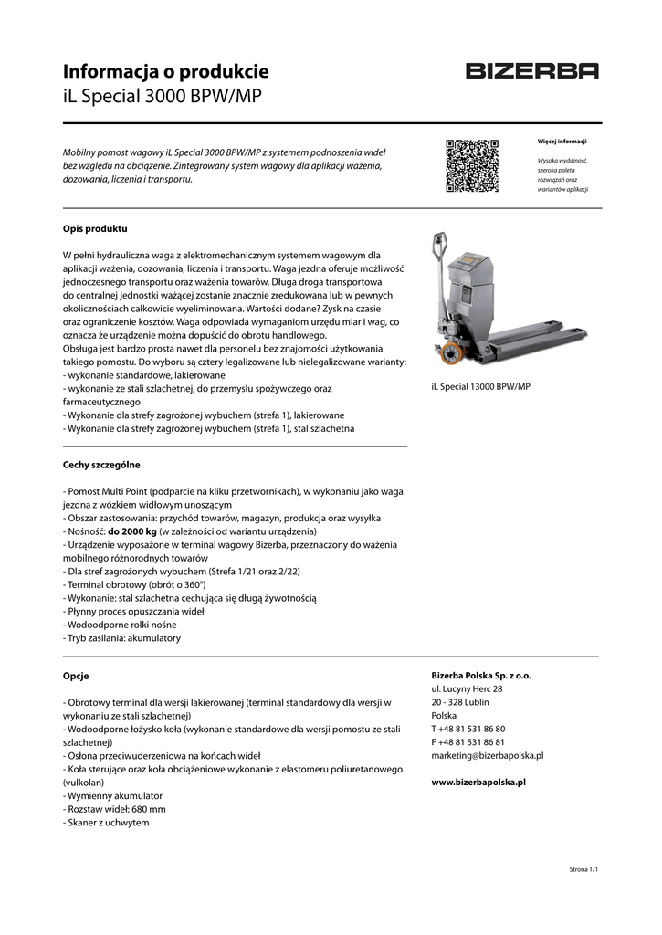 Informacja o produkcie iL Special 3000 BPW/MP Więcej informacji Mobilny pomost wagowy iL Special 3000 BPW/MP z systemem podnoszenia wideł bez względu na obciążenie. Zintegrowany system wagowy dla aplikacji ważenia, dozowania, liczenia i transportu. Wysoka wydajność, szeroka paleta rozwiązań oraz wariantów aplikacji Opis produktu W pełni hydrauliczna waga z elektromechanicznym systemem wagowym dla aplikacji ważenia, dozowania, liczenia i transportu. Waga jezdna oferuje możliwość jednoczesnego transportu oraz ważenia towarów. Długa droga transportowa do centralnej jednostki ważącej zostanie znacznie zredukowana lub w pewnych okolicznościach całkowicie wyeliminowana. Wartości dodane? Zysk na czasie oraz ograniczenie kosztów. Waga odpowiada wymaganiom urzędu miar i wag, co oznacza że urządzenie można dopuścić do obrotu handlowego. Obsługa jest bardzo prosta nawet dla personelu bez znajomości użytkowania takiego pomostu. Do wyboru są cztery legalizowane lub nielegalizowane warianty: - wykonanie standardowe, lakierowane - wykonanie ze stali szlachetnej, do przemysłu spożywczego oraz farmaceutycznego - Wykonanie dla strefy zagrożonej wybuchem (strefa 1), lakierowane - Wykonanie dla strefy zagrożonej wybuchem (strefa 1), stal szlachetna iL Special 13000 BPW/MP Cechy szczególne - Pomost Multi Point (podparcie na kliku przetwornikach), w wykonaniu jako waga jezdna z wózkiem widłowym unoszącym - Obszar zastosowania: przychód towarów, magazyn, produkcja oraz wysyłka - Nośność: do 2000 kg (w zależności od wariantu urządzenia) - Urządzenie wyposażone w terminal wagowy Bizerba, przeznaczony do ważenia mobilnego różnorodnych towarów - Dla stref zagrożonych wybuchem (Strefa 1/21 oraz 2/22) - Terminal obrotowy (obrót o 360°) - Wykonanie: stal szlachetna cechująca się długą żywotnością - Płynny proces opuszczania wideł - Wodoodporne rolki nośne - Tryb zasilania: akumulatory Opcje - Obrotowy terminal dla wersji lakierowanej (terminal standardowy dla wersji w wykonaniu ze stali szlachetnej) - Wodoodporne łożysko koła (wykonanie standardowe dla wersji pomostu ze stali szlachetnej) - Osłona przeciwuderzeniowa na końcach wideł - Koła sterujące oraz koła obciążeniowe wykonanie z elastomeru poliuretanowego (vulkolan) - Wymienny akumulator - Rozstaw wideł: 680 mm - Skaner z uchwytem Bizerba Polska Sp. z o.o. ul. Lucyny Herc 28 20 - 328 Lublin Polska T +48 81 531 86 80 F +48 81 531 86 81 [email protected] www.bizerbapolska.pl Strona 1/1