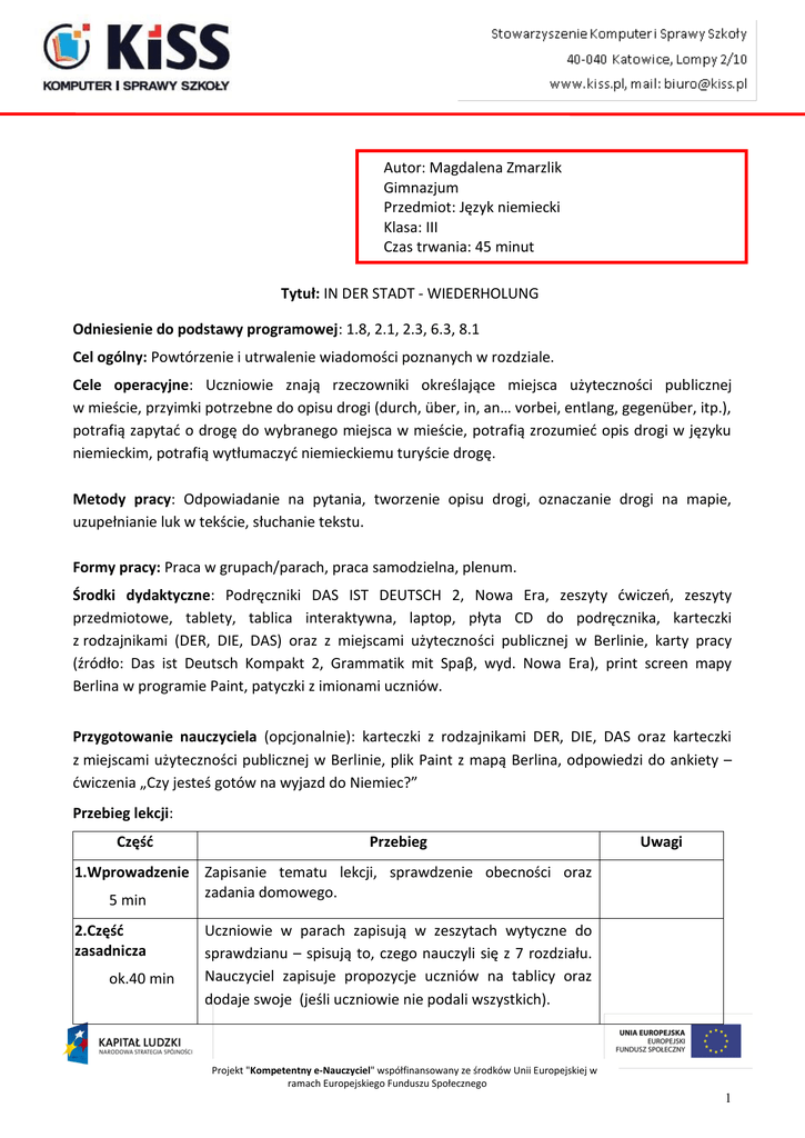 Autor: Magdalena Zmarzlik Gimnazjum Przedmiot: Język niemiecki Klasa: III Czas trwania: 45 minut Tytuł: IN DER STADT - WIEDERHOLUNG Odniesienie do podstawy programowej: 1.8, 2.1, 2.3, 6.3, 8.1 Cel ogólny: Powtórzenie i utrwalenie wiadomości poznanych w rozdziale. Cele operacyjne: Uczniowie znają rzeczowniki określające miejsca użyteczności publicznej w mieście, przyimki potrzebne do opisu drogi (durch, über, in, an… vorbei, entlang, gegenüber, itp.), potrafią zapytać o drogę do wybranego miejsca w mieście, potrafią zrozumieć opis drogi w języku niemieckim, potrafią wytłumaczyć niemieckiemu turyście drogę. Metody pracy: Odpowiadanie na pytania, tworzenie opisu drogi, oznaczanie drogi na mapie, uzupełnianie luk w tekście, słuchanie tekstu. Formy pracy: Praca w grupach/parach, praca samodzielna, plenum. Środki dydaktyczne: Podręczniki DAS IST DEUTSCH 2, Nowa Era, zeszyty ćwiczeń, zeszyty przedmiotowe, tablety, tablica interaktywna, laptop, płyta CD do podręcznika, karteczki z rodzajnikami (DER, DIE, DAS) oraz z miejscami użyteczności publicznej w Berlinie, karty pracy (źródło: Das ist Deutsch Kompakt 2, Grammatik mit Spaβ, wyd. Nowa Era), print screen mapy Berlina w programie Paint, patyczki z imionami uczniów. Przygotowanie nauczyciela (opcjonalnie): karteczki z rodzajnikami DER, DIE, DAS oraz karteczki z miejscami użyteczności publicznej w Berlinie, plik Paint z mapą Berlina, odpowiedzi do ankiety – ćwiczenia „Czy jesteś gotów na wyjazd do Niemiec?” Przebieg lekcji: Część Przebieg Uwagi 1.Wprowadzenie Zapisanie tematu lekcji, sprawdzenie obecności oraz zadania domowego. 5 min 2.Część zasadnicza ok.40 min Uczniowie w parach zapisują w zeszytach wytyczne do sprawdzianu – spisują to, czego nauczyli się z 7 rozdziału. Nauczyciel zapisuje propozycje uczniów na tablicy oraz dodaje swoje (jeśli uczniowie nie podali wszystkich). Projekt "Kompetentny e-Nauczyciel" współfinansowany ze środków Unii Europejskiej w ramach Europejskiego Funduszu Społecznego 1 Przypomnienie słownictwa – nauczyciel wypowiada rzeczownik określający miejsce/budynek w mieście, uczniowie podnoszą karteczki z odpowiednim rodzajnikiem (der, die, das). Następnie uczniowie mówią nazwę jakiegoś budynku po polsku a wylosowani przez nich uczniowie podają jego niemiecką nazwę wraz z rodzajnikiem. Karteczki z rodzajnikami, patyczki z imionami uczniów Wykonanie dwóch ćwiczeń z kart pracy. Po wykonaniu ćwiczeń wylosowani uczniowie czytają kolejno rozwiązania. Za każde dobre rozwiązanie przyznają sobie 1 pkt. (max. 13 pkt). 5. Wykonanie dwóch ćwiczeń z podręcznika, strona 130, mających na celu sprawdzenie rozumienia tekstu słuchanego. Następnie wylosowani uczniowie odczytują rozwiązania, za każdą dobrą odpowiedź przyznają sobie 1 pkt (max. 9 pkt). Uczniowie podliczają punkty z obu zadań (łącznie max. 21 pkt.). Następnie nauczyciel odczytuje uczniom informację zwrotną, w jakim stopniu są gotowi na wyjazd do Niemiec. Karty pracy, odpowiedzi do ankiety – ćwiczenia „Czy jesteś gotów na wyjazd do Niemiec?”, laptop, płyta CD do podręcznika Nauczyciel dzieli uczniów na 4 grupy, wręcza każdej grupie tablety oraz karteczki z nazwą miejsca, do którego uczniowie muszą opisać drogę. Kiedy uczniowie wykonają opisy drogi, czytają je pozostałym grupom, które muszą narysować tę drogę w programie Paint oraz odgadnąć, do jakiego zabytku pozostałe grupy ich prowadziły. Chętni uczniowie rysują drogę na tablicy interaktywnej. Wygrywa grupa, która odgadła większość zabytków. Plik Paint z mapą Berlina, tablety, tablica interaktywna, karteczki z nazwami berlińskich zabytków. 3.Ewaluacja/pods Ocenienie aktywności umowanie domowego. uczniów, zadanie zadania ok. 5 min Załączniki: Odpowiedzi do ankiety – ćwiczenia „Czy jesteś gotów na wyjazd do Niemiec?” Plik Paint z print screenem mapy Berlina i zaznaczonymi zabytkami Adnotacja dotycząca praw autorskich Nie naruszyłam praw autorskich ani dóbr osobistych osób trzecich, udostępniam swoją pracę na zasadach uznania autorstwa lub uznania autorstwa na tych samych warunkach Projekt "Kompetentny e-Nauczyciel" współfinansowany ze środków Unii Europejskiej w ramach Europejskiego Funduszu Społecznego 2