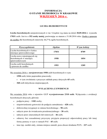 INFORMACJA O STANIE BEZROBOCIA W KRAKOWIE WRZESIEŃ 2016 r. LICZBA BEZROBOTNYCH Liczba bezrobotnych zarejestrowanych w tut. Urzędzie wg stanu na dzień 30.09.2016 r. wynosiła 17031 osób. Jest to o 352 osoby mniej, porównując ze stanem z 31.08.2016 roku. Osoby z prawem do zasiłku dla bezrobotnych stanowiły 11,7 % ogółu bezrobotnych. Wyszczególnienie Ogółem W tym kobiety Liczba bezrobotnych w końcu miesiąca sprawozdawczego 17031 8709 Liczba nowo rejestrujących się bezrobotnych w miesiącu sprawozdawczym 1958 1054 Liczba osób bezrobotnych z prawem do zasiłku 1993 1205 We wrześniu 2016 r. zarejestrowano 1958 osób bezrobotnych w tym: 1590 osób, które poprzednio pracowały; w tym zwolnienia z przyczyn zakładu pracy dotyczyło 65 osób; 368 osób dotychczas niepracujących. WYŁĄCZENIA Z EWIDENCJI We wrześniu 2016 roku z rejestrów GUP wyrejestrowano 2310 osób. Wyłączenia z ewidencji bezrobotnych dotyczyły głównie: podjęcia pracy – 1182 osoby; niepotwierdzenie gotowości do podjęcia zatrudnienia – 428 osób; dobrowolnej rezygnacji ze statusu bezrobotnego – 98 osób; nabycie praw do świadczenia przedemerytalnego – 38 osób; nabycie praw emerytalnych lub rentowych – 46 osób; odmowy bez uzasadnionej przyczyny przyjęcia propozycji odpowiedniej pracy lub innej formy pomocy w tym w ramach PAI – 45 osób; inne (np. zasiłek stały, zmiana miejsca zameld. poza obszar działania PUP) – 227 osób. OSOBY BĘDĄCE W SZCZEGÓLNEJ SYTUACJI NA RYNKU PRACY Stan na dzień 30.09.2016 r. 3457 Struktura w% 20,3 w tym do 25 roku życia 1264 7,4 Długotrwale bezrobotni 9568 56,2 Powyżej 50 roku życia 5683 33,4 0 0,0 1811 10,6 5 0,0 1399 8,2 Wyszczególnienie Do 30 roku życia Korzystające ze świadczeń z pomocy społecznej Posiadające co najmniej jedno dziecko do 6 roku życia Posiadające co najmniej jedno dziecko niepełnosprawne do 18 roku życia Niepełnosprawni AKTYWNE FORMY ZWALCZANIA BEZROBOCIA We wrześniu 2016 r. zaktywizowano w poszczególnych programach łącznie 325 osób bezrobotnych w tym: prace społecznie użyteczne – 33 osoby; staże – 149 osób; szkolenia – 58 osób; prace interwencyjne – 15 osób; roboty publiczne – 16 osób; podjęcia działalności gospodarczej – 44 osoby; podjęcia pracy w ramach refundacji kosztów zatrudnienia bezrobotnego – 10 osób. OFERTY PRACY We wrześniu 2016 r. do tut. Urzędu zgłoszono 2218 wolnych miejsc pracy, z czego 58 miejsc pracy dotyczyło ofert pracy dla osób niepełnosprawnych. Na ww. miejsca pracy oraz miejsca pracy pozostałe w dyspozycji Urzędu z poprzednich okresów sprawozdawczych skierowanych zostało na rozmowy kwalifikacyjne do pracodawców przez pośredników GUP 2423 kandydatów. Najwięcej zgłoszonych/pozyskanych wolnych miejsc pracy we wrześniu 2016 roku: Nazwa zawodu Liczba zgłoszonych wolnych miejsc pracy Sprzedawca 142 Pomocniczy robotnik budowlany 130 Kurier 92 Pakowacz ręczny 65 Pozostali pracownicy obsługi biurowej 57 Murarz 54 Kasjer handlowy 48 Malarz-tapeciarz 47 Pozostałe pomoce i sprzątaczki biurowe, hotelowe i podobne 47 Tynkarz 43 Pozostali pracownicy zajmujący się sprzątaniem gdzie indziej niesklasyfikowani 43 Pomoc kuchenna 42 Pozostali pracownicy usług osobistych gdzie indziej niesklasyfikowani 33 Kontroler jakości wyrobów przemysłowych 32 Zbrojarz 32 Pozostali pracownicy wykonujący prace proste gdzie indziej niesklasyfikowani 31