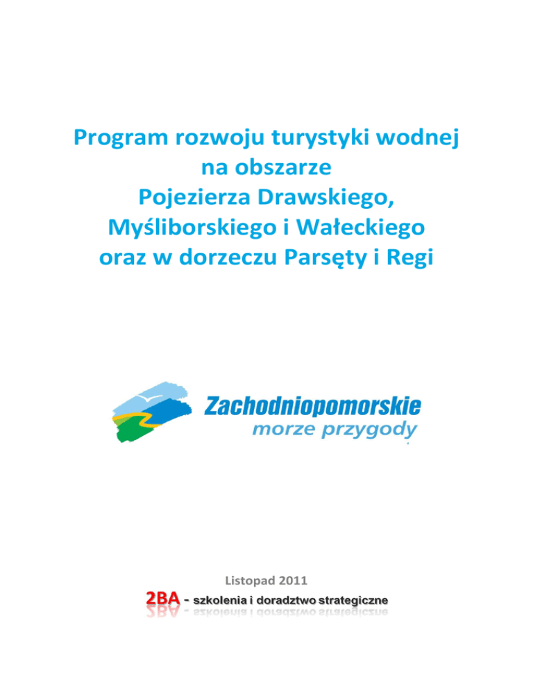 Program rozwoju turystyki wodnej na obszarze Pojezierza Drawskiego, Myśliborskiego i Wałeckiego oraz w dorzeczu Parsęty i Regi Listopad 2011 Spis treści SPIS TREŚCI....................................................................................................................................................... 2 I. WPROWADZENIE DO „PROGRAMU ROZWOJU TURYSTYKI WODNEJ NA OBSZARZE POJEZIERZA DRAWSKIEGO, MYŚLIBORSKIEGO I WAŁECKIEGO ORAZ W DORZECZU PARSĘTY I REGI” .................................. 4 1. 2. 3. 4. 5. INFORMACJE WPROWADZAJĄCE ........................................................................................................................ 4 OBSZAR REALIZACJI „PROGRAMU” .................................................................................................................... 6 CELE REALIZACJI „PROGRAMU” ......................................................................................................................... 8 ZAKRES RZECZOWY „PROGRAMU”..................................................................................................................... 9 CHARAKTER I ZAKRES KONSULTACJI Z PARTNERAMI ............................................................................................. 11 II. POTENCJAŁ OBSZARU POJEZIERZA DRAWSKIEGO, MYŚLIBORSKIEGO I WAŁECKIEGO ORAZ DORZECZA PARSĘTY I REGI W ZAKRESIE TURYSTYKI WODNEJ ......................................................................................... 13 1. 1.1. 1.2. 1.3. 2. 2.1. 2.2. 2.3. 2.4. 2.5. 3. 3.1. 3.2. 3.3. 3.4. 3.5. 4. 5. WALORY NATURALNE W ZAKRESIE TURYSTYKI WODNEJ........................................................................................ 14 JEZIORA .................................................................................................................................................. 15 RZEKI ..................................................................................................................................................... 17 OBSZARY OCHRONY PRZYRODY ................................................................................................................... 22 INFRASTRUKTURA TECHNICZNA DO ROZWOJU I UPRAWIANIA TURYSTYKI WODNEJ I ZAGOSPODAROWANIE JEZIOR I RZEK . 25 DROGI I DOSTĘPNOŚĆ KOMUNIKACYJNA ....................................................................................................... 25 BAZA NOCLEGOWA ................................................................................................................................... 29 BAZA GASTRONOMICZNA........................................................................................................................... 33 ZAGOSPODAROWANIE JEZIOR I RZEK ............................................................................................................ 34 WODNE SZLAKI TURYSTYCZNE..................................................................................................................... 53 INFRASTRUKTURA SPOŁECZNA DLA TURYSTYKI WODNEJ ....................................................................................... 62 PODMIOTY OBSŁUGI TURYSTYKI WODNEJ...................................................................................................... 62 ZARZĄDZANIE I ORGANIZACJA ŁOWISK.......................................................................................................... 67 INFORMACJA TURYSTYCZNA ....................................................................................................................... 70 ORGANIZATORZY TURYSTYCZNI, POŚREDNICY I AGENCI .................................................................................... 71 ORGANIZACJE PRO-TURYSTYCZNE................................................................................................................ 74 OFERTA PRODUKTU TURYSTYCZNEGO ............................................................................................................... 75 PROMOCJA TURYSTYKI WODNEJ ...................................................................................................................... 79 III. UWARUNKOWANIA ZEWNĘTRZNE ROZWOJU ŚRÓDLĄDOWEJ TURYSTYKI WODNEJ W WOJEWÓDZTWIE ZACHODNIOPOMORSKIM NA OBSZARZE REALIZACJI „PROGRAMU” .............................................................. 81 1. ROZWÓJ ŚRÓDLĄDOWEJ TURYSTYKI WODNEJ W POLSCE ...................................................................................... 81 1.1. RYNEK TURYSTYCZNY W POLSCE, EUROPIE I NA ŚWIECIE .................................................................................. 81 1.2. RYNEK ŚRÓDLĄDOWEJ TURYSTYKI WODNEJ ................................................................................................... 83 2. POLITYKA INSTYTUCJI ZARZĄDZAJĄCYCH AKWENAMI WODNYMI I OBSZARAMI PRZYRODNICZYMI CHRONIONYMI PRAWEM86 3. ROZWÓJ TURYSTYCZNY INNYCH OBSZARÓW POJEZIERNYCH I DORZECZY W POLSCE ................................................... 91 3.1. ROZWÓJ INNYCH OBSZARÓW POJEZIERNYCH ................................................................................................. 91 3.2. SZTUCZNE ZBIORNIKI WODNE Z FUNKCJĄ TURYSTYCZNĄ................................................................................... 95 3.3. RZEKI I SZLAKI KAJAKOWE .......................................................................................................................... 96 IV. PROJEKTY I INWESTYCJE NA RZECZ ROZWOJU TURYSTYKI WODNEJ .................................................. 98 1. CHARAKTERYSTYKA PROJEKTÓW I INWESTYCJI W ZAKRESIE TURYSTYKI WODNEJ ....................................................... 98 1.1. RODZAJE PROJEKTÓW I INWESTYCJI W ZAKRESIE TURYSTYKI WODNEJ ................................................................. 98 1.2. KLUCZOWE PROJEKTY I INWESTYCJE W ZAKRESIE TURYSTYKI WODNEJ ................................................................. 99 2ba–„Program rozwoju