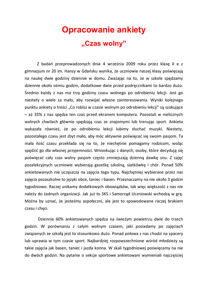Opracowanie ankiety „Czas wolny” Z badań przeprowadzonych dnia 4 września 2009 roku przez klasę II e z gimnazjum nr 20 im. Hanzy w Gdańsku wynika, że uczniowie naszej klasy poświęcają na naukę dwie godziny dziennie w domu. Zważając na to, że w szkole spędzamy dziennie około ośmiu godzin, dodatkowe dwie przed podręcznikami to bardzo dużo. Średnio każdy z nas ma trzy godziny czasu wolnego po odrobieniu lekcji. Jest go niestety o wiele za mało, aby rozwijać własne zainteresowania. Wyniki kolejnego punktu ankiety o treści „Co robisz w czasie wolnym po odrobieniu lekcji” są szokujące – aż 35% z nas spędza ten czas przed ekranem komputera. Pozostali w nielicznych wolnych chwilach głównie spędzają czas ze znajomymi lub trenując sport. Ankieta wykazała również, że po odrobieniu lekcji lubimy słuchać muzyki. Niestety, pozostałego czasu jest zbyt mało, aby móc aktywnie poświęcać się swoim pasjom. Ta mała ilość czasu przekłada się na to, że niechętnie pomagamy rodzicom, woląc spędzić go dla własnej przyjemności. Wnioskując z danych, osoby, które decydują się poświęcać cały czas wolny pasjom często zmniejszają dzienną dawkę snu. Z zajęć pozalekcyjnych uczniowie wybierają gazetkę szkolną, siatkówkę i chór. Ponad 50% ankietowanych nie uczęszcza na zajęcia tego typu. Najchętniej wybierane przez nas zajęcia pozaszkolne to języki obce, taniec i basen. Przeznaczamy na nie około 3 godzin tygodniowo. Raczej unikamy dodatkowych obowiązków, tak więc większość z nas nie należy do żadnych organizacji. Jak już to SKS i Samorząd Uczniowski wchodzą w grę. Można by uznać, że jesteśmy aspołeczni, ale jest to spowodowane raczej brakiem czasu i chęci. Dziennie 60% ankietowanych spędza na świeżym powietrzu dwie do trzech godzin. W porównaniu z całym wolnym czasem, jaki posiadamy po zajęciach związanych ze szkołą jest to stosunkowo dużo. Ponad połowa z nas chodzi na spacery lub uprawia w tym czasie sport. Najbardziej rozpowszechnione wśród młodzieży są takie zajęcia jak basen, taniec i jazda konna. W skali tygodniowej poświęcamy na nie do dwóch godzin. Na pytanie o sekcje sportowe ankietowani wymieniali najczęściej siatkówkę i koszykówkę. Jedenaście osób z klasy, czyli około połowy, często jest widzem sportowym, a nieliczni z tej grupy kupują prasę sportową. Na pytanie o organizowaniu sobie wycieczek krajoznawczo-turystycznych tylko połowa klasy odpowiedziała pozytywnie, wskazując na wycieczki rowerowe, nad jezioro i do lasu. Uczniowie rzadko oglądają telewizje oraz słuchają radia. Wyniki wskazują, że na słuchanie audycji radiowych poświęcamy około 30 minut dziennie. Najwięcej tygodniowego czasu wolnego spędzamy w gronie przyjaciół. Z rodziną przebywa aż 50% ankietowanych. Podczas ferii zimowych większość jeździ na łyżwach. Dużo uczniów chodzi z przyjaciółmi do kina. Trzydzieści procent jeździ na rolkach. Cała społeczność klasowa nie pozbywa się stresu podczas uprawiania sportu. Pięćdziesiąt pięć procent z uczniów klasy II e odpowiedziało, iż pieniądze nie mają wpływu na ich formy spędzania czasu wolnego. Na integrację i pomoc rodzinie zdecydowanie brakuje czasu, z resztą jak na wszystko. Poświęca się im średnio do dwóch godzin. Ankieta pomogła klasie zintegrować się podczas wspólnego opracowywania wyników, jednak pewne niedokładności w treści pytań lub brak sprecyzowanych odpowiedzi spowodował, iż wyniki ankiety mogą nie oddawać rzeczywistej ilości czasu wolnego i zajęć wykonywanych w tym czasie. Opracowanie wykonane przez: Natalia Brylowska, Agata Chiżyńska, Monika Czeremańska, Klaudia Dudzińska, Paweł Haftka, Agnieszka Kaniewska Ania Kolanowska Magdalena Korona Martyna Kowalska Paulina Przesławska Marta Sokół Marianna Tomaszewska Marek Wolański Monika Wolff