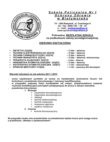 Szkoła Policealna Nr 1 Ochrony Zdrowia w Białymstoku 15 – 268 Białystok, ul. Czackiego 8 tel. / fax (085) 742 – 18 – 81 e – mail: [email protected] www.sp1oz.wrotapodlasia.pl Policealna, BEZPŁATNA SZKOŁA na podbudowie szkoły ponadgimnazjalnej. KIERUNKI KSZTAŁCENIA DIETETYK 322[20] TECHNIK ELEKTRORADIOLOG 322[19] TECHNIK FARMACEUTYCZNY 322[10] TECHNIK MASAŻYSTA 322[12] TERAPEUTA ZAJĘCIOWY 322[15] HIGIENISTKA STOMATOLOGICZNA 322[03] ASYSTENTKA STOMATOLOGICZNA 322[01] OPIEKUN MEDYCZNY 513[02] – 2 lata – dzienny – 2 lata – dzienny – 2 lata – dzienny – 2 lata – dzienny i wieczorowy – 2 lata – dzienny – 2 lata – dzienny – 1 rok – wieczorowy – 1 rok – zaoczny dla dorosłych Warunki rekrutacji na rok szkolny 2011 / 2012 - suma uzyskanych punktów za ocenę na świadectwie ukończenia liceum lub technikum z przedmiotu kierunkowego i rozmowy kwalifikacyjnej, w przypadku większej ilości kandydatów niż miejsc, przeprowadzona zostanie rozmowa kwalifikacyjna pod kątem predyspozycji do pracy w danym zawodzie, przedmioty kierunkowe: 1. Biologia asystentka stomatologiczna higienistka stomatologiczna dietetyk technik elektroradiolog technik masażysta terapeuta zajęciowy opiekun medyczny 2. Chemia technik farmaceutyczny W przypadku braku w/w przedmiotów na świadectwie będzie brana pod uwagę ocena z przedmiotu „Wiedza o społeczeństwie”. Dokumenty należy składać do 12 sierpnia 2011 r. do godz. 15.00 tj. podanie (do pobrania w sekretariacie szkoły lub ze strony internetowej), świadectwo ukończenia szkoły ponadgimnazjalnej, zaświadczenie lekarskie (skierowanie do pobrania w sekretariacie szkoły), ksero dowodu osobistego, 3 zdjęcia. Terminy rozmów kwalifikacyjnych ul. Czackiego 8 ASYSTENTKA STOMATOLOGICZNA 322[01] HIGIENISTKA STOMATOLOGICZNA 322[03] DIETETYK 322[20] TECHNIK FARMACEUTYCZNY 322[10] TECHNIK ELEKTRORADIOLOG 322[19] TECHNIK MASAŻYSTA 322[12] TERAPEUTA ZAJĘCIOWY 322[15] OPIEKUN MEDYCZNY 513[02] 24.08.2011 r. godz. 9:00 24.08.2011 r. godz. 9:00 24.08.2011 r. godz. 9:00 24.08.2011 r. godz. 9:00 25.08.2011 r. godz. 9:00 25.08.2011 r. godz. 9:00 25.08.2011 r. godz. 9:00 25.08.2011 r. godz. 9:00 Ogłoszenie listy przyjętych 30 sierpnia 2011 roku ZAWÓD: TECHNIK FARMACEUTYCZNY 322[10] Czas trwania nauki: 2 lata ( 4 semestry ) Technik farmaceutyczny wykonuje wszelkie postacie leków recepturowych, informuje pacjenta o sposobie użycia leku i jego przechowywaniu, przygotowuje do sprzedaży oraz wydaje produkty lecznicze i wyroby medyczne pacjentom. Miejscem pracy są apteki wszystkich typów, punkty apteczne, sklepy zielarsko- medyczne, zielarsko- drogeryjne, ze sprzętem medycznym, hurtownie farmaceutyczne i zielarskie, laboratoria, zakłady przemysłu farmaceutycznego, kosmetycznego. O przydatności do zawodu decyduje uprawniony lekarz. Rekrutacja kandydatów – w przypadku większej ilości osób chętnych niż miejsc przeprowadzona zostanie rozmowa kwalifikacyjna oceniająca przydatność kandydata do zawodu. O przyjęciu kandydata na semestr pierwszy nauki decydują: suma punktów pochodzących z przeliczenia ocen uzyskanych na świadectwie szkoły ponadgimnazjalnej z przedmiotu chemia lub wiedza o społeczeństwie oraz z ewentualnej rozmowy kwalifikacyjnej. Przy ustaleniu liczby punktów za wynik rozmowy kwalifikacyjnej przyjmuje się następujące wartości ocen: celujący – 6pkt., bardzo dobry – 5pkt., dobry – 4pkt., dostateczny – 3pkt., dopuszczający – 2pkt. Przy ustaleniu liczby punktów za ocenę z przedmiotu kierunkowego przyjmuje się następujące wartości ocen: celujący – 4pkt., bardzo dobry – 3pkt., dobry – 2pkt., dostateczny – 1pkt. Kandydat zakwalifikowany na kierunek kształcenia Technik farmaceutyczny powinien przygotować: - fartuch ochronny - obuwie na zmianę. ZAWÓD: DIETETYK 322[20] Czas trwania nauki: 2 lata ( 4 semestry ) Dietetyk planuje i nadzoruje diety zgodnie z obowiązującymi zasadami żywienia. Miejscem pracy dietetyka są szpitale – oddziały szpitalne, działy żywienia, kuchnie szpitalne, sanatoria, domy wczasowe, gabinety dietetyczne, żłobki, domy małego dziecka, domy pomocy społecznej, stołówki szkolne, bursy, restauracje, działy higieny żywienia i żywności stacji sanitarno-epidemiologicznych. O przydatności do zawodu decyduje uprawniony lekarz. Rekrutacja kandydatów – w przypadku większej ilości osób chętnych niż miejsc przeprowadzona zostanie rozmowa kwalifikacyjna oceniająca przydatność kandydata do zawodu. O przyjęciu kandydata na semestr pierwszy nauki decydują: suma punktów pochodzących z przeliczenia ocen uzyskanych na świadectwie szkoły ponadgimnazjalnej z przedmiotu biologia lub wiedza o społeczeństwie oraz z ewentualnej rozmowy kwalifikacyjnej. Przy ustaleniu liczby punktów za wynik rozmowy kwalifikacyjnej przyjmuje się następujące wartości ocen: celujący – 6pkt., bardzo dobry – 5pkt., dobry – 4pkt., dostateczny – 3pkt., dopuszczający – 2pkt. Przy ustaleniu liczby punktów za ocenę z przedmiotu kierunkowego przyjmuje się następujące wartości ocen: celujący – 4pkt., bardzo dobry – 3pkt., dobry – 2pkt., dostateczny – 1pkt. Kandydat zakwalifikowany na kierunek kształcenia Dietetyk powinien przygotować: - fartuch ochronny - obuwie na zmianę. ZAWÓD: ASYSTENTKA STOMATOLOGICZNA 322[01] Nauka trwa 1rok ( 2 semestry ). Asystentka stomatologiczna zajmuje się organizacją pracy w gabinecie dentystycznym i asystuje przy zabiegach dentystycznych. Może być zatrudniona w gabinetach dentystycznych uspołecznionych placówek ochrony zdrowia i gabinetach prywatnych. Wymagania psychofizyczne właściwe dla zawodu zainteresowanie humanistyczne i medyczne dokładność i sumienność punktualność i zdyscyplinowanie wrażliwość, życzliwość i cierpliwość w stosunku do ludzi poszanowanie godności osobistej drugiego człowieka gotowość niesienia pomocy samokontrola zdolność koncentracji i podzielnoś