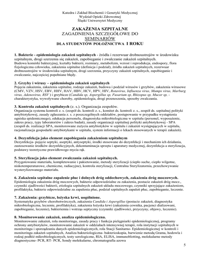 Katedra i Zakład Biochemii i Genetyki Medycznej Wydział Opieki Zdrowotnej Śląski Uniwersytet Medyczny ZAKAśENIA SZPITALNE ZAGADNIENIA SZCZEGÓŁOWE DO SEMINARIÓW DLA STUDENTÓW POŁOśNICTWA I ROKU 1. Bakterie - epidemiologia zakaŜeń szpitalnych - źródła i rezerwuar drobnoustrojów w środowisku szpitalnym, drogi szerzenia się zakaŜeń, zapobieganie i zwalczanie zakaŜeń szpitalnych. Budowa komórki bakteryjnej, kształty bakterii, rozmiary, metabolizm, wzrost i reprodukcja, endospory, flora fizjologiczna człowieka, zakaŜenia szpitalne (definicja i podział), źródła zakaŜeń szpitalnych, rezerwuar drobnoustrojów w środowisku szpitalnym, drogi szerzenia, przyczyny zakaŜeń szpitalnych, zapobieganie i zwalczanie, najczęściej popełniane błędy. 2. Grzyby i wirusy – epidemiologia zakaŜeń szpitalnych Pojęcia zakaŜenia, zakaŜenia szpitalne, rodzaje zakaŜeń, budowa i podział wirusów i grzybów, zakaŜenia wirusowe (CMV, VZV, HSV, EBV, HHV, HAV, HBV, HCV, HPV, HIV, Rotavirus, Influenza virus, Mumps virus, Marburg virus, Adenovirus, RSV ) i grzybicze (Candida sp, Aspergillus sp, Fusarium sp, Rhizopus sp, Mucor sp, charakterystyka, wywoływane choroby, epidemiologia, drogi przenoszenia, sposoby zwalczania. 3. Kontrola zakaŜeń szpitalnych (z. s.). Organizacja zespołów. Organizacja systemu kontroli z. s. (zespół ds. kontroli z. s., komitet ds. kontroli z. s., zespół ds. szpitalnej polityki antybiotykowej, zasady zgłaszania z. s. z poszczególnych oddziałów, postępowanie w przypadku wystąpienia ogniska epidemicznego), edukacja personelu, diagnostyka mikrobiologiczna w szpitalu (personel, wyposaŜenie, zakres pracy, typy laboratoriów i zakres badań), zasady organizacji szpitalnej polityki antybiotykowej - SPA (zespół ds. realizacji SPA, monitorowane zuŜycia antybiotyków w szpitalu i zakaŜeń występujących w szpitalu, racjonalizacja gospodarki antybiotykami w szpitalu, system informacji o lekach stosowanych w terapii zakaŜeń). 4. Dezynfekcja jako element zapobiegania zakaŜeniom szpitalnym Dezynfekcja- pojęcie septyki, aseptyki, antyseptyki, środki stosowane do dezynfekcji i mechanizm ich działania, zastosowanie środków dezynfekcyjnych, dekontaminacja sprzętu i aparatury medycznej, dezynfekcja a sterylizacja, podstawy teoretyczne prawidłowego mycia rąk. 5. Sterylizacja jako element zwalczania zakaŜeń szpitalnych. Przygotowanie materiału, kompletowanie i pakietowanie, metody sterylizacji (ciepło suche, ciepło wilgotne, niskotemperaturowe, chemiczne, radiacyjne), kontrola sterylizacji, Centralna Sterylizatornia, przechowywanie wysterylizowanego materiału. 6. ZakaŜenia szpitalne zapalenie płuc i dolnych dróg oddechowych, zakaŜenia dróg moczowych. Epidemiologia zakaŜenia dróg moczowych, bakterie odpowiedzialne za zakaŜenia, postacie zakaŜeń dróg mocz., czynniki zjadliwości bakterii, etiologia szpitalnych zakaŜeń układu moczowego, czynniki sprzyjające zakaŜeniom, profilaktyka, bakterie odpowiedzialne za zapalenia płuc, podział szpitalnych zapaleń płuc, zapobieganie, leczenie. 7. ZakaŜenia: grzybicze, łoŜyska krwi, uogólnione. Systematyka grzybów chorobotwórczych, zakaŜenia Candida i Aspergillus (postacie zakaŜeń, diagnostyka mikrobiologiczna, leczenie, profilaktyka), zakaŜenia łoŜyska krwi (zakaŜenia cewnika, pacjenci dializowani, zapobieganie, leczenie), bakteriemia i wstrząs septyczny (czynniki zjadliwości, przyczyny, objawy, leczenie). 8. Monitorowanie zakaŜeń, analiza epidemiologiczna. Monitorowanie zakaŜeń, rola monitoringu, zasady pracy i funkcja pielęgniarki epidemiologicznej, programy ochrony antybiotyków, monitorowanie zakaŜeń w oddziałach intensywnej terapii, rola instytucji szpitalnych w monitoringu i sporządzaniu danych epidemiologicznych, rola Stacji Sanitarno- Epidemiologicznej w kontroli i monitoringu zakaŜeń szpitalnych, Analiza bakteriologiczna- bakterioskopia, barwienie metodą Grama, hodowla i rodzaj podłóŜ mikrobiologicznych, testy serologiczne, RIA, ELISA, immunoblotting, molekularne metody diagnostyczne- PCR, RT- PCR, Sondy molekularne, chromatografia azowa 5 Katedra i Zakład Biochemii i Genetyki Medycznej Wydział Opieki Zdrowotnej Śląski Uniwersytet Medyczny 9. Zasady pobierania materiału do badań bakteriologicznych- wydzieliny z drzewa oskrzelowego, moczu, krwi. Sposoby i zasady pobierania próbek, transportu, opisywanie próbek, czas i temperatura przechowywania, częstość badań. 10. Badanie pacjenta przyjętego na oddział. Badanie fizykalne-warunki i zasady wywiadu, wywiad psychologiczny, rodzinny, przegląd układów, kolejność badania całościowego, badanie podmiotowe WYKAZ PODRĘCZNIKÓW Bulanda M., Heczko P. „Kontrola zakaŜeń szpitalnych” 1996, Polskie Towarzystwo ZakaŜeń szpitalnych, Kraków DzierŜanowski D., Jeljaszewicz J. „ZakaŜenia szpitalne” 1999, α-medica press, Bielsko-Biała Zaremba M. L, Borowski J. „Mikrobiologia lekarska” wydanie III, Wydawnictwo Lekarskie PZWL, Warszawa PRZEDMIOT ZALICZANY BĘDZIE NA PODSTAWIE REFERATÓW ORAZ KOLOKWIUM KOŃCOWEGO W FORMIE TESTOWEJ 6