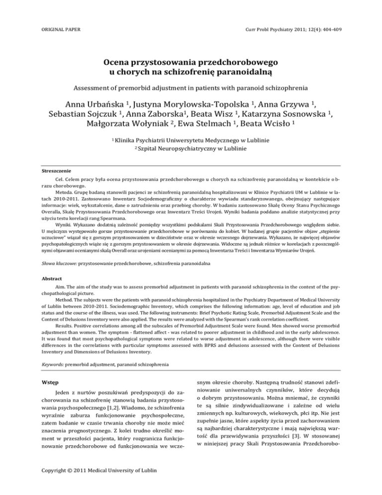 ORIGINAL PAPER Curr Probl Psychiatry 2011; 12(4): 404-409 Ocena przystosowania przedchorobowego u chorych na schizofrenię paranoidalną Assessment of premorbid adjustment in patients with paranoid schizophrenia Anna Urbańska 1, Justyna Morylowska-Topolska 1, Anna Grzywa 1, Sebastian Sojczuk 1, Anna Zaborska1, Beata Wisz 1, Katarzyna Sosnowska 1, Małgorzata Wołyniak 2, Ewa Stelmach 1, Beata Wcisło 1 1 Klinika Psychiatrii Uniwersytetu Medycznego w Lublinie Neuropsychiatryczny w Lublinie 2 Szpital Streszczenie Cel. Celem pracy była ocena przystosowania przedchorobowego u chorych na schizofrenię paranoidalną w kontekście o brazu chorobowego. Metoda. Grupę badaną stanowili pacjenci ze schizofrenią paranoidalną hospitalizowani w Klinice Psychiatrii UM w Lublinie w latach 2010-2011. Zastosowano Inwentarz Socjodemograficzny o charakterze wywiadu standaryzowanego, obejmujący następujące informacje: wiek, wykształcenie, dane o zatrudnieniu oraz przebieg choroby. W badaniu zastosowano Skalę Oceny Stanu Psychicznego Overalla, Skalę Przystosowania Przedchorobowego oraz Inwentarz Treści Urojeń. Wyniki badania poddano analizie statystycznej przy użyciu testu korelacji rang Spearmana. Wyniki. Wykazano dodatnią zależność pomiędzy wszystkimi podskalami Skali Przystosowania Przedchorobowego względem siebie. U mężczyzn występowało gorsze przystosowanie przedchorobowe w porównaniu do kobiet. W badanej grupie pacjentów objaw „stępienie uczuciowe” wiązał się z gorszym przystosowaniem w dzieciństwie oraz w okresie wczesnego dojrzewania. Wykazano, że najwięcej objawów psychopatologicznych wiąże się z gorszym przystosowaniem w okresie dojrzewania. Widoczne są jednak różnice w korelacjach z poszczególnymi objawami ocenianymi skalą Overall oraz urojeniami ocenianymi za pomocą Inwentarza Treści i Inwentarza Wymiarów Urojeń. Słowa kluczowe: przystosowanie przedchorobowe, schizofrenia paranoidalna Abstract Aim. The aim of the study was to assess premorbid adjustment in patients with paranoid schizophrenia in the context of the psychopathological picture. Method. The subjects were the patients with paranoid schizophrenia hospitalized in the Psychiatry Department of Medical University of Lublin between 2010-2011. Sociodemographic Inventory, which comprises the following information: age, level of education and job status and the course of the illness, was used. The following instruments: Brief Psychotic Rating Scale, Premorbid Adjustment Scale and the Content of Delusions Inventory were also applied. The results were analyzed with the Spearman’s rank correlation coefficient. Results. Positive correlations among all the subscales of Premorbid Adjustment Scale were found. Men showed worse premorbid adjustment than women. The symptom - flattened affect - was related to poorer adjustment in childhood and in the early adolescence. It was found that most psychopathological symptoms were related to worse adjustment in adolescence, although there were visible differences in the correlations with particular symptoms assessed with BPRS and delusions assessed with the Content of Delusions Inventory and Dimensions of Delusions Inventory. Keywords: premorbid adjustment, paranoid schizophrenia Wstęp Jeden z nurtów poszukiwań predyspozycji do zachorowania na schizofrenię stanowią badania przystosowania psychospołecznego [1,2]. Wiadomo, że schizofrenia wyraźnie zaburza funkcjonowanie psychospołeczne, zatem badanie w czasie trwania choroby nie może mieć znaczenia prognostycznego. Z kolei trudno określić moment w przeszłości pacjenta, który rozgranicza funkcjonowanie przedchorobowe od funkcjonowania we wcze- Copyright © 2011 Medical University of Lublin snym okresie choroby. Następną trudność stanowi zdefiniowanie uniwersalnych czynników, które decydują o dobrym przystosowaniu. Można mniemać, że czynniki te są silnie zindywidualizowane i zależne od wielu zmiennych np. kulturowych, wiekowych, płci itp. Nie jest zupełnie jasne, które aspekty życia przed zachorowaniem są najbardziej charakterystyczne i mają największą wartość dla przewidywania przyszłości [3]. W stosowanej w niniejszej pracy Skali Przystosowania Przedchorobo- Ocena przystosowania przedchorobowego u chorych na schizofrenię paranoidalną wego (SPP) prawidłowe przystosowanie przed chorobą jest rozumiane, jako osiągnięcie celów rozwojowych, koniecznych dla funkcjonowania na danym etapie rozwojowym. Ponadto skala ta uwzględnia poszczególne etapy rozwoju człowieka od wczesnego dzieciństwa do dojrzałości. Problem rozdzielenia okresu zdrowia od początku choroby rozwiązano w ten sposób, że skalowanie dotyczy okresu życia do sześciu miesięcy przed wystąpieniem pierwszych objawów choroby. Cel Celem pracy była analiza przystosowania przedchorobowego u chorych na schizofrenię paranoidalną w kontekście obrazu chorobowego. Metoda Grupę badaną stanowiło 30 osób hospitalizowanych w Klinice Psychiatrii Uniwersytetu Medycznego w Lublinie w latach 2010 i 2011 z powodu schizofrenii paranoidalnej, spełniających kryteria diagnostyczne wg ICD-10 i DSM-IV. Zasadniczym kryterium doboru była obecność zespołu paranoidalnego w aktualnym obrazie klinicznym oraz kontakt słowny umożliwiający wykonanie badań, brak objawów wskazujących na organiczne zaburzenia funkcjonowania OUN, brak uzależnień zarówno od alkoholu, jak i innych substancji psychoaktywnych. Każdy pacjent musiał wyrazić zgodę na uczestnictwo w badaniu. Zastosowano Inwentarz Socjodemograficzny o charakterze wywiadu standaryzowanego, służący do opisu grupy badanej. Inwentarz obejmował następujące informacje: wiek, wykształcenie, dane o zatrudnieniu, przebieg choroby. Stosowano również Skalę Przystosowania Przedchorobowego (tłum. A Grzywa), opracowaną w 1982 roku, służącą do oceny poziomu funkcjonowania w czterech głównych sferach życia w każdym z czterech okresów rozwojowych. 