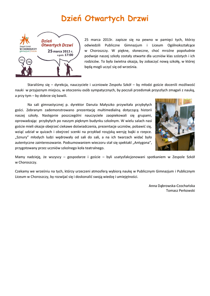 Dzień Otwartych Drzwi 25 marca 2013r. zapisze się na pewno w pamięci tych, którzy odwiedzili Publiczne Gimnazjum i Liceum Ogólnokształcące w Choroszczy. W piękne, słoneczne, choć mroźne popołudnie podwoje naszej szkoły zostały otwarte dla uczniów klas szóstych i ich rodziców. To była świetna okazja, by zobaczyć nową szkołę, w której będą mogli uczyć się od września. Staraliśmy się – dyrekcja, nauczyciele i uczniowie Zespołu Szkół – by młodzi goście docenili możliwość nauki w przyjaznym miejscu, w otoczeniu osób sympatycznych, by poczuli przedsmak przyszłych zmagań z nauką, a przy tym – by dobrze się bawili. Na sali gimnastycznej p. dyrektor Danuta Małyszko przywitała przybyłych gości. Zebranym zademonstrowano prezentację multimedialną dotyczącą historii naszej szkoły. Następnie poszczególni nauczyciele zaopiekowali się grupami, oprowadzając przybyłych po naszym pięknym budynku szkolnym. W wielu salach nasi goście mieli okazje obejrzeć ciekawe doświadczenia, prezentacje uczniów, pobawić się, wziąć udział w quizach i obejrzeć scenki na przykład rosyjską wersję bajki o rzepce. „Sznury” młodych ludzi wędrowały od sali do sali, a na ich twarzach widać było autentyczne zainteresowanie. Podsumowaniem wieczoru stał się spektakl „Antygona”, przygotowany przez uczniów szkolnego koła teatralnego. Mamy nadzieję, że wszyscy – gospodarze i goście – byli usatysfakcjonowani spotkaniem w Zespole Szkół w Choroszczy. Czekamy we wrześniu na tych, którzy urzeczeni atmosferą wybiorą naukę w Publicznym Gimnazjum i Publicznym Liceum w Choroszczy, by rozwijać się i doskonalić swoją wiedzę i umiejętności. Anna Dąbrowska-Czochańska Tomasz Perkowski