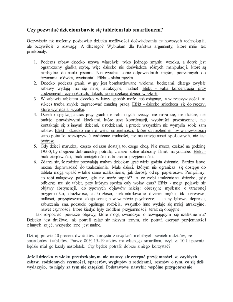 Czy pozwalać dzieciom bawić się tabletem lub smartfonem? Oczywiście nie możemy pozbawiać dziecka możliwości doświadczania najnowszych technologii, ale oczywiście z rozwagą! A dlaczego? Wybrałam dla Państwa argumenty, które mnie też przekonały: 1. Podczas zabaw dziecko używa właściwie tylko jednego zmysłu wzroku, a dotyk jest ograniczony gładką szybą, więc dziecko nie doświadcza różnych manipulacji, które są niezbędne do nauki pisania. Nie wyrabia sobie odpowiednich mięśni, potrzebnych do trzymania ołówka, wycinania! Efekt - słaba rączka. 2. Dziecko podczas grania w gry jest bombardowane wieloma bodźcami, dlatego zwykłe zabawy wydają mu się mniej atrakcyjne, nudne! Efekt - słaba koncentracja przy codziennych czynnościach, takich, jakie czekają dzieci w szkole. 3. W zabawie tabletem dziecko w łatwy sposób może coś osiągnąć, a w rzeczywistości na sukces trzeba zwykle zapracować żmudną pracą. Efekt - dziecko zniechęca się do rzeczy, które wymagają wysiłku. 4. Dziecko spędzając czas przy grach nie robi innych rzeczy: nie rusza się, nie skacze, nie buduje prawdziwymi klockami, które uczą koordynacji, wyobraźni przestrzennej, nie kontaktuje się z innymi dziećmi, z rodzicami, a przede wszystkim nie wymyśla sobie sam zabaw. Efekt - dziecko nie ma wielu umiejętności, które są niezbędne, by w przyszłośc i samo potrafiło rozwiązywać codzienne trudności, nie ma umiejętności społecznych, nie jest twórcze. 5. Gdy dzieci marudzą, często od razu dostają to, czego chcą. Nie muszą czekać na godzinę 19.00, by obejrzeć dobranockę, potrafią znaleźć sobie ulubiony filmik na youtube. Efekt brak cierpliwości, brak umiejętności odroczenia przyjemności. 6. Zdarza się, że rodzice pozwalają małym dzieciom grać wiele godzin dziennie. Bardzo łatwo można doprowadzić do uzależnienia. Małe dzieci, którym nie ogranicza się dostępu do tableta mogą wpaść w takie samo uzależnienie, jak dorosły od np. papierosów. Pomyślmy, co robi nałogowy palacz, gdy nie może zapalić? A co zrobi uzależnione dziecko, gdy odbierze mu się tablet, przy którym spędza cały wolny czas? Efekt - mogą pojawić się objawy abstynencji, do typowych objawów należą: obsesyjne myślenie o utraconej przyjemności, drażliwość, ataki złości, niekontrolowane drżenie mięśni, tiki nerwowe, mdłości, przyspieszona akcja serca; a w warstwie psychicznej – stany lękowe, depresja, zaburzenia snu, poczucie ogólnego rozbicia, wszystko inne wydaje się mniej atrakcyjne, nawet czynności, które kiedyś były źródłem przyjemności, teraz są obojętne. Jak rozpoznać pierwsze objawy, które mogą świadczyć o rozwijającym się uzależnie niu? Dziecko jest drażliwe, nie potrafi zająć się niczym innym, nie potrafi czerpać przyjemnośc i z innych zajęć, wszystko inne jest nudne. Dzisiaj prawie 40 procent dwulatków korzysta z urządzeń mobilnych swoich rodziców, ze smartfonów i tabletów. Prawie 80% 15-19 latków ma własnego smartfona, czyli za 10 lat pewnie będzie miał go każdy nastolatek. Czy będzie potrafił dobrze z niego korzystać? Jeżeli dziecko w wieku przedszkolnym nie nauczy się czerpać przyjemności ze zwykłych zabaw, codziennych czynności, spacerów, wygłupów z rodzicami, rozmów o tym, co się dziś wydarzyło, to nigdy za tym nie zatęskni. Podstawowe nawyki: wspólne przygotowanie posiłku, rozmowa przy stole, zainteresowanie problemami innych naturalnie kształtują się we wczesnym dzieciństwie. Jeśli nie zaszczepimy tego u przedszkolaka, to nastolatek będzie uważał tego za coś nienormalnego, dziwnego, obcego. Jak nauczyć mądrze korzystać z nowych technologii? Przede wszystkim dzieci uczą się od nas. Co my robimy? Czy przy obiedzie przeglądamy wiadomości w telefonie? Czy na placu zabaw jedną ręką huśtamy dziecko, a w drugiej trzyma my telefon? Czy potrafimy cały wieczór obejść się bez komputera? Dajmy dobry przykład. Sprawdźmy, czy dziecko potrafi przez kilka dni wytrzymać bez grania w gry. Pozwoli nam to sprawdzić, czy nie ma pierwszych objawów uzależnienia i pozwoli dziecku doświadczyć nudy, frustracji, a wreszcie przyjemności z doświadczania innych czynności i zabaw. Pilnujmy, by dziecko nie siedziało zbyt długo zgarbione, wpatrzone w mały ekran, to również zagrożenie dla jego wzroku i kręgosłupa. Dzienna dawka gier dla przedszkolaka może trwać 10-15 min i być nagrodą, albo stałym rytuałem. Nie powinna jednak przekraczać 30-45 minut! Warto zrobić dzień lub kilka dni przerwy. Nauczmy dziecko mądrze wybierać. Wybierajmy gry przeznaczone dla jego grupy wiekowej. Wiele aplikacji i gier edukacyjnych jest bardzo dobrze przygotowanych zarówno pod względem potrzeb i możliwości przedszkolaka, ale i ze strony estetycznej. Powodzenia Izabela Kopiec-Bialas, psycholog