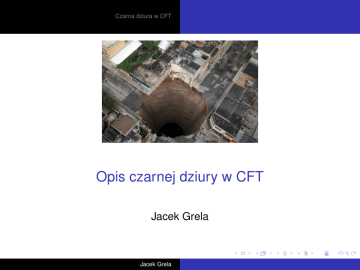 Czarna dziura w CFT Opis czarnej dziury w CFT Jacek Grela Jacek Grela Czarna dziura w CFT Plan Czarna dziura w CFT Anti de Sitter w 2+1 wymiarach Czarna dziura BTZ Konforemna teoria pola Podsumowanie i literatura Jacek Grela Czarna dziura w CFT AdS3 BTZ BH CFT Podsumowanie Czasoprzestrzeń Anti de Sitter AdS3 to czasoprzestrzeń 2+1 uzyskana z próżniowych równań Einsteina o ujemnej stałej Λ Z √ 1 1 2 Λ=− 2 S= d 3 x −g R + 2 , 16π L L L - promień krzywizny, z metryka˛ ds2 = − 2 −1 r2 r 2 + 1 dt + + 1 dr 2 + r 2 dφ2 L2 L2 Jacek Grela Czarna dziura w CFT AdS3 BTZ BH CFT Podsumowanie Przedstawienie AdS3 jako cylinder. I “Rozluźnienie” metryki time I gtt = − L2 r2 + O(1), g = + O(1/r 4 ), ... rr L2 r2 Taka operacja zachowuje AdS3 dla r → ∞. space I Co nam to da? Możemy podać ciekawsza˛ metryk˛e z taka˛ asymptotyka. ˛ Jacek Grela Czarna dziura w CFT AdS3 BTZ BH CFT Podsumowanie Czarna dziura BTZ Czarna dziura w 2+1 z ujemna˛ stała˛ kosmologiczna˛ Λ : Bañados, Teitelboim i Zanelli ds2 = −N 2 dt 2 + N −2 dr 2 + r 2 (N φ dt + dφ)2 , N 2 = −M + Nφ = − r2 J2 + , L2 4r 2 J . 2r 2 I N 2 = 0 → dwa promienie r± , I asymptotycznie ta metryka to AdS3 . Jacek Grela M > 0, |J| ≤ ML. Czarna dziura w CFT AdS3 BTZ BH CFT Podsumowanie I Ale dlaczego chcemy asymptotyki typu AdS3 ? I Analiza symetrii metryki AdS3 → pola Killinga ∇(ν ξµ) = 0 Dostajemy wektory postaci L3 2 + 2 − (∂ T + ∂− T ) + ... 2r 2 + L2 2 + 2 − T − ∂− T ) + ... ξ φ = (T + − T − ) − 2 (∂+ 2r ξ r = r (∂+ T + + ∂− T − ) + ... ξ t = L(T + + T − ) + I Co nie wyglada ˛ zachecaj ˛ aco, ˛ jednak... Jacek Grela Czarna dziura w CFT AdS3 BTZ BH CFT Podsumowanie Konforemna teoria pola! I ...z tych pól Killinga możemy uzyskać generatory Ln , L̄n spełniajace ˛ algebre˛ [Ln , Lm ] = (n − m)Ln+m + c n(n2 − 1)δn+m,0 , 12 [L̄n , Lm ] = 0 I c to ładunek centralny, c = 32 L. Jest to algebra Virasoro, główny element CFT. Jacek Grela n, m ∈ Z, time Czarna dziura w CFT space AdS3 BTZ BH CFT Podsumowanie I Co uzyskaliśmy? Metryka BTZ z AdS3 na brzegu. I Na tym brzegu, jak widzieliśmy, mamy zadana˛ CFT. I Połaczenie ˛ kwantowej teorii pola z teoria˛ grawitacji. I Kwantowy opis czarnej dziury BTZ. Jacek Grela Czarna dziura w CFT AdS3 BTZ BH CFT Podsumowanie Entropia Bekensteina-Hawkinga I z generatorów uzyskujemy operatory masy i kretu ˛ M= I I 1 (L0 + L̄0 ), L J = L0 − L̄0 Operatory L0 (L̄0 ) licza˛ mikrostany czarnej dziury nR (nL ). dla M >> 1 mikrostanów jest b. dużo, entropia rośnie wtedy z liczba˛ stanów jak r r nR nL S = 2π c + 2π c 6 6 Obliczajac ˛ liczbe˛ stanów w funkcji M i J mamy r r L(LM + J) L(LM − J) 2πr+ S=π +π = 2 2 4 Jacek Grela Czarna dziura w CFT AdS3 BTZ BH CFT Podsumowanie Podsumowanie I AdS3 to rozwiazanie ˛ próżniowe I Generatory symetrii tej metryki spełniaja˛ algebre˛ Virasoro → CFT I AdS3 jako asymptotyka rozwiazania ˛ BTZ I Czarna dziura BTZ jako kwantowy stan CFT I Mikroskopowe wyjaśnienie entropii Jacek Grela Czarna dziura w CFT AdS3 BTZ BH CFT Podsumowanie Literatura I “Black hole entropy from near-horizon microstates”, A. Strominger, JHEP 02 (1998) 009, I “The Black Hole in Three Dimensional Spacetime”, M. Bañados, C. Teitelboim, J. Zanelli, PRL 69 (1992) 1849-1851, hep-th/9204099, I “Conformal Field Theory, (2+1)-Dimensional Gravity, and the BTZ Black Hole”, S. Carlip, Class.Quant.Grav.22:R85-R124, 2005, gr-qc/0503022. Jacek Grela