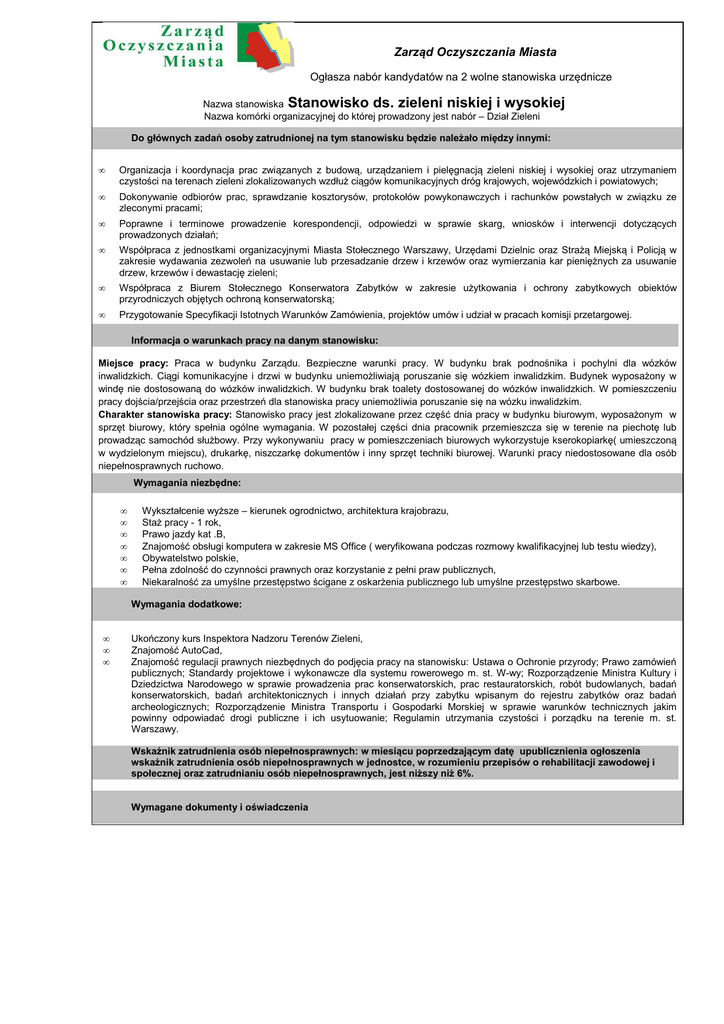 Zarząd Oczyszczania Miasta Ogłasza nabór kandydatów na 2 wolne stanowiska urzędnicze Nazwa stanowiska Stanowisko ds. zieleni niskiej i wysokiej Nazwa komórki organizacyjnej do której prowadzony jest nabór – Dział Zieleni Do głównych zadań osoby zatrudnionej na tym stanowisku będzie należało między innymi: • Organizacja i koordynacja prac związanych z budową, urządzaniem i pielęgnacją zieleni niskiej i wysokiej oraz utrzymaniem czystości na terenach zieleni zlokalizowanych wzdłuż ciągów komunikacyjnych dróg krajowych, wojewódzkich i powiatowych; • Dokonywanie odbiorów prac, sprawdzanie kosztorysów, protokołów powykonawczych i rachunków powstałych w związku ze zleconymi pracami; • Poprawne i terminowe prowadzenie korespondencji, odpowiedzi w sprawie skarg, wniosków i interwencji dotyczących prowadzonych działań; • Współpraca z jednostkami organizacyjnymi Miasta Stołecznego Warszawy, Urzędami Dzielnic oraz Strażą Miejską i Policją w zakresie wydawania zezwoleń na usuwanie lub przesadzanie drzew i krzewów oraz wymierzania kar pieniężnych za usuwanie drzew, krzewów i dewastację zieleni; • Współpraca z Biurem Stołecznego Konserwatora Zabytków w zakresie użytkowania i ochrony zabytkowych obiektów przyrodniczych objętych ochroną konserwatorską; • Przygotowanie Specyfikacji Istotnych Warunków Zamówienia, projektów umów i udział w pracach komisji przetargowej. Informacja o warunkach pracy na danym stanowisku: Miejsce pracy: Praca w budynku Zarządu. Bezpieczne warunki pracy. W budynku brak podnośnika i pochylni dla wózków inwalidzkich. Ciągi komunikacyjne i drzwi w budynku uniemożliwiają poruszanie się wózkiem inwalidzkim. Budynek wyposażony w windę nie dostosowaną do wózków inwalidzkich. W budynku brak toalety dostosowanej do wózków inwalidzkich. W pomieszczeniu pracy dojścia/przejścia oraz przestrzeń dla stanowiska pracy uniemożliwia poruszanie się na wózku inwalidzkim. Charakter stanowiska pracy: Stanowisko pracy jest zlokalizowane przez część dnia pracy w budynku biurowym, wyposażonym w sprzęt biurowy, który spełnia ogólne wymagania. W pozostałej części dnia pracownik przemieszcza się w terenie na piechotę lub prowadząc samochód służbowy. Przy wykonywaniu pracy w pomieszczeniach biurowych wykorzystuje kserokopiarkę( umieszczoną w wydzielonym miejscu), drukarkę, niszczarkę dokumentów i inny sprzęt techniki biurowej. Warunki pracy niedostosowane dla osób niepełnosprawnych ruchowo. Wymagania niezbędne: • • • • • • • Wykształcenie wyższe – kierunek ogrodnictwo, architektura krajobrazu, Staż pracy - 1 rok, Prawo jazdy kat .B, Znajomość obsługi komputera w zakresie MS Office ( weryfikowana podczas rozmowy kwalifikacyjnej lub testu wiedzy), Obywatelstwo polskie, Pełna zdolność do czynności prawnych oraz korzystanie z pełni praw publicznych, Niekaralność za umyślne przestępstwo ścigane z oskarżenia publicznego lub umyślne przestępstwo skarbowe. Wymagania dodatkowe: • • • Ukończony kurs Inspektora Nadzoru Terenów Zieleni, Znajomość AutoCad, Znajomość regulacji prawnych niezbędnych do podjęcia pracy na stanowisku: Ustawa o Ochronie przyrody; Prawo zamówień publicznych; Standardy projektowe i wykonawcze dla systemu rowerowego m. st. W-wy; Rozporządzenie Ministra Kultury i Dziedzictwa Narodowego w sprawie prowadzenia prac konserwatorskich, prac restauratorskich, robót budowlanych, badań konserwatorskich, badań architektonicznych i innych działań przy zabytku wpisanym do rejestru zabytków oraz badań archeologicznych; Rozporządzenie Ministra Transportu i Gospodarki Morskiej w sprawie warunków technicznych jakim powinny odpowiadać drogi publiczne i ich usytuowanie; Regulamin utrzymania czystości i porządku na terenie m. st. Warszawy. Wskaźnik zatrudnienia osób niepełnosprawnych: w miesiącu poprzedzającym datę upublicznienia ogłoszenia wskaźnik zatrudnienia osób niepełnosprawnych w jednostce, w rozumieniu przepisów o rehabilitacji zawodowej i społecznej oraz zatrudnianiu osób niepełnosprawnych, jest niższy niż 6%. Wymagane dokumenty i oświadczenia • • • • • • • • • • Curriculum vitae z przebiegiem nauki i pracy zawodowej, Podpisany odręcznie list motywacyjny, Kopie dokumentów potwierdzających wymagane wykształcenie, kserokopie świadectw pracy dokumentujących wymagany staż pracy lub zaświadczenie o zatrudnieniu, zawierające okres zatrudnienia, w przypadku pozostawania w stosunku pracy, Kserokopia dokumentu potwierdzającego posiadanie aktualnego prawa jazdy, Podpisane odręcznie oświadczenie o posiadanym obywatelstwie, Podpisane odręcznie oświadczenie o pełnej zdolności do czynności prawnych oraz korzystaniu z pełni praw publicznych,٭ Podpisane odręcznie oświadczenie, że kandydat nie był skazany prawomocnym wyrokiem sądu za umyślne przestępstwo ścigane z oskarżenia publicznego lub umyślne przestępstwo skarbowe,٭ Podpisana odręcznie klauzula o treści: „Wyrażam zgodę na przetwarzanie moich danych osobowych zawartych w ofercie pracy dla potrzeb rekrutacji, zgodnie z ustawa z dnia 29.08.1997r. o ochronie danych osobowych. Dz. U. z 2002r. Nr 101, poz. 926 ze zm. „٭ Kserokopia dokumentu potwierdzającego niepełnosprawność w przypadku kandydata, który zamierza skorzystać z uprawnienia o którym mowa w art. 13a ust. 2 ustawy z dnia 21.11.2008r. o pracownikach samorządowych. Dotyczy naboru na wolne stanowisko urzędnicze. Osoby zainteresowane prosimy o dostarczenie osobiście lub za pośrednictwem poczty kompletu dokumentów w terminie do dnia 12 sierpnia 2016 r. na adres: Zarząd Oczyszczania Miasta 00-508 Warszawa, al. Jerozolimskie 11/19 z dopiskiem na kopercie: „ nr ref. - 6/TZ/2016 ” Oferty odrzucone zostaną komisyjnie zniszczone Dokumenty uważa się za dostarczone w terminie, jeżeli wpłynęły na w/w adres w terminie do dnia 12 sierpnia 