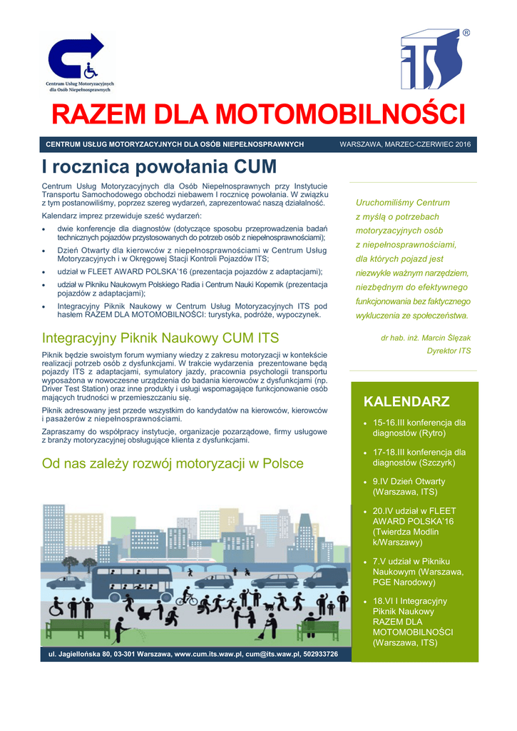 RAZEM DLA MOTOMOBILNOŚCI CENTRUM USŁUG MOTORYZACYJNYCH DLA OSÓB NIEPEŁNOSPRAWNYCH WARSZAWA, MARZEC-CZERWIEC 2016 I rocznica powołania CUM Centrum Usług Motoryzacyjnych dla Osób Niepełnosprawnych przy Instytucie Transportu Samochodowego obchodzi niebawem I rocznicę powołania. W związku z tym postanowiliśmy, poprzez szereg wydarzeń, zaprezentować naszą działalność. Uruchomiliśmy Centrum Kalendarz imprez przewiduje sześć wydarzeń: z myślą o potrzebach dwie konferencje dla diagnostów (dotyczące sposobu przeprowadzenia badań technicznych pojazdów przystosowanych do potrzeb osób z niepełnosprawnościami); Dzień Otwarty dla kierowców z niepełnosprawnościami w Centrum Usług Motoryzacyjnych i w Okręgowej Stacji Kontroli Pojazdów ITS; udział w FLEET AWARD POLSKA’16 (prezentacja pojazdów z adaptacjami); niezwykle ważnym narzędziem, udział w Pikniku Naukowym Polskiego Radia i Centrum Nauki Kopernik (prezentacja pojazdów z adaptacjami); niezbędnym do efektywnego Integracyjny Piknik Naukowy w Centrum Usług Motoryzacyjnych ITS pod hasłem RAZEM DLA MOTOMOBILNOŚCI: turystyka, podróże, wypoczynek. motoryzacyjnych osób z niepełnosprawnościami, dla których pojazd jest funkcjonowania bez faktycznego wykluczenia ze społeczeństwa. Integracyjny Piknik Naukowy CUM ITS Piknik będzie swoistym forum wymiany wiedzy z zakresu motoryzacji w kontekście realizacji potrzeb osób z dysfunkcjami. W trakcie wydarzenia prezentowane będą pojazdy ITS z adaptacjami, symulatory jazdy, pracownia psychologii transportu wyposażona w nowoczesne urządzenia do badania kierowców z dysfunkcjami (np. Driver Test Station) oraz inne produkty i usługi wspomagające funkcjonowanie osób mających trudności w przemieszczaniu się. Piknik adresowany jest przede wszystkim do kandydatów na kierowców, kierowców i pasażerów z niepełnosprawnościami. dr hab. inż. Marcin Ślęzak Dyrektor ITS KALENDARZ 15-16.III konferencja dla diagnostów (Rytro) 17-18.III konferencja dla diagnostów (Szczyrk) 9.IV Dzień Otwarty (Warszawa, ITS) 20.IV udział w FLEET AWARD POLSKA’16 (Twierdza Modlin k/Warszawy) 7.V udział w Pikniku Naukowym (Warszawa, PGE Narodowy) 18.VI I Integracyjny Piknik Naukowy RAZEM DLA MOTOMOBILNOŚCI (Warszawa, ITS) Zapraszamy do współpracy instytucje, organizacje pozarządowe, firmy usługowe z branży motoryzacyjnej obsługujące klienta z dysfunkcjami. Od nas zależy rozwój motoryzacji w Polsce ul. Jagiellońska 80, 03-301 Warszawa, www.cum.its.waw.pl, [email protected], 502933726