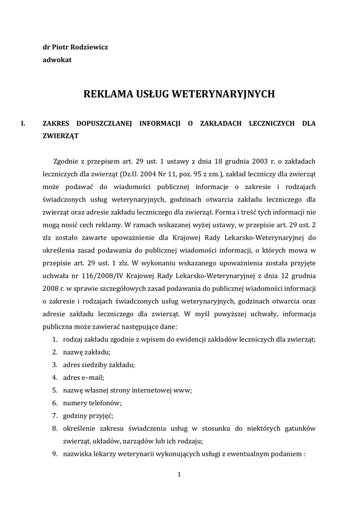 dr Piotr Rodziewicz adwokat REKLAMA USŁUG WETERYNARYJNYCH I. ZAKRES DOPUSZCZLANEJ INFORMACJI O ZAKŁADACH LECZNICZYCH DLA ZWIERZĄT Zgodnie z przepisem art. 29 ust. 1 ustawy z dnia 18 grudnia 2003 r. o zakładach leczniczych dla zwierząt (Dz.U. 2004 Nr 11, poz. 95 z zm.), zakład leczniczy dla zwierząt może podawać do wiadomości publicznej informacje o zakresie i rodzajach świadczonych usług weterynaryjnych, godzinach otwarcia zakładu leczniczego dla zwierząt oraz adresie zakładu leczniczego dla zwierząt. Forma i treść tych informacji nie mogą nosić cech reklamy. W ramach wskazanej wyżej ustawy, w przepisie art. 29 ust. 2 zlz zostało zawarte upoważnienie dla Krajowej Rady Lekarsko-Weterynaryjnej do określenia zasad podawania do publicznej wiadomości informacji, o których mowa w przepisie art. 29 ust. 1 zlz. W wykonaniu wskazanego upoważnienia została przyjęte uchwała nr 116/2008/IV Krajowej Rady Lekarsko-Weterynaryjnej z dnia 12 grudnia 2008 r. w sprawie szczegółowych zasad podawania do publicznej wiadomości informacji o zakresie i rodzajach świadczonych usług weterynaryjnych, godzinach otwarcia oraz adresie zakładu leczniczego dla zwierząt. W myśl powyższej uchwały, informacja publiczna może zawierać następujące dane: 1. rodzaj zakładu zgodnie z wpisem do ewidencji zakładów leczniczych dla zwierząt; 2. nazwę zakładu; 3. adres siedziby zakładu; 4. adres e–mail; 5. nazwę własnej strony internetowej www; 6. numery telefonów; 7. godziny przyjęć; 8. określenie zakresu świadczenia usług w stosunku do niektórych gatunków zwierząt, układów, narządów lub ich rodzaju; 9. nazwiska lekarzy weterynarii wykonujących usługi z ewentualnym podaniem : 1 a. stopnia lub tytułu naukowego w dziedzinie nauk weterynaryjnych; b. tytułu posiadanej specjalizacji. Tytuł specjalizacji powinien być zgodny z nazwą określoną w rozporządzeniu Ministra Rolnictwa i Gospodarki Żywnościowej z 28 listopada 1994 r. w sprawie trybu i szczegółowych zasad uzyskiwania tytułu specjalisty przez lekarza weterynarii (Dz.U. Nr 131, poz. 667, z zm.), c. innych kwalifikacji po uzgodnieniu z właściwą okręgową radą lekarsko – weterynaryjną (np. posiadanie kwalifikacji uzyskanych zagranicą). Wskazana wyżej informacja, zgodnie z brzmieniem uchwały, absolutnie nie może nosić cech reklamy, a także zawierać informacji cenowych. Ponadto uchwała określa szczegółowo warunki techniczne, jakie muszą spełniać tablice z informacjami o zakładzie leczniczym dla zwierząt oraz ogłoszenia prasowe zawierające takie informacje. Kwestia oznaczenia zakładów leczniczych dla zwierząt stanowi również przedmiot regulacji uchwały nr 80/2004 /III Krajowej Rady Lekarsko-Weterynaryjnej z dnia 11 maja 2004 r. w sprawie oznaczania zakładów leczniczych dla zwierząt. Ponadto zgodnie z § 5 uchwała nr 116/2008/IV Krajowej Rady LekarskoWeterynaryjnej z dnia 12 grudnia 2008 r. w sprawie szczegółowych zasad podawania do publicznej wiadomości informacji o zakresie i rodzajach świadczonych usług weterynaryjnych, godzinach otwarcia oraz adresie zakładu leczniczego dla zwierząt niedozwolona jest wszelka aktywna forma informowania, która w istocie nosi cechy reklamy, i tak zabronione jest: 1. rozdawania ulotek, wizytówek, broszur lub innych materiałów reklamowych poza siedzibą zakładu leczniczego dla zwierząt; 2. wysyłania ogłoszeń pocztą, internetowych i SMS-owych; 3. artykułów na zamówienie w mediach; 4. artykułów sponsorowanych w mediach; 5. plakatów z wyjątkiem ogłoszeń o obowiązkowych szczepieniach, 6. informacji wielkoformatowej przekraczającej 4 metry kwadratowe, 7. informacji na samochodach, autobusach lub innych środkach komunikacji z wyjątkiem samochodu używanego przez zakład leczniczy dla zwierząt, właściciela i kierownika tego zakładu; 8. tworzenia w celach reklamowania usług: prezentacji, filmów z przeprowadzanych zabiegów, stosowanego leczenia, dostępnych internetowe); 2 powszechnie (np. strony 9. umieszczania informacji na przystankach komunikacji publicznej. Poza wskazaną aktywnością mogącą nosić cechy reklamy zakazane jest również zamawianie lub sponsorowanie audycji i publikacji w mediach na temat zakładu leczniczego dla zwierząt. Wskazane regulacje odnoszą się do świadczenia usług weterynaryjnych w ramach zakładu leczniczego dla zwierząt, poza nimi należy mieć również na uwadze przepis art. 7 Kodeksu Etyki Lekarza Weterynarii, zgodnie z którym lekarz weterynarii nie używa i nie zezwala na używanie swojego nazwiska i tytułu zawodowego do reklamowania towarów i usług, należy przyjąć że wskazany zakaz nie wprowadza rozróżnienia usług jakich ma on dotyczyć, tym samym odnosi się on również do usług weterynaryjnych. Ponadto zgodnie z przepisem art. 46 Kodeksu Etyki Lekarza Weterynarii w sytuacjach dotyczących spraw zawodowych nieprzewidzianych w Kodeksie etyki lekarz weterynarii obowiązany jest postępować zgodnie z uchwałami samorządu lekarzy weterynarii, tym samym przepis ten nakazuje stosowanie się lekarzowi weterynarii do postanowień uchwał samorządu zawodowego, w tym do tych dotyczących dozwolonej informacji o świadczonych usługach weterynaryjnych w ramach zakładu leczniczego dla zwierząt. Przechodząc do samego pojęcia reklamy należy zauważyć, że w ramach systemu prawnego brak jest jednej uniwersalnej definicji reklamy, choć termin ten pojawia się w szeregu aktów normatywnych. Zgodnie z jedną z definicji zawartą w przepisie art. 4 pkt 17) ustawy z dnia 29 grudnia 1992 r. o radiofonii i telewizji (Dz.U. 2011 Nr 43, poz. 226 t.j. z zm.) reklamą jest przekaz handlowy, pochodzący od podmiotu publicznego lub prywatnego, w związku z jego działalnością gospodarczą lub zawodową, zmierzający do promocji sprzedaży lub odpłatnego korzystania z towarów lub usług; reklamą jest także autopromocja. Zgodnie natomiast z art. 2 ust. 1 Dyrektywy Rad