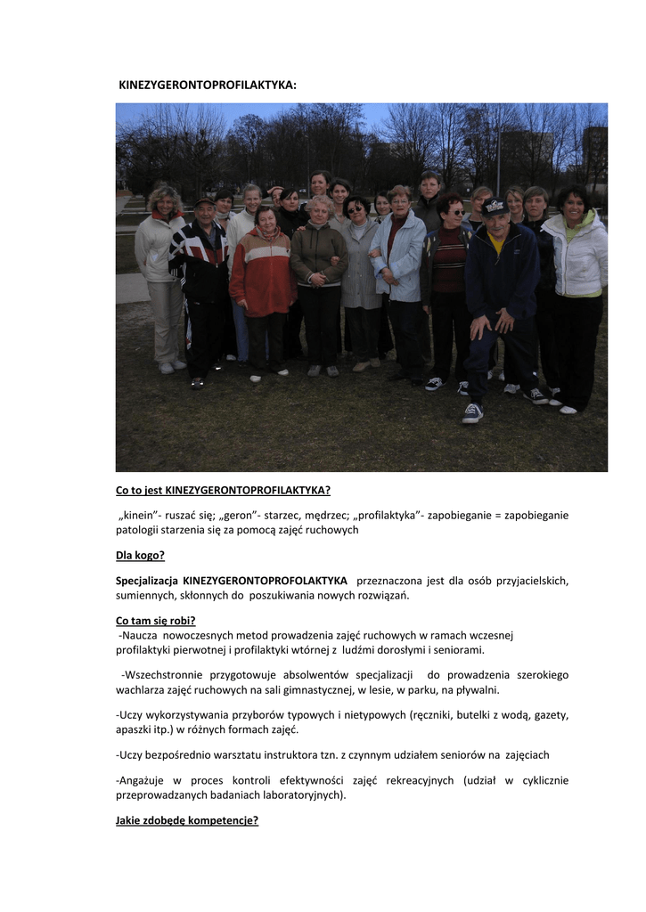 KINEZYGERONTOPROFILAKTYKA: Co to jest KINEZYGERONTOPROFILAKTYKA? „kinein”- ruszać się; „geron”- starzec, mędrzec; „profilaktyka”- zapobieganie = zapobieganie patologii starzenia się za pomocą zajęć ruchowych Dla kogo? Specjalizacja KINEZYGERONTOPROFOLAKTYKA przeznaczona jest dla osób przyjacielskich, sumiennych, skłonnych do poszukiwania nowych rozwiązań. Co tam się robi? -Naucza nowoczesnych metod prowadzenia zajęć ruchowych w ramach wczesnej profilaktyki pierwotnej i profilaktyki wtórnej z ludźmi dorosłymi i seniorami. -Wszechstronnie przygotowuje absolwentów specjalizacji do prowadzenia szerokiego wachlarza zajęć ruchowych na sali gimnastycznej, w lesie, w parku, na pływalni. -Uczy wykorzystywania przyborów typowych i nietypowych (ręczniki, butelki z wodą, gazety, apaszki itp.) w różnych formach zajęć. -Uczy bezpośrednio warsztatu instruktora tzn. z czynnym udziałem seniorów na zajęciach -Angażuje w proces kontroli efektywności zajęć rekreacyjnych (udział w cyklicznie przeprowadzanych badaniach laboratoryjnych). Jakie zdobędę kompetencje? Absolwent specjalizacji uzyska tytuł i uprawnienia KINEZYGERONTOPROFILAKTYKA, które upoważniają do: Instruktora AWFiS – - samodzielnego prowadzenia zajęć ruchowych z szerokiego zakresu ćwiczeń gimnastycznych na sali, w wodzie i na świeżym powietrzu, dla ludzi dorosłych i starszych; -planowania, organizowania i realizacji procesu treningu zdrowotnego z klientem wymagającym szczególnej uwagi- obarczonym ryzykiem/ chorobą cywilizacyjną np. otyłością, nadciśnieniem tętniczym, osteoporozą i.in. Instruktor KINEZYGERONTOPROFILAKTYKI posiada kompetencje samodzielnego programowania i prowadzenia zajęć ruchowych indywidualnych i grupowych dla ludzi w różnym wieku, oraz rzetelnej kontroli ich efektywności. Wyposażamy wszechstronnie instruktora KINEZYGERONTOPROFILAKTYKI, w pożądane na rynku pracy cechy: fachową wiedzę i doświadczenie, sprawność fizyczną i wygląd zewnętrzny. Gdzie znajdę pracę? Instruktor KINEZYGERONTOPROFILAKTYKI znajduje pracę we wszelkiego rodzaju podmiotach, które zajmują się organizacją i zagospodarowaniem wolnego czasu dla ludzi w różnym wieku, m.in. w Uniwersytetach Trzeciego Wieku, TKKF, Domach Dziennego Pobytu, Domach Opieki Społecznej i.in. Szczególnie zachęcamy absolwentów specjalizacji KINEZYGERONTOPROFILAKTYKA, do prowadzenia własnej działalności gospodarczej i wykorzystania w niej wszystkich zdobytych w czasie kształcenia umiejętności. Absolwenci specjalizacji KINEZYGERONTOPROFILAKTYKA potwierdzają, że z powodzeniem odnajdują swoje miejsce na wymagającym rynku pracy starzejącego się społeczeństwa Europy. Opracowała: Prof. nadzw.dr hab. Katarzyna Prusik Kontakt: [email protected] Tel. (58)5547314; AWFiS Gdańsk ul.K.Górskiego1, pok.207