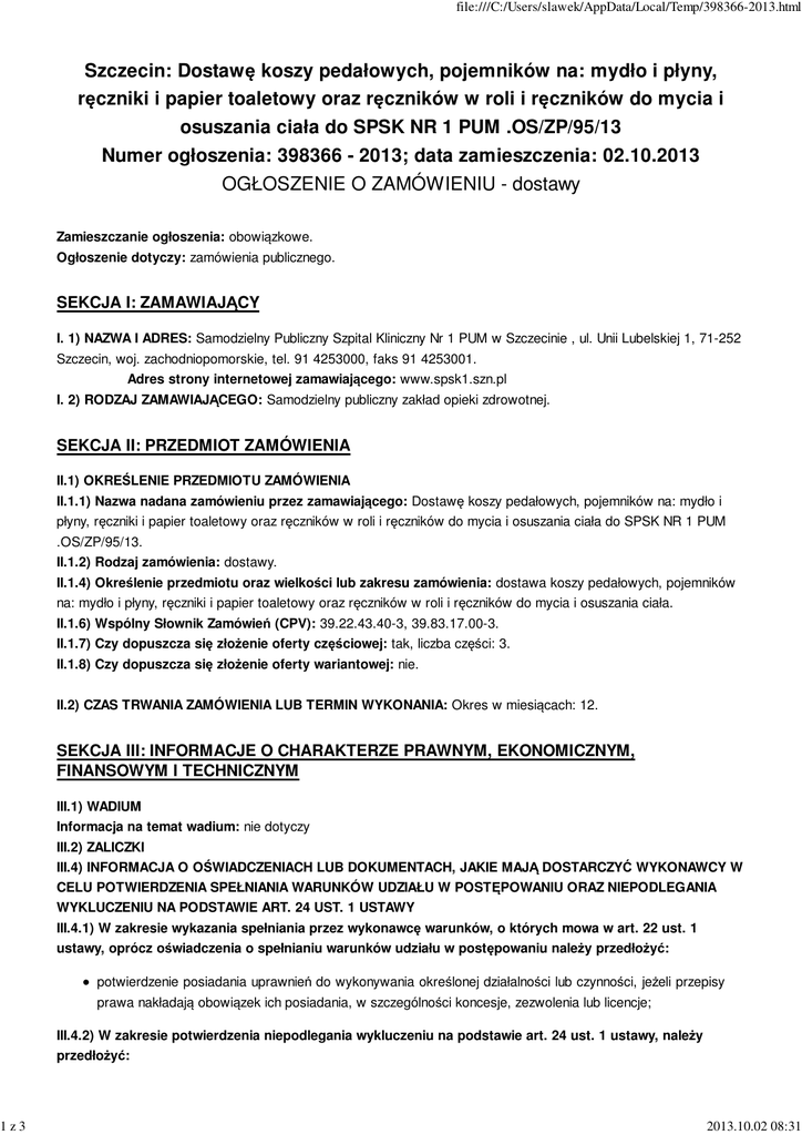 1z3 file:///C:/Users/slawek/AppData/Local/Temp/398366-2013.html Szczecin: Dostawę koszy pedałowych, pojemników na: mydło i płyny, ręczniki i papier toaletowy oraz ręczników w roli i ręczników do mycia i osuszania ciała do SPSK NR 1 PUM .OS/ZP/95/13 Numer ogłoszenia: 398366 - 2013; data zamieszczenia: 02.10.2013 OGŁOSZENIE O ZAMÓWIENIU - dostawy Zamieszczanie ogłoszenia: obowiązkowe. Ogłoszenie dotyczy: zamówienia publicznego. SEKCJA I: ZAMAWIAJĄCY I. 1) NAZWA I ADRES: Samodzielny Publiczny Szpital Kliniczny Nr 1 PUM w Szczecinie , ul. Unii Lubelskiej 1, 71-252 Szczecin, woj. zachodniopomorskie, tel. 91 4253000, faks 91 4253001. Adres strony internetowej zamawiającego: www.spsk1.szn.pl I. 2) RODZAJ ZAMAWIAJĄCEGO: Samodzielny publiczny zakład opieki zdrowotnej. SEKCJA II: PRZEDMIOT ZAMÓWIENIA II.1) OKREŚLENIE PRZEDMIOTU ZAMÓWIENIA II.1.1) Nazwa nadana zamówieniu przez zamawiającego: Dostawę koszy pedałowych, pojemników na: mydło i płyny, ręczniki i papier toaletowy oraz ręczników w roli i ręczników do mycia i osuszania ciała do SPSK NR 1 PUM .OS/ZP/95/13. II.1.2) Rodzaj zamówienia: dostawy. II.1.4) Określenie przedmiotu oraz wielkości lub zakresu zamówienia: dostawa koszy pedałowych, pojemników na: mydło i płyny, ręczniki i papier toaletowy oraz ręczników w roli i ręczników do mycia i osuszania ciała. II.1.6) Wspólny Słownik Zamówień (CPV): 39.22.43.40-3, 39.83.17.00-3. II.1.7) Czy dopuszcza się złożenie oferty częściowej: tak, liczba części: 3. II.1.8) Czy dopuszcza się złożenie oferty wariantowej: nie. II.2) CZAS TRWANIA ZAMÓWIENIA LUB TERMIN WYKONANIA: Okres w miesiącach: 12. SEKCJA III: INFORMACJE O CHARAKTERZE PRAWNYM, EKONOMICZNYM, FINANSOWYM I TECHNICZNYM III.1) WADIUM Informacja na temat wadium: nie dotyczy III.2) ZALICZKI III.4) INFORMACJA O OŚWIADCZENIACH LUB DOKUMENTACH, JAKIE MAJĄ DOSTARCZYĆ WYKONAWCY W CELU POTWIERDZENIA SPEŁNIANIA WARUNKÓW UDZIAŁU W POSTĘPOWANIU ORAZ NIEPODLEGANIA WYKLUCZENIU NA PODSTAWIE ART. 24 UST. 1 USTAWY III.4.1) W zakresie wykazania spełniania przez wykonawcę warunków, o których mowa w art. 22 ust. 1 ustawy, oprócz oświadczenia o spełnianiu warunków udziału w postępowaniu należy przedłożyć: potwierdzenie posiadania uprawnień do wykonywania określonej działalności lub czynności, jeżeli przepisy prawa nakładają obowiązek ich posiadania, w szczególności koncesje, zezwolenia lub licencje; III.4.2) W zakresie potwierdzenia niepodlegania wykluczeniu na podstawie art. 24 ust. 1 ustawy, należy przedłożyć: 2013.10.02 08:31 2z3 file:///C:/Users/slawek/AppData/Local/Temp/398366-2013.html oświadczenie o braku podstaw do wykluczenia; aktualny odpis z właściwego rejestru lub z centralnej ewidencji i informacji o działalności gospodarczej, jeżeli odrębne przepisy wymagają wpisu do rejestru lub ewidencji, w celu wykazania braku podstaw do wykluczenia w oparciu o art. 24 ust. 1 pkt 2 ustawy, wystawiony nie wcześniej niż 6 miesięcy przed upływem terminu składania wniosków o dopuszczenie do udziału w postępowaniu o udzielenie zamówienia albo składania ofert; III.4.4) Dokumenty dotyczące przynależności do tej samej grupy kapitałowej lista podmiotów należących do tej samej grupy kapitałowej w rozumieniu ustawy z dnia 16 lutego 2007 r. o ochronie konkurencji i konsumentów albo informacji o tym, że nie należy do grupy kapitałowej; III.5) INFORMACJA O DOKUMENTACH POTWIERDZAJĄCYCH, ŻE OFEROWANE DOSTAWY, USŁUGI LUB ROBOTY BUDOWLANE ODPOWIADAJĄ OKREŚLONYM WYMAGANIOM W zakresie potwierdzenia, że oferowane roboty budowlane, dostawy lub usługi odpowiadają określonym wymaganiom należy przedłożyć: próbki, opisy lub fotografie produktów, które mają zostać dostarczone, których autentyczność musi zostać poświadczona przez wykonawcę na żądanie zamawiającego; III.6) INNE DOKUMENTY Inne dokumenty niewymienione w pkt III.4) albo w pkt III.5) -próbki- po 1 sztuce z każdej grupy asortymentowej SPEŁNIA/NIE SPEŁNIA SEKCJA IV: PROCEDURA IV.1) TRYB UDZIELENIA ZAMÓWIENIA IV.1.1) Tryb udzielenia zamówienia: przetarg nieograniczony. IV.2) KRYTERIA OCENY OFERT IV.2.1) Kryteria oceny ofert: najniższa cena. IV.4) INFORMACJE ADMINISTRACYJNE IV.4.1) Adres strony internetowej, na której jest dostępna specyfikacja istotnych warunków zamówienia: www.spsk1.szn.pl Specyfikację istotnych warunków zamówienia można uzyskać pod adresem: Samodzielny Publiczny Szpital Kliniczny Nr 1 PUM Ul. Unii Lubelskiej 1 71-252 Szczecin DZIAŁ ZAMÓWIEŃ PUBLICZNYCH. IV.4.4) Termin składania wniosków o dopuszczenie do udziału w postępowaniu lub ofert: 10.10.2013 godzina 08:00, miejsce: Samodzielny Publiczny Szpital Kliniczny Nr 1 PUM Ul. Unii Lubelskiej 1 71-252 Szczecin KANCELARIA DYREKTORA. IV.4.5) Termin związania ofertą: okres w dniach: 30 (od ostatecznego terminu składania ofert). IV.4.17) Czy przewiduje się unieważnienie postępowania o udzielenie zamówienia, w przypadku nieprzyznania środków pochodzących z budżetu Unii Europejskiej oraz niepodlegających zwrotowi środków z pomocy udzielonej przez państwa członkowskie Europejskiego Porozumienia o Wolnym Handlu (EFTA), które miały być przeznaczone na sfinansowanie całości lub części zamówienia: nie ZAŁĄCZNIK I - INFORMACJE DOTYCZĄCE OFERT CZĘŚCIOWYCH CZĘŚĆ Nr: 1 NAZWA: Ręcznik papierowy w roli oraz dzierżawa 146 dozowników do w/w ręcznika. 1) Krótki opis ze wskazaniem wielkości lub zakresu zamówienia: Ręcznik papierowy w roli do wycierania rąk, dwuwarstwowy(połączenie warstwy celulozy z warstwą makulaturową ) o gramaturze min. 41 g/m, długość 150m, szerokość 21 cm, średnica 19 cm, pasujące do dozowników typu Tork Dzierżawa 146 dozowników do w/w ręcznika -2000 szt. 2013.10.02 08:31 3z3 file:///C:/Users/slawek/AppData/Local/Temp/398366-2013.html 2) Wspólny Słownik Zamówień (CPV): 39.22.43.40-3. 3) Czas trwania lub termin wykonania: Okres w 