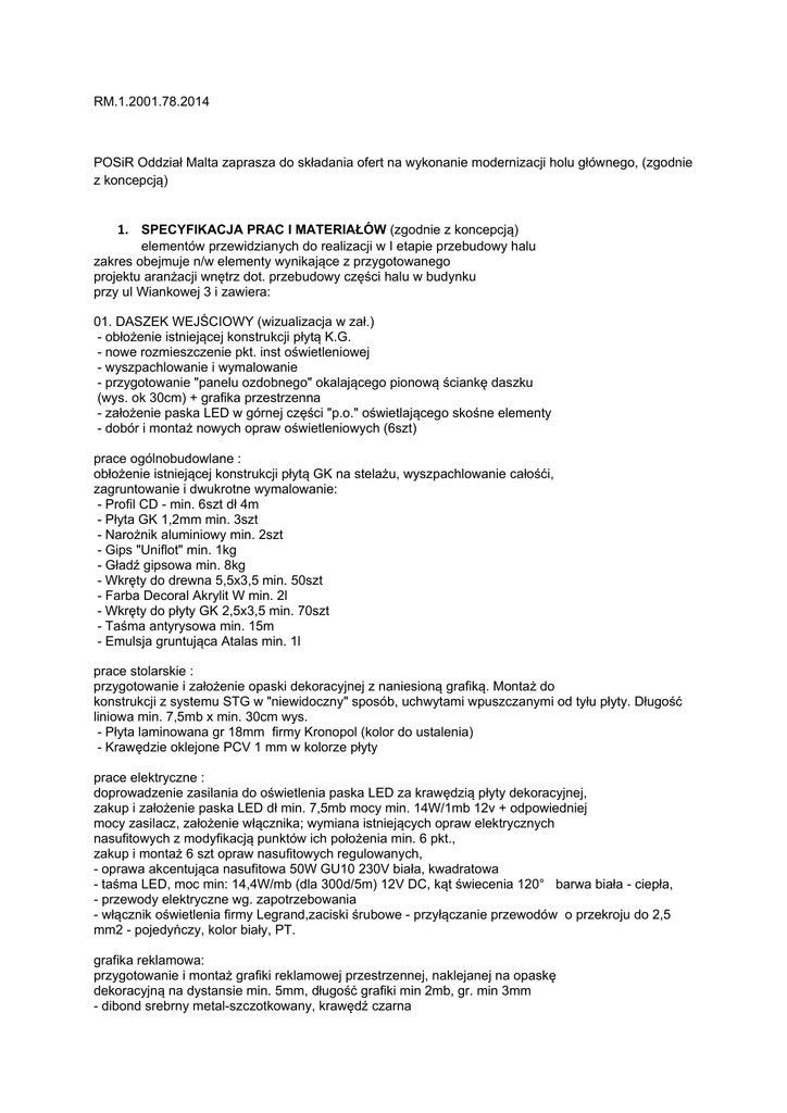 RM.1.2001.78.2014 POSiR Oddział Malta zaprasza do składania ofert na wykonanie modernizacji holu głównego, (zgodnie z koncepcją) 1. SPECYFIKACJA PRAC I MATERIAŁÓW (zgodnie z koncepcją) elementów przewidzianych do realizacji w I etapie przebudowy halu zakres obejmuje n/w elementy wynikające z przygotowanego projektu aranżacji wnętrz dot. przebudowy części halu w budynku przy ul Wiankowej 3 i zawiera: 01. DASZEK WEJŚCIOWY (wizualizacja w zał.) - obłożenie istniejącej konstrukcji płytą K.G. - nowe rozmieszczenie pkt. inst oświetleniowej - wyszpachlowanie i wymalowanie - przygotowanie "panelu ozdobnego" okalającego pionową ściankę daszku (wys. ok 30cm) + grafika przestrzenna - założenie paska LED w górnej części "p.o." oświetlającego skośne elementy - dobór i montaż nowych opraw oświetleniowych (6szt) prace ogólnobudowlane : obłożenie istniejącej konstrukcji płytą GK na stelażu, wyszpachlowanie całośći, zagruntowanie i dwukrotne wymalowanie: - Profil CD - min. 6szt dł 4m - Płyta GK 1,2mm min. 3szt - Narożnik aluminiowy min. 2szt - Gips "Uniflot" min. 1kg - Gładź gipsowa min. 8kg - Wkręty do drewna 5,5x3,5 min. 50szt - Farba Decoral Akrylit W min. 2l - Wkręty do płyty GK 2,5x3,5 min. 70szt - Taśma antyrysowa min. 15m - Emulsja gruntująca Atalas min. 1l prace stolarskie : przygotowanie i założenie opaski dekoracyjnej z naniesioną grafiką. Montaż do konstrukcji z systemu STG w "niewidoczny" sposób, uchwytami wpuszczanymi od tyłu płyty. Długość liniowa min. 7,5mb x min. 30cm wys. - Płyta laminowana gr 18mm firmy Kronopol (kolor do ustalenia) - Krawędzie oklejone PCV 1 mm w kolorze płyty prace elektryczne : doprowadzenie zasilania do oświetlenia paska LED za krawędzią płyty dekoracyjnej, zakup i założenie paska LED dł min. 7,5mb mocy min. 14W/1mb 12v + odpowiedniej mocy zasilacz, założenie włącznika; wymiana istniejących opraw elektrycznych nasufitowych z modyfikacją punktów ich położenia min. 6 pkt., zakup i montaż 6 szt opraw nasufitowych regulowanych, - oprawa akcentująca nasufitowa 50W GU10 230V biała, kwadratowa - taśma LED, moc min: 14,4W/mb (dla 300d/5m) 12V DC, kąt świecenia 120° barwa biała - ciepła, - przewody elektryczne wg. zapotrzebowania - włącznik oświetlenia firmy Legrand,zaciski śrubowe - przyłączanie przewodów o przekroju do 2,5 mm2 - pojedyńczy, kolor biały, PT. grafika reklamowa: przygotowanie i montaż grafiki reklamowej przestrzennej, naklejanej na opaskę dekoracyjną na dystansie min. 5mm, długość grafiki min 2mb, gr. min 3mm - dibond srebrny metal-szczotkowany, krawędź czarna 02. POSTAWIENIE ŚCIANEK ŁUKOWYCH (wizualizacja w zał.) - postawienie ścianek łukowych w systemie STG - dołożenie pkt. gniazd 230v - wyszpachlowanie i wymalowanie w/w ścianek + ściany łukowej łączącej obydwie (wejście do restauracji) prace ogólnobudowlane : wybudowanie łukowych ścianek płytą GK na stelażu (max rozstaw stelaży co 60cm) min. dł. ścianek 2,8mb + 1,14mb X wys min. 2,83m, szerokość ścianek min. 20cm, wypełnienie ścian wełną mineralną gr min. 10cm X 2 wyszpachlowanie całośći, zagruntowanie i dwukrotne wymalowanie (pow. min. 50m2), wyszukanie materiału (jak istniejące - w kolorze i trwałości - marmur) oraz przygotowanie cokołów po obwodzie nowych ścian, wys min. 7cm - Profil C50 - min. 20szt dł 3m - ProfilU50 - min. 2 szt dł 4m - Płyta GK 1,2mm min. 4szt - Wełna ISOVER AKU-PŁYTA grubość 10 cm lambda 0,037 - Narożnik aluminiowy min. 4szt - Gips "Uniflot" min. 5kg - Gładź gipsowa min. 15kg - Wkręty do płyty GK 2,5x3,5 min. 150szt - Farba Decoral Akrylit W min. 3l kolor do ustalenia - Kołek rozporowy 80x60 min 20szt - Taśma antyrysowa min. 25m - Emulsja gruntująca Atalas min. 1l prace elektryczne : przygotowanie pkt. gniazd 230v (3szt) , doprowadzenie do nich przewodów, osadzenie puszek do systemu STG, montaż opraw. - gniazda podwójne firmy Legrand 2x2P+Z z uziemieniem 16A, 250V IP20, zaciski śrubowe, przyłączanie przewodów o przekroju do 2,5 mm2, kolor biały, PT. - przewody elektryczne wg. zapotrzebowania 03. PRZEBUDOWA PORTIERNII -12,5m2 + ścianki obłożone GK bez stelaża 16m2 (wizualizacja w zał.) - likwidacja istniejącej zabudowy drewnianej - wykucie nowego otworu wejściowego - przełożenie grzejnika - postawienie ścianek STG zamykających strefę monitorów - zamknięcie ścianą STG istniejącego wejścia do portierni - przygotowanie wnęki pod szafę wewnątrz portierni - dobudowanie ścianki STG do istniejącego narożnika - zabudowa obniżonego sufitu podwieszanego STG- obłożenie ścian płytą GK bez stelaża - ułożenie nowej wykładziny - przełożenie i rozmieszczenie gniazd 230v - rozmieszczenie pkt. inst. oświetleniowej + montaż opraw - montaż wieszaków do monitorów - przygotowanie kanałów podłączeń komp. z monitorami - wyszpachlowanie i pomalowanie całości - przygotowanie zabudowy meblowej (lady, regałów, szaf...etc wg. projektu) - przygotowanie i montaż tablicy reklamowej w postaci kasetonu - dobór i osadzenie nowych drzwi do portiernii prace ogólnobudowlane : wyburzenie istniejących elementów drewnianych i innych, przygotowanie otworu pod nowe drzwi, przesunięcie istniejącego grzejnika C.O., postawienie ścianek w systemie STG wypełnienie ścian wełną mineralną gr min. 10cm, (rozstaw profili nie mniej niż co 60cm), obłożenie niezabudowywanych ścian płytą GK, montaż sufitu podwieszanego z płyty GK (rozstaw profili nie mniej niż co 40cm), wyszpachlowanie całośći, zagruntowanie i dwukrotne wymalowanie, montaż wieszaków do monitorów, położenie nowej wykładziny na całośći portiernii bez łączeń, montaż "cokołów" listwa z polistyrenu utwardzonego pokrytego specjalną okleiną w kolorze srebrnym szczotkowanym, montaż za pomocą kleju montażowego i piły kątowej - Profil CD60 - min. 13szt dł 4m - ProfilUD27 - min. 4 szt dł 4m - Wieszak esp min. 15s