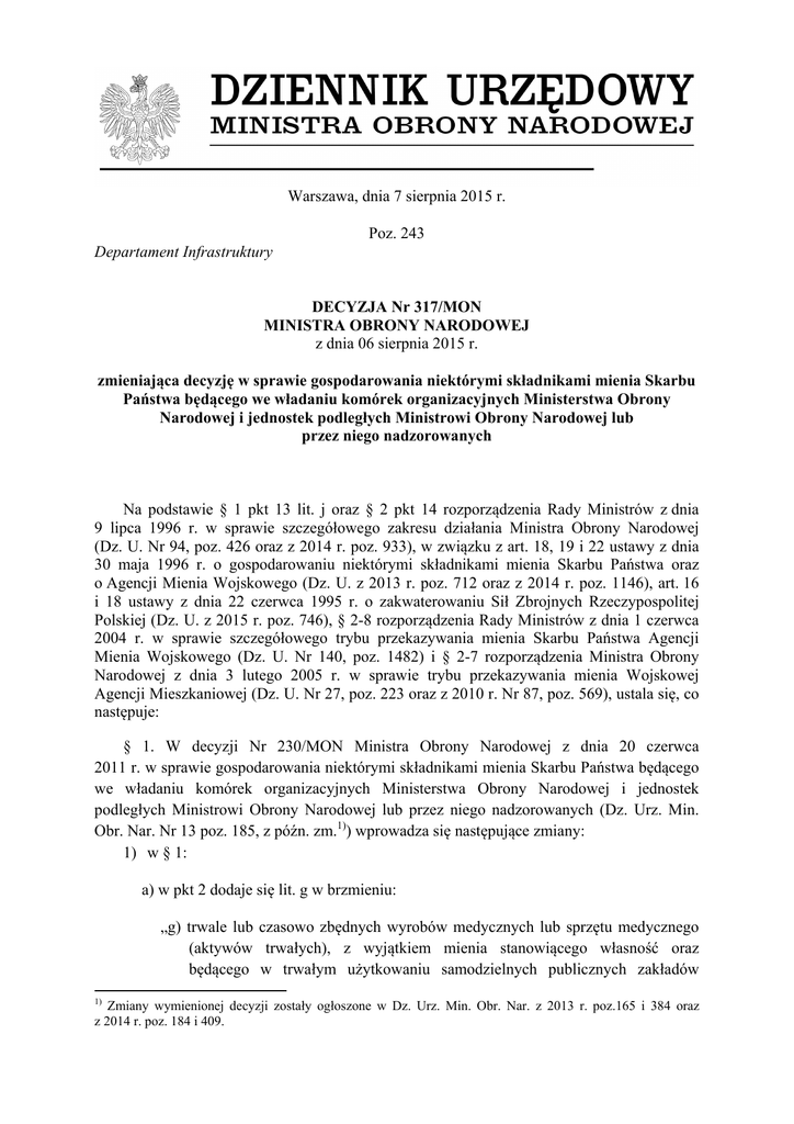 Warszawa, dnia 7 sierpnia 2015 r. Poz. 243 Departament Infrastruktury DECYZJA Nr 317/MON MINISTRA OBRONY NARODOWEJ z dnia 06 sierpnia 2015 r. zmieniająca decyzję w sprawie gospodarowania niektórymi składnikami mienia Skarbu Państwa będącego we władaniu komórek organizacyjnych Ministerstwa Obrony Narodowej i jednostek podległych Ministrowi Obrony Narodowej lub przez niego nadzorowanych Na podstawie § 1 pkt 13 lit. j oraz § 2 pkt 14 rozporządzenia Rady Ministrów z dnia 9 lipca 1996 r. w sprawie szczegółowego zakresu działania Ministra Obrony Narodowej (Dz. U. Nr 94, poz. 426 oraz z 2014 r. poz. 933), w związku z art. 18, 19 i 22 ustawy z dnia 30 maja 1996 r. o gospodarowaniu niektórymi składnikami mienia Skarbu Państwa oraz o Agencji Mienia Wojskowego (Dz. U. z 2013 r. poz. 712 oraz z 2014 r. poz. 1146), art. 16 i 18 ustawy z dnia 22 czerwca 1995 r. o zakwaterowaniu Sił Zbrojnych Rzeczypospolitej Polskiej (Dz. U. z 2015 r. poz. 746), § 2-8 rozporządzenia Rady Ministrów z dnia 1 czerwca 2004 r. w sprawie szczegółowego trybu przekazywania mienia Skarbu Państwa Agencji Mienia Wojskowego (Dz. U. Nr 140, poz. 1482) i § 2-7 rozporządzenia Ministra Obrony Narodowej z dnia 3 lutego 2005 r. w sprawie trybu przekazywania mienia Wojskowej Agencji Mieszkaniowej (Dz. U. Nr 27, poz. 223 oraz z 2010 r. Nr 87, poz. 569), ustala się, co następuje: § 1. W decyzji Nr 230/MON Ministra Obrony Narodowej z dnia 20 czerwca 2011 r. w sprawie gospodarowania niektórymi składnikami mienia Skarbu Państwa będącego we władaniu komórek organizacyjnych Ministerstwa Obrony Narodowej i jednostek podległych Ministrowi Obrony Narodowej lub przez niego nadzorowanych (Dz. Urz. Min. Obr. Nar. Nr 13 poz. 185, z późn. zm.1)) wprowadza się następujące zmiany: 1) w § 1: a) w pkt 2 dodaje się lit. g w brzmieniu: „g) trwale lub czasowo zbędnych wyrobów medycznych lub sprzętu medycznego (aktywów trwałych), z wyjątkiem mienia stanowiącego własność oraz będącego w trwałym użytkowaniu samodzielnych publicznych zakładów 1) Zmiany wymienionej decyzji zostały ogłoszone w Dz. Urz. Min. Obr. Nar. z 2013 r. poz.165 i 384 oraz z 2014 r. poz. 184 i 409. opieki zdrowotnej, dla których organem tworzącym jest Minister Obrony Narodowej;”, b) uchyla się pkt 4; 2) w § 2 pkt 2 otrzymuje brzmienie: „2) komórki i jednostki nie sporządzające planów, prowadzące ewidencję ilościowowartościową mienia ruchomego trwale lub czasowo zbędnego zgłaszają odpowiednio: Dyrektorowi Generalnemu Ministerstwa Obrony Narodowej, Szefowi Inspektoratu Wsparcia Sił Zbrojnych, Dyrektorowi Departamentu Administracyjnego, Szefowi Służby Kontrwywiadu Wojskowego i Szefowi Służby Wywiadu Wojskowego, propozycje do planów w zakresie określonym w § 1 pkt 1, pkt 2 lit. a-d oraz pkt 3-6, natomiast szefom rejonowych organów infrastruktury propozycje do planów, w zakresie określonym w § 1 pkt 8;”; 3) w § 29 w pkt 2: a) lit. a otrzymuje brzmienie: „a) Prezes AMW do dnia 31 marca sporządza za rok poprzedni sprawozdanie opracowane na podstawie art. 14 ustawy z dnia 30 maja 1996 r. o gospodarowaniu niektórymi składnikami mienia Skarbu Państwa oraz o Agencji Mienia Wojskowego, którego oryginał przesyła osobie zajmującej kierownicze stanowisko Ministerstwa Obrony Narodowej właściwej do spraw infrastruktury a kopie sprawozdania przesyła do wiadomości Szefa Sztabu Generalnego Wojska Polskiego, Szefa Inspektoratu Wsparcia Sił Zbrojnych i Szefa Inspektoratu Systemów Informacyjnych,”, b) uchyla się lit. b, c) lit. c otrzymuje brzmienie: „c) Szef Inspektoratu Wsparcia Sił Zbrojnych w terminie do dziesiątego dnia każdego miesiąca przedkłada osobie zajmującej kierownicze stanowisko Ministerstwa Obrony Narodowej właściwej do spraw infrastruktury oraz do wiadomości Szefowi Sztabu Generalnemu Wojska Polskiego, raport o stanie realizacji w Siłach Zbrojnych Rzeczypospolitej Polskiej planów przekazywania AMW zbędnego mienia ruchomego.”; 4) użyte w § 4 w ust. 1 w lit. a oraz w ust. 2 w pkt 1 w lit. b oraz w § 14 w ust. 3 w różnej liczbie i przypadku wyrazy „Dyrektor Departamentu Wychowania i Promocji Obronności” zastępuje się użytymi w odpowiedniej liczbie i przypadku wyrazami „Dyrektor Departamentu Komunikacji Społecznej”. § 2. Decyzja wchodzi w życie z dniem ogłoszenia. Minister Obrony Narodowej: T. Siemoniak