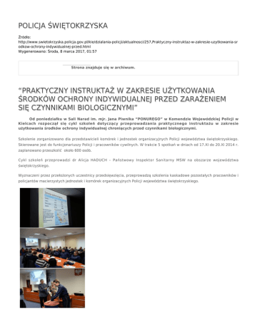 POLICJA ŚWIĘTOKRZYSKA Źródło: http://www.swietokrzyska.policja.gov.pl/kie/dzialania-policji/aktualnosci/257,Praktyczny-instruktaz-w-zakresie-uzytkowania-sr odkow-ochrony-indywidualnej-przed.html Wygenerowano: Środa, 8 marca 2017, 01:57 Strona znajduje się w archiwum. “PRAKTYCZNY INSTRUKTAŻ W ZAKRESIE UŻYTKOWANIA ŚRODKÓW OCHRONY INDYWIDUALNEJ PRZED ZARAŻENIEM SIĘ CZYNNIKAMI BIOLOGICZNYMI” Od poniedziałku w Sali Narad im. mjr. Jana Piwnika “PONUREGO” w Komendzie Wojewódzkiej Policji w Kielcach rozpoczął się cykl szkoleń dotyczący przeprowadzania praktycznego instruktażu w zakresie użytkowania środków ochrony indywidualnej chroniących przed czynnikami biologicznymi. Szkolenie zorganizowano dla przedstawicieli komórek i jednostek organizacyjnych Policji województwa świętokrzyskiego. Skierowane jest do funkcjonariuszy Policji i pracowników cywilnych. W trakcie 5 spotkań w dniach od 17.XI do 20.XI 2014 r. zaplanowano przeszkolić około 600 osób. Cykl szkoleń przeprowadzi dr Alicja HADUCH – Państwowy Inspektor Sanitarny MSW na obszarze województwa świętokrzyskiego. Wyznaczeni przez przełożonych uczestnicy przedsięwzięcia, przeprowadzą szkolenia kaskadowe pozostałych pracowników i policjantów macierzystych jednostek i komórek organizacyjnych Policji województwa świętokrzyskiego. Ocena: 0/5 (0) Tweetnij