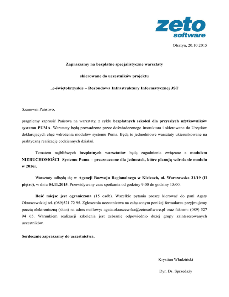 Olsztyn, 20.10.2015 Zapraszamy na bezpłatne specjalistyczne warsztaty skierowane do uczestników projektu „e-świętokrzyskie – Rozbudowa Infrastruktury Informatycznej JST Szanowni Państwo, pragniemy zaprosić Państwa na warsztaty, z cyklu bezpłatnych szkoleń dla przyszłych użytkowników systemu PUMA. Warsztaty będą prowadzone przez doświadczonego instruktora i skierowane do Urzędów deklarujących chęć wdrożenia modułów systemu Puma. Będą to jednodniowe warsztaty ukierunkowane na praktyczną realizację codziennych działań. Tematem najbliższych bezpłatnych warsztatów będą zagadnienia związane z modułem NIERUCHOMOŚCI Systemu Puma – przeznaczone dla jednostek, które planują wdrożenie modułu w 2016r. Warsztaty odbędą się w Agencji Rozwoju Regionalnego w Kielcach, ul. Warszawska 21/19 (II piętro), w dniu 04.11.2015. Przewidywany czas spotkania od godziny 9:00 do godziny 15:00. Ilość miejsc jest ograniczona (15 osób). Wszelkie pytania proszę kierować do pani Agaty Okraszewskiej tel. (089)521 72 95. Zgłoszenia uczestnictwa na załączonym poniżej formularzu przyjmujemy pocztą elektroniczną (skan) na adres mailowy: [email protected] oraz faksem: (089) 527 94 65. Warunkiem realizacji szkolenia jest zebranie odpowiednio dużej grupy zainteresowanych uczestników. Serdecznie zapraszamy do uczestnictwa. Krystian Władziński Dyr. Ds. Sprzedaży Agenda spotkania: NIERUCHOMOŚCI 1. Omówienie importu danych z pliku SWDE z Ewidencji Gruntów i Budynków /czynności przygotowawcze do przeprowadzenia migracji, weryfikacja danych po migracji/ 2. Dodawanie i modyfikowanie jednostek gruntowych w Ewidencji Gruntów i Budynków /przygotowanie danych do rejestracji bilansu otwarcia umów użytkowania wieczystego/ 3. Operacje na gruntach w Ewidencji Gruntów i Budynków /Historia na działce, podział działki, zmiana jednostki rejestrowej, zmiana właściciela, zmiana władającego/ 4. Rejestracja i modyfikacja umów użytkowania wieczystego 5. Rejestracja i modyfikacja umów dzierżawy gruntu, dzierżaw reklamowych i dzierżaw bezumownych 6. Rejestracja i modyfikacja umów trwałego zarządu 7. Naliczanie i zatwierdzanie przypisów 8. Generowanie faktur 9. Prezentacja danych w Windykacji, module Kasa i module Finanse i Księgowość Formularz zgłoszeniowy na warsztaty organizowane przez ZETO Software Wypełniony i podpisany formularz prosimy przesłać faksem na numer (089) 527 94 65, pocztą elektroniczną na adres [email protected] lub pocztą tradycyjną na adres ZETO Software Sp. z o.o., ul. Seweryna Pieniężnego 6/7, 10-005 Olsztyn Zgłaszający (nazwa lub pieczęć urzędu lub jednostki):____________________________________ ________________________________________________________________________________ ________________________________________________________________________________ Data szkolenia: Tematyka / nazwa szkolenia: Imiona i nazwiska osób zgłaszanych na szkolenie:________________________________________ ________________________________________________________________________________ ________________________________________________________________________________ ________________________________________________________________________________ Telefon kontaktowy:_______________________________________________________________ Skąd dowiedziała się Pani / Pan o naszych szkoleniach?:___________________________________ ________________________________________________________________________________ ________________________________________________________________________________ Dlaczego chce Pani / Pan uczestniczyć w wybranym szkoleniu?:____________________________ ________________________________________________________________________________ ________________________________________________________________________________ _________________________ czytelny podpis zgłaszającego W przypadku jakichkolwiek pytań związanych ze szkoleniami prosimy kontaktować się pod telefonem (089)521 72 95 z Agatą Okraszewską ([email protected]). Pozdrawiamy serdecznie i zapraszamy Państwa do uczestnictwa