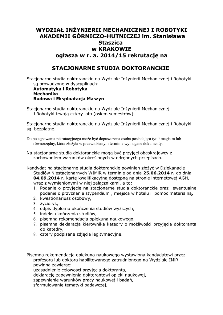 WYDZIAŁ INŻYNIERII MECHANICZNEJ I ROBOTYKI AKADEMII GÓRNICZO-HUTNICZEJ im. Stanisława Staszica w KRAKOWIE ogłasza w r. a. 2014/15 rekrutację na STACJONARNE STUDIA DOKTORANCKIE Stacjonarne studia doktoranckie na Wydziale Inżynierii Mechanicznej i Robotyki są prowadzone w dyscyplinach: Automatyka i Robotyka Mechanika Budowa i Eksploatacja Maszyn Stacjonarne studia doktoranckie na Wydziale Inżynierii Mechanicznej i Robotyki trwają cztery lata (osiem semestrów). Stacjonarne studia doktoranckie na Wydziale Inżynierii Mechanicznej i Robotyki są bezpłatne. Do postępowania rekrutacyjnego może być dopuszczona osoba posiadająca tytuł magistra lub równorzędny, która złożyła w przewidzianym terminie wymagane dokumenty. Na stacjonarne studia doktoranckie mogą być przyjęci obcokrajowcy z zachowaniem warunków określonych w odrębnych przepisach. Kandydat na stacjonarne studia doktoranckie powinien złożyć w Dziekanacie Studiów Niestacjonarnych WIMiR w terminie od dnia 25.06.2014 r. do dnia 04.09.2014 r. kartę kwalifikacyjną dostępną na stronie internetowej AGH, wraz z wymienionymi w niej załącznikami, a to: 1. Podanie o przyjęcie na stacjonarne studia doktoranckie oraz ewentualne podanie o przyznanie stypendium , miejsca w hotelu i pomoc materialną, 2. kwestionariusz osobowy, 3. życiorys, 4. odpis dyplomu ukończenia studiów wyższych, 5. indeks ukończenia studiów, 6. pisemna rekomendacja opiekuna naukowego, 7. pisemna deklaracja kierownika katedry o możliwości przyjęcia doktoranta do katedry, 8. cztery podpisane zdjęcia legitymacyjne. Pisemna rekomendacja opiekuna naukowego wystawiona kandydatowi przez profesora lub doktora habilitowanego zatrudnionego na Wydziale IMiR powinna zawierać: uzasadnienie celowości przyjęcia doktoranta, deklarację zapewnienia doktorantowi opieki naukowej, zapewnienie warunków pracy naukowej i badań, sformułowanie tematyki badawczej, źródło i zasady finansowania pracy badawczej doktoranta, zapewnienie minimalnego wymiaru zajęć dydaktycznych (30 godz.) prowadzonych przez doktoranta. Kolokwium kwalifikacyjne odbędzie się w dniu 10.09.2014 r. O godzinie i miejscu kolokwium zainteresowani zostaną powiadomieni w odrębnym komunikacie. Kandydat na studia doktoranckie zdaje w ramach kolokwium kwalifikacyjnego egzamin z zagadnień dotyczących matematyki, fizyki, mechaniki, oraz dodatkowo: - w dyscyplinie Automatyka i Robotyka z teorii sterowania, - w dyscyplinach: Mechanika oraz Budowa i Eksploatacja Maszyn z wytrzymałości materiałów. Egzamin przeprowadza się także z wybranego języka obcego. Ocenie Komisji podlegają również predyspozycje kandydata do pracy naukowej. Decyzję w sprawie przyjęcia na studia doktoranckie podejmuje Wydziałowa Doktorancka Komisja Rekrutacyjna Od decyzji Wydziałowej Komisji Rekrutacyjnej służy odwołanie w terminie 14 dni od daty doręczenia decyzji do Uczelnianej Doktoranckiej Komisji Rekrutacyjnej powołanej przez Senat. Podstawą odwołania może być jedynie wskazanie naruszenia uchwalonych przez Senat warunków i trybu rekrutacji. Decyzję podejmuje Rektor po rozpatrzeniu wniosku Komisji. Decyzja Rektora jest ostateczna. Przebieg i warunki studiów doktoranckich na Wydziale Inżynierii Mechanicznej i Robotyki podlegają postanowieniom Regulaminu Stacjonarnych Studiów Doktoranckich w AGH. Dodatkowych informacji i wyjaśnień udziela Kierownik Studiów Doktoranckich na Wydziale Inżynierii Mechanicznej i Robotyki prof. dr hab. inż. A. Świątoniowski. [budynek B-4, 3-piętro, pokój 306, tel.617 31-07, e-mail: [email protected]} oraz Dziekanat Studiów Niestacjonarnych Wydziału IMiR – B2 parter p.1