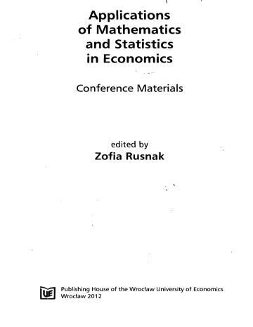 Applications of Mathematics and Statistics in Economics Conference Materials edited by Zofia Rusnak Publishing House of the Wroctaw University of Economics Wroctaw 2012 Contents Preface 11 In memoriam JiriTresl (1947-2011) Marek Biernacki, Wiktor Ejsmont: The dynamics of the effectiveness of teaching at secondary schools in Wroclaw, 2004-2011 Dagmar Blatna: Robust bootstrapping in regression Martin Bod'a, Janka Butkova, Viera Rohacova: Evaluation of efficiency of health care providers in the Slovak Republic and the Czech Republic Martin Bod'a, Maria Kanderova: Utilization of Monte Carlo simulations in financial planning Martin Bod'a, Viera Rohacova: Changes in the monetary aspects of the economic processes in the Slovak Republic as a consequence of entering the Economic and Monetary Union :.. Adam Cabla: Modeling of household incomes in the Czech Republic Anton Dekret, Rudolf Zimka: On intergenerational equity in economy with non-renewable resources Tomas Fiala, Jitka Langhamrova, Zdenek Pavlik: A prognosis of the human capital of the population of the Czech Republic Jaroslav Sixta, Jakub Fischer: Macroeconomic statistics for the Czech Republic 1970-1990 Jolana Gubalova: Data analysis of MBU students using Business Intelligence tools in SQL Server ; Jan Hrevus: Fitting exposure curves and non-linear regression Miroslav Huzvar, Zuzana Rigova: Personnel demands of study programmes at universities Alena Kascakova, Gabriela Nedelova: Regional differences in the economy of Slovak households Monika Magyarics: Facebook - one of the most populous "countries" in the world Katarina Makovinyiova, Rudolf Zimka: On transformation of an open economy model to its normal form on centre manifold with two free parameters Ivana Mala: Conditional distributions of finite mixtures of probability distributions Peter Malicky, Rudolf Zimka: On the equilibrium stability in a two-regional model under flexible exchange rates 15 17 28 42 52 65 81 96 106 116 125 132 141 149 161 173 181 196 8 Contents Petr Mazouch, Ludmila Petkovova: Causes and consequences of economic inactivity in the Czech Republic Martina Simkova, Petr Mazouch: The projection of economically active population of the Czech Republic Lenka Lasova, Maria Stachova, Pavol Krai: Visual data mining using R... Viera Tomisova: Use of enterprise information systems for decision support process in Slovakia Jiri Tresl: PX index: Markov chains and level-crossing analysis Vladimir Uradnicek, Emilia Zimkova: Macroeconomic and quality of life development in selected countries of an integrated Europe 212 221 231 257 267 277 Streszczenia Marek Biernacki, Wiktor Ejsmont: Dynamiczna zmiana wskaznikow efektywnosci nauczania na przyktadzie wroctawskich liceow w latach 2004-2011 Dagmar Blatna: Odporne metody bootstrapowe w regresji Martin Bod'a, Janka Butkova, Viera Rohacova: Ocena efektywnosci shazby zdrowia w Republikach Stowackiej i Czeskiej Martin Bod'a, Maria Kanderova: Wykorzystanie symulacji Monte Carlo w planowaniu finansowym Martin Bod'a, Viera Rohacova: Monetarne aspekty procesow gospodarczych w Republice Stowackiej i ich zmiany wywolane przystaj>ieniem do unii ekonomicznej i monetarnej Adam Cabla: Modelowanie dochodow gospodarstw domowych w Republice Czeskiej Anton Dekret, Rudolf Zimka: Mi^dzypokoleniowa sprawiedliwosc w gospodarowaniu nieodnawialnymi zasobami Tomas Fiala, Jitka Langhamrova, Zdenek Pavlik: Prognoza wielkosci kapitalu ludzkiego w popiilacji Republiki Czeskiej Jaroslav Sixta, Jakub Fischer: Statystyki makroekonomiczne Republiki Czeskiej w latach 1970-1990 Jolana Gubalova: Analiza danych o studentach MBU z zastosowaniem metod Business Intelligence w SQL Server Jan Hrevus: Dopasowanie krzywych ryzyka i regresja nieliniowa Miroslav Huzvar, Zuzana Rigova: Potrzeby personelu uniwersyteckiego w kontekscie programu studiow Alena Kascakova, Gabriela Nedelova: Zroznicowanie regionalne sytuacji ekonomicznej slowackich gospodarstw domowych Monika Magyarics: Facebook-jeden z najbardziej zaludnionych ,,krajow" na swiecie 27 41 51 64 80 95 105 115 124 131 140 148 160 172 Contents Katarina Makovinyiova, Rudolf Zimka: Transformacja modelu otwartej ekonomii do normalnej postaci wielostronnego centrum z dwoma wolnymi parametrami Ivana Mala: Rozklady warunkowe mieszanki skonczonej liczby rozktadow prawdopodobienstw Peter Malicky, Rudolf Zimka: Stabilnosc rownowagi w dwuregionalnym modelu przy zalozeniu elastycznych kursow wymiany Petr Mazouch, Ludmila Petkovova: Przyczyny i konsekwencje braku aktywnosci zawodowej w Republice Czeskiej.. Martina Simkova, Petr Mazouch: Prognoza liczby osob aktywnych zawodowo w Republice Czeskiej Lenka Lasova, Maria Stachova, Pavol Krai: Wizualizacja analizy danych (wybierania danych) z wykorzystaniem programu R Viera Tomisova: Zastosowanie systemu informacyjnego przedsi^biorstwa do wspomagania procesu podejmowania decyzji na Stowacji Jifi Tresl: Indeks PX: tancuch Markova i analiza level-crossing Vladimir IFradnicek, Emilia Zimkova: Rozwqj makroekonomiczny i jakosci zycia w wybranych krajach.zintegrowanej Europy 180 195 211 220 230 256 266 276 288