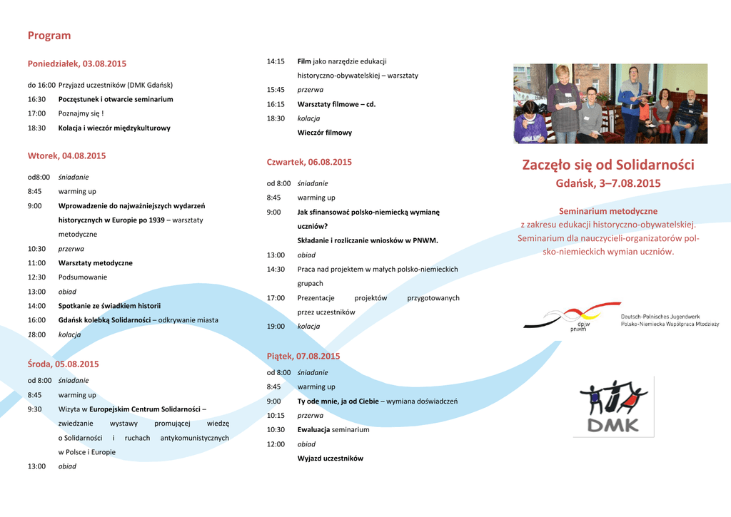 Program 14:15 Poniedziałek, 03.08.2015 Film jako narzędzie edukacji historyczno-obywatelskiej – warsztaty do 16:00 Przyjazd uczestników (DMK Gdańsk) 16:30 Poczęstunek i otwarcie seminarium 17:00 Poznajmy się ! 18:30 Kolacja i wieczór międzykulturowy 15:45 przerwa 16:15 Warsztaty filmowe – cd. 18:30 kolacja Wieczór filmowy Wtorek, 04.08.2015 od8:00 śniadanie 8:45 warming up 9:00 Wprowadzenie do najważniejszych wydarzeń 8:45 warming up 9:00 Jak sfinansować polsko-niemiecką wymianę uczniów? metodyczne Składanie i rozliczanie wniosków w PNWM. 10:30 przerwa 11:00 Warsztaty metodyczne 12:30 Podsumowanie 13:00 obiad 14:00 Spotkanie ze świadkiem historii 16:00 Gdańsk kolebką Solidarności – odkrywanie miasta 18:00 kolacja 14:30 Praca nad projektem w małych polsko-niemieckich Prezentacje projektów przygotowanych przez uczestników 19:00 kolacja Piątek, 07.08.2015 od 8:00 śniadanie 8:45 warming up 9:30 Wizyta w Europejskim Centrum Solidarności – wystawy i w Polsce i Europie obiad obiad 17:00 od 8:00 śniadanie 13:00 13:00 grupach Środa, 05.08.2015 o Solidarności Gdańsk, 3–7.08.2015 od 8:00 śniadanie historycznych w Europie po 1939 – warsztaty zwiedzanie Zaczęło się od Solidarności Czwartek, 06.08.2015 ruchach promującej wiedzę antykomunistycznych 8:45 warming up 9:00 Ty ode mnie, ja od Ciebie – wymiana doświadczeń 10:15 przerwa 10:30 Ewaluacja seminarium 12:00 obiad Wyjazd uczestników Seminarium metodyczne z zakresu edukacji historyczno-obywatelskiej. Seminarium dla nauczycieli-organizatorów polsko-niemieckich wymian uczniów. Polsko-Niemiecka Współpraca Młodzieży (PNWM) oraz Dom Pojednania i Spotkań im. św. M. M. Kolbego (DMK) zapraszają Państwa serdecznie do udziału w seminarium: Zaczęło się od Solidarności „Solidarność”, upadek Muru Berlińskiego, koniec PRL i NRD, dążenie do wolności, proces transformacji ustrojowej oraz najnowsza historia – jak wykorzystać te tematy jako element programu polsko-niemieckiej wymiany uczniów? Czy warto poznawać i jak wspólnie, w polsko-niemieckiej grupie młodzieży, analizować przemiany ustrojowe, które dokonały się w Europie pod koniec XX w.? Podczas seminarium uczestnikom przedstawione zostaną metody pracy warsztatowej do wykorzystania podczas realizacji polsko-niemieckich projektów szkolnych. Omówione zostaną również najnowsze tematy z historii Polski, Niemiec i Europy. Seminarium adresujemy do polskich i niemieckich nauczycieli ze szkół partnerskich, realizujących wspólne polskoniemieckie programy. Tematy i metody Wiedza o faktach historycznych Miejsca związane z transformacją ustrojową oraz oferta edukacyjna różnych instytucji Film jako narzędzie edukacyjne Spotkanie ze świadkiem historii jako źródło wiedzy historycznej Wskazówki metodyczne do realizacji własnych projektów Praca nad wspólnym projektem Czas na wymianę doświadczeń Zgłoszenie Zgłoszenia online (wiki.dpjw.org/webform/de/node/162) wraz z podaniem danych niemieckiej szkoły partnerskiej przyjmujemy do dn. 17.04.2015 r. Jeżeli z jednej szkoły zgłosi się więcej niż jedna osoba, prosimy o zaznaczenie, w jakiej kolejności miałby zostać dokonany wybór. W przypadku dużej liczby zgłoszeń będziemy zmuszeni ograniczyć liczbę uczestników z jednej szkoły. Informację o przyjęciu na szkolenie lub odmowę otrzymają Państwo tylko i wyłącznie drogą mailową najpóźniej 24.04.2015 r. Dlatego konieczne jest podanie adresu mailowego na formularzu zgłoszenia. WAŻNE! W pierwszej kolejności uwzględniane będą zgłoszenia partnerstw polsko-niemieckich, czyli wtedy, gdy osoba ze szkoły partnerskiej także prześle swoje zgłoszenie. Jeżeli pozostaną wolne miejsca, rozdysponujemy je pomiędzy osobami bez zgłoszonego partnera. Prosimy, aby na seminarium zgłaszały się jedynie te osoby, które mogą uczestniczyć we wszystkich punktach programu, od poniedziałku do piątku włącznie. Tak też prosimy zaplanować swoją podróż. Wcześniejszy wyjazd lub późniejszy przyjazd (bez uprzedniej zgody PNWM) skutkować będzie dodatkową opłatą w wysokości 200 PLN, którą Państwa obciążymy po szkoleniu. Ponadto zaświadczenia o ukończeniu szkolenia wydamy jedynie osobom, które pozostaną do końca szkolenia. UWAGA: Program seminarium nie przewiduje czasu na zwiedzanie Gdańska. Mogą to Państwo uczynić we własnym zakresie przed lub po programie. Prowadzący program Wszystkim punktom programu towarzyszyć będą wyspecjalizowani referenci (np. z DMK) Czego mogą Państwo od nas oczekiwać? Kompetentnych i doświadczonych prowadzących. Szanujemy różnice, moderujemy i prowadzimy projekt razem tam, gdzie tylko jest to możliwe. Pracy w formie warsztatów a nie wykładów. Umożliwiamy wypowiadanie się i dyskusje na podstawie Państwa pedagogicznych kompetencji i doświadczeń. Możliwość zadawania trudnych pytań i mierzenia się z nimi pod okiem i przy wsparciu prowadzących. Termin i miejsce 3–7 sierpnia 2015r. Dom Pojednania i Spotkań im. św. M. M. Kolbego (DMK) ul. Świętej Trójcy 4, 80-822 Gdańsk, www.dmk.pl Organizator Polsko-Niemiecka Współpraca Młodzieży (PNWM) we współpracy z Domem Pojednania i Spotkań im. św. M. M. Kolbego (DMK) Osoby kontaktowe w DMK: Jakub Garsta ([email protected]) Agnieszka Błaszczak ([email protected]) tel: +48 58 301 57 21 Osoba kontaktowa w PNWM: Piotr Kwiatkowski ([email protected]) Uczestnicy Maksymalnie po 12 osób z Polski i Niemiec, które wraz ze swoim partnerem z Niemiec chcą wzbogacić swoją współpracę w polsko-niemieckiej wymianie szkolnej. Koszty seminarium 130 PLN dla uczestników z Polski Wpisowe obejmuje koszty zakwaterowania (w pok.2os. z łazienką na korytarzu), pełnego wyżywienia i programu.Za dopłatą w wys. 60 PLN/noc istnieje (ograniczona) możliwość zakwaterowania w pokoju 1-os. Koszty dojazdu: polscy uczestnicy ponoszą we własnym zakresie. Warunki uczestnictwa Język Nie wymagamy z