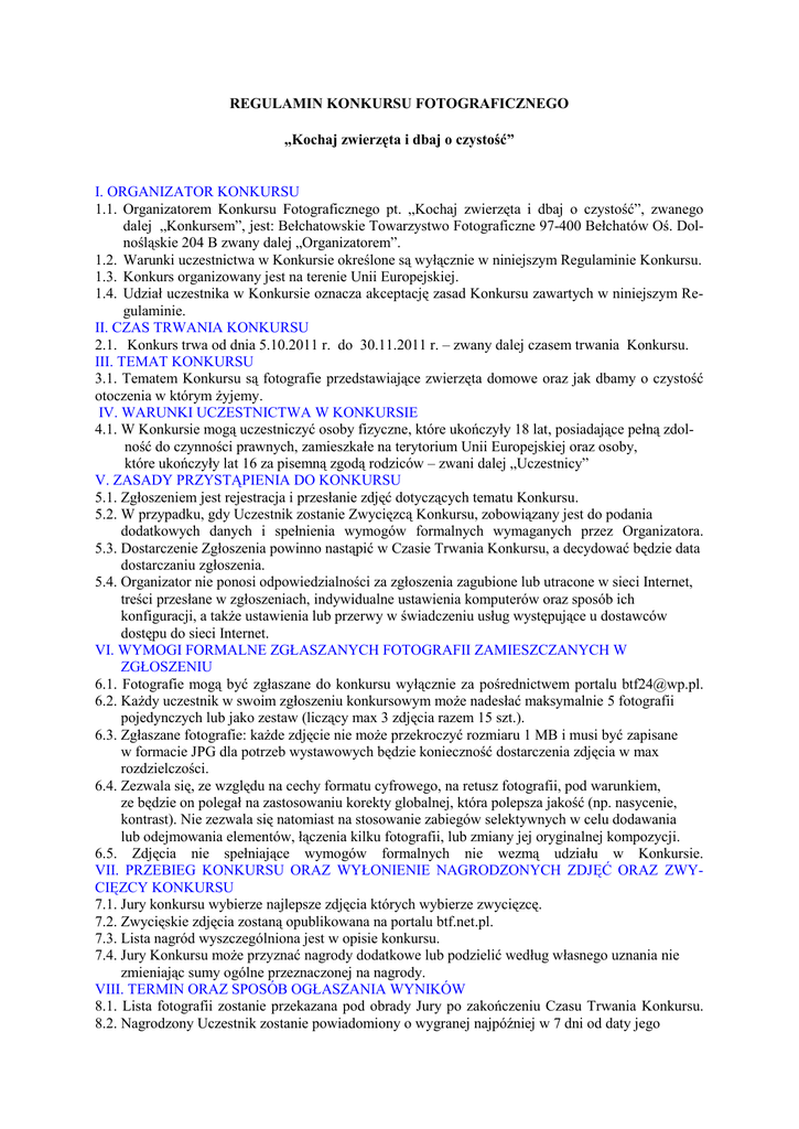 REGULAMIN KONKURSU FOTOGRAFICZNEGO „Kochaj zwierzęta i dbaj o czystość” I. ORGANIZATOR KONKURSU 1.1. Organizatorem Konkursu Fotograficznego pt. „Kochaj zwierzęta i dbaj o czystość”, zwanego dalej „Konkursem”, jest: Bełchatowskie Towarzystwo Fotograficzne 97-400 Bełchatów Oś. Dolnośląskie 204 B zwany dalej „Organizatorem”. 1.2. Warunki uczestnictwa w Konkursie określone są wyłącznie w niniejszym Regulaminie Konkursu. 1.3. Konkurs organizowany jest na terenie Unii Europejskiej. 1.4. Udział uczestnika w Konkursie oznacza akceptację zasad Konkursu zawartych w niniejszym Regulaminie. II. CZAS TRWANIA KONKURSU 2.1. Konkurs trwa od dnia 5.10.2011 r. do 30.11.2011 r. – zwany dalej czasem trwania Konkursu. III. TEMAT KONKURSU 3.1. Tematem Konkursu są fotografie przedstawiające zwierzęta domowe oraz jak dbamy o czystość otoczenia w którym żyjemy. IV. WARUNKI UCZESTNICTWA W KONKURSIE 4.1. W Konkursie mogą uczestniczyć osoby fizyczne, które ukończyły 18 lat, posiadające pełną zdolność do czynności prawnych, zamieszkałe na terytorium Unii Europejskiej oraz osoby, które ukończyły lat 16 za pisemną zgodą rodziców – zwani dalej „Uczestnicy” V. ZASADY PRZYSTĄPIENIA DO KONKURSU 5.1. Zgłoszeniem jest rejestracja i przesłanie zdjęć dotyczących tematu Konkursu. 5.2. W przypadku, gdy Uczestnik zostanie Zwycięzcą Konkursu, zobowiązany jest do podania dodatkowych danych i spełnienia wymogów formalnych wymaganych przez Organizatora. 5.3. Dostarczenie Zgłoszenia powinno nastąpić w Czasie Trwania Konkursu, a decydować będzie data dostarczaniu zgłoszenia. 5.4. Organizator nie ponosi odpowiedzialności za zgłoszenia zagubione lub utracone w sieci Internet, treści przesłane w zgłoszeniach, indywidualne ustawienia komputerów oraz sposób ich konfiguracji, a także ustawienia lub przerwy w świadczeniu usług występujące u dostawców dostępu do sieci Internet. VI. WYMOGI FORMALNE ZGŁASZANYCH FOTOGRAFII ZAMIESZCZANYCH W ZGŁOSZENIU 6.1. Fotografie mogą być zgłaszane do konkursu wyłącznie za pośrednictwem portalu [email protected]. 6.2. Każdy uczestnik w swoim zgłoszeniu konkursowym może nadesłać maksymalnie 5 fotografii pojedynczych lub jako zestaw (liczący max 3 zdjęcia razem 15 szt.). 6.3. Zgłaszane fotografie: każde zdjęcie nie może przekroczyć rozmiaru 1 MB i musi być zapisane w formacie JPG dla potrzeb wystawowych będzie konieczność dostarczenia zdjęcia w max rozdzielczości. 6.4. Zezwala się, ze względu na cechy formatu cyfrowego, na retusz fotografii, pod warunkiem, ze będzie on polegał na zastosowaniu korekty globalnej, która polepsza jakość (np. nasycenie, kontrast). Nie zezwala się natomiast na stosowanie zabiegów selektywnych w celu dodawania lub odejmowania elementów, łączenia kilku fotografii, lub zmiany jej oryginalnej kompozycji. 6.5. Zdjęcia nie spełniające wymogów formalnych nie wezmą udziału w Konkursie. VII. PRZEBIEG KONKURSU ORAZ WYŁONIENIE NAGRODZONYCH ZDJĘĆ ORAZ ZWYCIĘZCY KONKURSU 7.1. Jury konkursu wybierze najlepsze zdjęcia których wybierze zwycięzcę. 7.2. Zwycięskie zdjęcia zostaną opublikowana na portalu btf.net.pl. 7.3. Lista nagród wyszczególniona jest w opisie konkursu. 7.4. Jury Konkursu może przyznać nagrody dodatkowe lub podzielić według własnego uznania nie zmieniając sumy ogólne przeznaczonej na nagrody. VIII. TERMIN ORAZ SPOSÓB OGŁASZANIA WYNIKÓW 8.1. Lista fotografii zostanie przekazana pod obrady Jury po zakończeniu Czasu Trwania Konkursu. 8.2. Nagrodzony Uczestnik zostanie powiadomiony o wygranej najpóźniej w 7 dni od daty jego rozstrzygnięcia. 8.3. Obrady Jury i wyłonienie Zwycięzcy Konkursu odbędą się pomiędzy 1 a 15 grudnia 2011 roku. 8.4. Sprawozdanie z obrad Jury z listą zwycięzców zostanie opublikowana na btf.net.pl do 22 grudnia 2011 roku. 8.5. Zwycięzca oraz nagrodzeni zostaną poinformowani o wygranych droga mailową lub telefoniczną. IX. DOSTARCZENIE NAGRÓD 9.1. Nagrody zostaną wręczone zwycięzcom na uroczystym podsumowaniu lub wysłane pocztą. 9.2. Za datę przekazania nagrody uznaje się dzień jej wysłania przez Organizatora. 9.3. Odmowa przyjęcia nagrody lub niedostarczenie jej z winy Uczestnika wskutek podania nieprawidłowych danych lub braku ich aktualizacji, oznacza utratę prawa do nagrody. X. POSTANOWIENIA KOŃCOWE 10.1. Organizator zastrzega sobie prawo zmiany Regulaminu, jeżeli nie wpłynie to na pogorszenie warunków uczestnictwa w Konkursie. Aktualny regulamin dostępny jest w siedzibie Organizatora, oraz na Stronie Konkursowej. 10.2. Osoby, które nie spełnią któregokolwiek z wymogów określonych w niniejszym Regulaminie lub podadzą nieprawdziwe informacje, zostaną automatycznie zdyskwalifikowane. 10.3. Uczestnik Konkursu, przesyłając Zgłoszenie wraz z fotografią na Stronę Konkursową oświadcza, iż przysługują mu wyłączne i nieograniczone prawa autorskie do nadesłanych fotografii oraz że wszystkie osoby widniejące na fotografiach wyrażają zgodę na ich opublikowanie oraz publiczną ekspozycję. 10.4. Z tytułu złożonego powyżej oświadczenia Uczestnik przyjmuje na siebie pełną odpowiedzialność prawną. W przypadku jakichkolwiek roszczeń ze strony osób trzecich Uczestnik, po zawiadomieniu go przez Organizatora, nie uchyli się od niezwłocznego przystąpienia do wyjaśnienie sprawy oraz wystąpi przeciwko takim roszczeniom na własny koszt i ryzyko, a nadto zaspokoi wszelkie uzasadnione roszczenia, a w razie ich zasądzenia od Organizatora, regresowo zwróci całość pokrytych roszczeń oraz wszelkie związane z tym wydatki i opłaty, włączając w to koszty procesu i obsługi prawnej, a także naprawi wszelkie inne szkody wynikające z wyżej opisanych roszczeń osób trzecich. 10.5. Uczestnik Konkursu przesyłając Zgłoszenie oświadcza, że wyraża zgodę na wielokrotne, nieodpłatne publikowanie nadesłanych fotografii oraz opublikowanie jego im