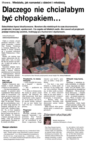 I ł o w o . Wiedziała, jak rozmawiać z dziećmi i młodzieżą Dlaczego nie chciałabym być chłopakiem... Dzieciństwo bywa idealizowane. Bowiem dla niektórych to czas doznawania przykrości, krzywd, upokorzeń. I to często od bliskich osób. Ale nawet od przykrych przeżyć można się uwolnić, traktując je z humorem i dystansem. Andrzej Kwiatkowski [email protected] Chyba to właśnie chciała przekazać dzieciom i mło dzieży terapeutka i pisarka Ewa Nowak. Niedawno w Gminnej Bibliotece Pu blicznej w Iłowie spotkała się z uczniami tamtejszej Szkoły Podstawowej i Gim nazjum. Pisarka, nie mówiąc tego wprost, pokazywała, jak po radzić sobie z tym, co może być dla nas przykre czy bole sne. A także jak pozbyć się kompleksów. Oczywiście najlepiej wpro wadzić humor do naszych relacji z innymi. Dobrym sposobem jest też uczynienie z nieprzyjemnych zdarzeń tematu (zabawnej) opowie ści. Tak zostaje się pisarzem. Brat, czyli mały tyranek Pisarka z humorem opo wiadała o swoich relacjach z bratem (w dzieciństwie): — Czy ktoś wam kiedyś po wiedział, że jesteście głusi i upośledzeni? Mnie mój brat mówił to nieustannie. Czy wiecie, jak się do mnie zwra cał? „Ty, głąbie". Na przykład: „Ty, głąbie, masz dzisiaj uro dziny. To dla ciebie". Potem, gdy mu powiedziałam, że je go słowa mogą sprawiać mi przykrość, poprawił się i na zywał mnie „środkiem kapu sty". To, co brat wyprawia z siostrą, to horrorek. Z ni kim już potem nie macie ta kich układów. Te historie z bratem poruszają mnie do dzisiaj i stały się zaczynem moich książek. Chciałam, że by zostały utrwalone. Po spotkaniu Ewa Nowak podpisywała swoje książki Fot. Andrzej Kwiatkowski Pozytywnie, to znaczy fałszywie —A kto chciałby być posta cią z książek? — spytała uczniów. — My! — podniosło się sporo rąk. — A reszta to kłamczuchy. Bo każdy by chciał zostać opisany. Ale fałszywie, bo tylko pozytywnie. Jeśli dasz znajomemu cechy negatyw ne, to się obrazi. Ale czy ta ka postać byłaby ciekawa? I czy są tacy ludzie bez wad? Nie ma — twierdziła pisarka. Piegowaci są fajni Słuchają, niekiedy zaska kujących, historyjek i wy powiedzi Ewy Nowak, uczniowie mogli „oderwać się" od schematów w my śleniu i reagowaniu. Mogli Naszym zdaniem Słuchając Ewy Nowak i śmiejąc się z jej „braterskich histo ryjek", młodzi ludzie mogli zapomnieć o swoich różnych „ciemiężycielach". A ci, którzy mają jakieś kompleksy (a kto ich nie ma), mogli poczuć się — i odetchnąć — swo bodniej. I o to chyba chodziło tej terapeutce-pisarce, praw dziwej przyjaciółce młodych ludzi. inaczej („na luzie"), spoj rzeć na siebie i swoje pro blemy. — Czy ktoś z was miał kłopoty z nauką jazdy na rowerze? To się rzadko zda rza, ale ja miałam. Okazuje się, że takie osoby są nieza leżne, że różne autorytet mają na nie mały wpływ — argumentowała terapeutka-pisarka. I stwierdziła: — Bardzo lubię rude dziewczyny. Wszystkie rude dziewczyny zawsze ładnie wyglądają. Kilka miłych słów powie działa także o osobach pie gowatych. Chłopaki mają lepiej, ale... Dyskutując z młodzieżą pi sarka stwierdziła, że chłopaki w życiu mają lepiej niż dziew czyny. Lecz, jak dodała, z jed nego powodu nie chciałaby być chłopakiem. — Bo wy, jak spo tkacie dziewczynę — zwróciła się do męskiej części publicz ności — to musicie zacząć roz mowę. Wiem, że każdy z was ma przygotowane takie inte lektualne otwarcia. Rzeczywiście, chyba każdy chłopak pamięta udrękę, jaką czasem przeżywał, myśląc, że powinien zabawiać rozmową koleżankę. Zdaniem słuchaczki Natalia Awerjanow, uczennica Gimnazjum w Iłowie Pani Ewa Nowak bardzo miło mnie zaskoczyła, po nieważ nigdy nie sądziłam, że pisarka może mieć taki fantastyczny charakter. Do skonale znała problemy dzi siejszej młodzieży, a także w ciekawy sposób pokaza ła, jak należy z nich wycho dzić. Myślę, że każdy obec ny na spotkaniu był bardzo zadowolony. Mam nadzie ję, że Pani Ewa kiedyś jesz cze przyjedzie do Iłowa, z wielką chęcią spotkam się z Nią jeszcze raz.