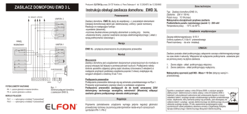 ZASILACZ DOMOFONU EWD 3 L Producent: ELFON Sp. z o.o. 30-727 Kraków, ul. Pana Tadeusza 4 tel. 12 2924870, fax 12 2924865 Instrukcja obsługi zasilacza domofonu EWD 3L Przeznaczenie Do dalszych unifonów UNIFON 2 S Dz M MASA Z Z PANEL UNIFON 1 ROZMÓWNY . Dz M M Montaż MASA Z n Z 2 . 1 ELEKTROZACZEP SG SU MK KE SG + T GK MU EZ EZ 250mA POTENCJOMETRY NASTAWNE PK -1 - poziom głośności w kasecie domofonu PK -2 - poziom głośności w unifonie Wersja EWD 3L - przyłącza przeznaczone do przykręcania przewodów S GK Zasilacz domofonu EWD 3L służy do współpracy z pozostałymi elementami instalacji domofonowej takimi jak: elektrozaczep, unifony i panel rozmówny. Realizuje on następujące funkcje : -wywołanie (dzwonek), -rozmowa dwukierunkowa pomiędzy abonentem a osobą przy bramie, -otwieranie bramy poprzez zwalnianie zaczepu elektromagnetycznego ( układ z opcją podtrzymania czasowego ). ~ EZ~ ~ Rys . 1 Schemat połączeń domofonu z zasilaczem EWD 3L Mocowanie Zasilacz domofonu jest urządzeniem stacjonarnym przeznaczonym do montażu w pozycji wiszącej lub leżącej w pomieszczeniach suchych. Podłączenia należy dokona uprzednio zdjąwszy górną część obudowy (mocowana 2 wkrętami) a następnie przykręcić podstawę urządzenia poprzez 2 otwory znajdujące się wrogach wkrętami o średnicy 6 lub 7 mm Podłączenie przewodów Podłączenia przewodów dokonuje się wg schematu przedstawionego na Rys.1. Przewody wyprowadzamy poprzez otwory w podstawie urządzenia. Podłączenia przewodów zasilających do do kostki oznaczonej 230V dokonujemy zachowując szczególną ostrożność! (Wcześniej odłączyć zasilanie główne podłączanego obwodu elektrycznego). WERSJE POŁĄCZEŃ Poł.1 Poł.2 wykonujemy w instalacji “5 przewodowej” wykonujemy w instalacji “4 przewodowej” Regulacja Poprawnie zainstalowane urządzenie wymaga jedynie regulacji głośności prowadzonej rozmowy za pomocą potencjometrów nasta-wnych oznaczonych symbolami PK-1 i PK-2 Dane techniczne Typ: Zasilacz domofonu EWD 3 L Zasilanie: 230 V / 50 Hz Pobór mocy: 10 VA (max) Maksymalna obciążalność prądowa zasilania Podświetlania panelu rozmównego (zacisk +) - 250 mA! Temperatura pracy: - 10°C do 50°C . Urządzenia współpracujące Zaczep elektromagnetyczny 8-15 V Unifony systemu 4, 5 lub 6 - przewodowego Panel rozmówny - do w/w instalacji. UWAGA! Zasilacz posiada układ podtrzymujący załączenie zaczepu elektromagnetycznego na czas około 4 sekundy. Włączenie lub wyłączenie podtrzymania ustawiane jest za pomocą zwory na płytce zasilacza. 1. Zwora zdjęta - układ podtrzymujący włączony . 2. Zwora założona - układ podtrzymujący wyłączony . Maksymalna oporność pętli MU - Masa = 10 Om (dotyczy wersji 4 przewodowej). Zgodnie z przepisami ustawy z dnia 29 lipca 2005r. o zużytym sprzęcie elektrycznym i elektronicznym a także ustawy z dnia 24 kwietnia 2009 o bateriach i akumulatorach zabronione jest umieszczanie łącznie z innymi odpadami baterii i zużytego sprzętu oznakowanego symbolem przekreślonego kosza. Użytkownik, który zamierza pozbyć się produktu, jest obowiązany do oddania baterii i zużytego sprzętu elektronicznego lub elektrycznego do punktu zbierania zużytego sprzętu. W celu zapewnienia przestrzegania wyżej wymienionych ustaw posiadamy stosowna umowę z Organizacją Odzysku Sprzętu Elektrycznego i Elektronicznego Biosystem Elektrorecykling.