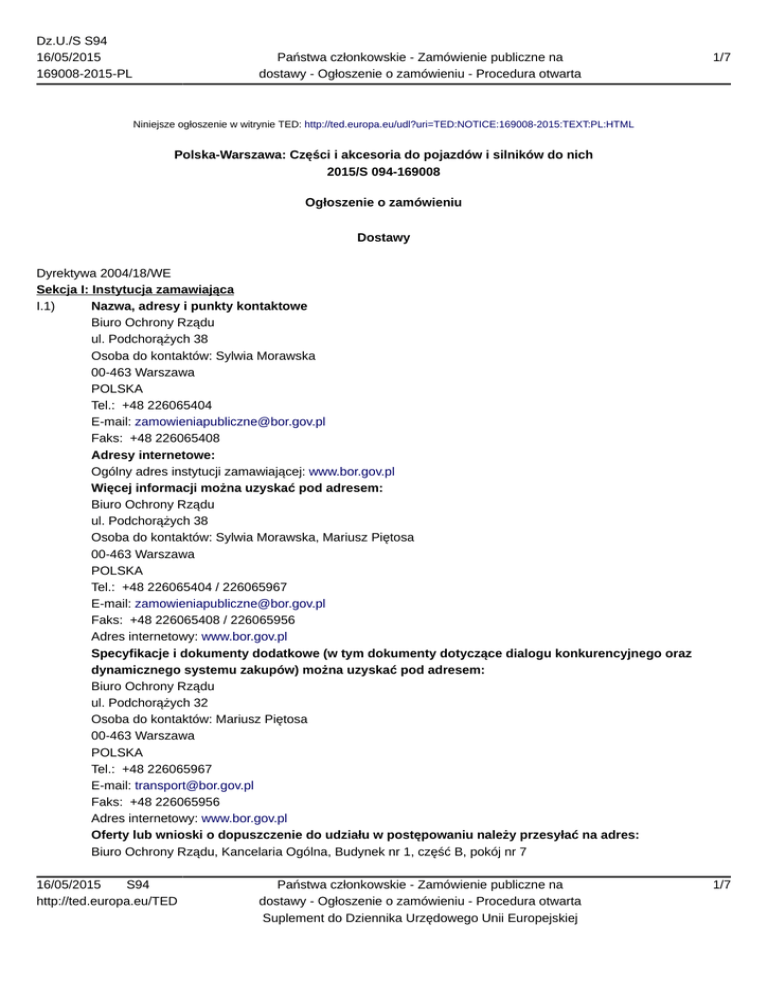 Dz.U./S S94 16/05/2015 169008-2015-PL Państwa członkowskie - Zamówienie publiczne na dostawy - Ogłoszenie o zamówieniu - Procedura otwarta 1/7 Niniejsze ogłoszenie w witrynie TED: http://ted.europa.eu/udl?uri=TED:NOTICE:169008-2015:TEXT:PL:HTML Polska-Warszawa: Części i akcesoria do pojazdów i silników do nich 2015/S 094-169008 Ogłoszenie o zamówieniu Dostawy Dyrektywa 2004/18/WE Sekcja I: Instytucja zamawiająca I.1) Nazwa, adresy i punkty kontaktowe Biuro Ochrony Rządu ul. Podchorążych 38 Osoba do kontaktów: Sylwia Morawska 00-463 Warszawa POLSKA Tel.: +48 226065404 E-mail: [email protected] Faks: +48 226065408 Adresy internetowe: Ogólny adres instytucji zamawiającej: www.bor.gov.pl Więcej informacji można uzyskać pod adresem: Biuro Ochrony Rządu ul. Podchorążych 38 Osoba do kontaktów: Sylwia Morawska, Mariusz Piętosa 00-463 Warszawa POLSKA Tel.: +48 226065404 / 226065967 E-mail: [email protected] Faks: +48 226065408 / 226065956 Adres internetowy: www.bor.gov.pl Specyfikacje i dokumenty dodatkowe (w tym dokumenty dotyczące dialogu konkurencyjnego oraz dynamicznego systemu zakupów) można uzyskać pod adresem: Biuro Ochrony Rządu ul. Podchorążych 32 Osoba do kontaktów: Mariusz Piętosa 00-463 Warszawa POLSKA Tel.: +48 226065967 E-mail: [email protected] Faks: +48 226065956 Adres internetowy: www.bor.gov.pl Oferty lub wnioski o dopuszczenie do udziału w postępowaniu należy przesyłać na adres: Biuro Ochrony Rządu, Kancelaria Ogólna, Budynek nr 1, część B, pokój nr 7 16/05/2015 S94 http://ted.europa.eu/TED Państwa członkowskie - Zamówienie publiczne na dostawy - Ogłoszenie o zamówieniu - Procedura otwarta Suplement do Dziennika Urzędowego Unii Europejskiej 1/7 Dz.U./S S94 16/05/2015 169008-2015-PL Państwa członkowskie - Zamówienie publiczne na dostawy - Ogłoszenie o zamówieniu - Procedura otwarta 2/7 ul. Podchorążych 38 00-463 Warszawa POLSKA I.2) Rodzaj instytucji zamawiającej Inna: państwowa jednostka budżetowa I.3) Główny przedmiot lub przedmioty działalności Porządek i bezpieczeństwo publiczne I.4) Udzielenie zamówienia w imieniu innych instytucji zamawiających Instytucja zamawiająca dokonuje zakupu w imieniu innych instytucji zamawiających: nie Sekcja II: Przedmiot zamówienia II.1) Opis II.1.1) Nazwa nadana zamówieniu przez instytucję zamawiającą: Dostawa pełnego asortymentu oryginalnych, fabrycznie nowych części zamiennych do samochodów marki LAND ROVER DISCOVERY 3, LAND ROVER DISCOVERY 4, LAND ROVER RANGE ROVER. II.1.2) Rodzaj zamówienia oraz lokalizacja robót budowlanych, miejsce realizacji dostawy lub świadczenia usług Dostawy Kupno Główne miejsce lub lokalizacja robót budowlanych, miejsce realizacji dostawy lub świadczenia usług: Biuro Ochrony Rządu, 00-463 Warszawa ul.Podchorążych 32. Kod NUTS II.1.3) Informacje na temat zamówienia publicznego, umowy ramowej lub dynamicznego systemu zakupów (DSZ) Ogłoszenie dotyczy zamówienia publicznego II.1.4) Informacje na temat umowy ramowej II.1.5) Krótki opis zamówienia lub zakupu Dostawa pełnego asortymentu oryginalnych, fabrycznie nowych części zamiennych do samochodów marki LAND ROVER DISCOVERY 3, LAND ROVER DISCOVERY 4, LAND ROVER RANGE ROVER zgodnie z wymaganiami określonymi w SIWZ. II.1.6) Wspólny Słownik Zamówień (CPV) 34300000 II.1.7) Informacje na temat Porozumienia w sprawie zamówień rządowych (GPA) Zamówienie jest objęte Porozumieniem w sprawie zamówień rządowych (GPA): tak II.1.8) Części To zamówienie podzielone jest na części: nie II.1.9) Informacje o ofertach wariantowych Dopuszcza się składanie ofert wariantowych: nie II.2) Wielkość lub zakres zamówienia II.2.1) Całkowita wielkość lub zakres: Szacunkowa wartość bez VAT: 16/05/2015 S94 http://ted.europa.eu/TED Państwa członkowskie - Zamówienie publiczne na dostawy - Ogłoszenie o zamówieniu - Procedura otwarta Suplement do Dziennika Urzędowego Unii Europejskiej 2/7 Dz.U./S S94 16/05/2015 169008-2015-PL Państwa członkowskie - Zamówienie publiczne na dostawy - Ogłoszenie o zamówieniu - Procedura otwarta 3/7 Zakres: między 134 000 i 10 000 000 EUR II.2.2) Informacje o opcjach Opcje: nie II.2.3) Informacje o wznowieniach Jest to zamówienie podlegające wznowieniu: nie II.3) Czas trwania zamówienia lub termin realizacji Rozpoczęcie 13.7.2015. Zakończenie 31.12.2017 Sekcja III: Informacje o charakterze prawnym, ekonomicznym, finansowym i technicznym III.1) Warunki dotyczące zamówienia III.1.1) Wymagane wadia i gwarancje: Wymaga się wniesienia wadium w wysokości: 20.000,00 zł. Zamawiający będzie żądał od Wykonawcy przed dniem zawarcia umowy wniesienie zabezpieczenia należytego wykonania umowy w wysokości 5 % wartości nominalnej zobowiązania Zamawiającego wynikającego z umowy. III.1.2) Główne warunki finansowe i uzgodnienia płatnicze i/lub odniesienie do odpowiednich przepisów je regulujących: Płatność w PLN. Zapłata w terminie 30 dni od daty prawidłowo wystawionej faktury i otrzymania części. III.1.3) Forma prawna, jaką musi przyjąć grupa wykonawców, której zostanie udzielone zamówienie: III.1.4) Inne szczególne warunki Wykonanie zamówienia podlega szczególnym warunkom: nie III.2) Warunki udziału III.2.1) Sytuacja podmiotowa wykonawców, w tym wymogi związane z wpisem do rejestru zawodowego lub handlowego Informacje i formalności konieczne do dokonania oceny spełniania wymogów: 1. W celu oceny spełniania przez Wykonawców warunków określonych w art. 22 ust. 1 Ustawy, Zamawiający żąda pisemnego oświadczenia Wykonawcy, że spełnia warunki udziału w postępowaniu zgodnie z art. 22 ust. 1 Ustawy (załącznik nr 2 do SIWZ); Wykonawca może polegać na wiedzy i doświadczeniu, potencjale technicznym, osobach zdolnych do wykonania zamówienia lub zdolnościach finansowych innych podmiotów, niezależnie od charakteru prawnego łączących go z nimi stosunków. Wykonawca w takiej sytuacji zobowiązan