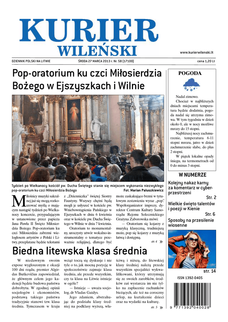 www.kurierwilenski.lt DZIENNIK POLSKI NA LITWIE ŚRODA 27 MARCA 2013 r. Nr. 58 (17100) cena 1,20 Lt Pop-oratorium ku czci Miłosierdzia Bożego w Ejszyszkach i Wilnie POGODA Nadal zimowo. Chociaż w najbliższych dniach miejscami temperatura będzie dodatnia, pogoda nadal się utrzyma zimowa. W tym tygodniu w dzień około 0, ale w nocy możliwe mrozy do 15 stopni. Najbliższej nocy zachmurzenie, temperatura 6-11 stopni mrozu, jutro w dzień zachmurzenie słabe, do plus 2 stopni. W piątek lokalne opady śniegu, na termometrach od 0 do minus 3 stopni. W NUMERZE Tydzień po Wielkanocy kościół pw. Ducha Świętego stanie się miejscem wykonania niezwykłego pop-oratorium ku czci Miłosierdzia Bożego Fot. Marian Paluszkiewicz M iłośnicy muzyki sakralnej już się mogą rozkoszować myślą o mającym nastąpić tydzień po Wielkanocy koncercie, przypadającym w ustanowione przez papieża Jana Pawła II Święto Miłosierdzia Bożego. Pop-oratorium ku czci Miłosierdzia zabrzmi wielogłosem artystów z Polski i Litwy, przeplatane będzie tekstami z „Dzienniczka” świętej Siostry Faustyny. Wszyscy chętni będą mogli je usłyszeć w kościele pw. Wniebowstąpienia Pańskiego w Ejszyszkach w dniu 6 kwietnia oraz w kościele pw. Ducha Świętego w Wilnie w dniu 7 kwietnia. Oratorium to monumentalny, uroczysty utwór wokalno-instrumentalny o tematyce przeważnie religijnej, dlatego być może zaskakująco brzmi w tytułowym zestawieniu wyraz „pop”. Współorganizator imprezy, dyrektor Centrum Kultury Samorządu Rejonu Solecznickiego Grażyna Zaborowska mówi: — Oratorium się kojarzy z muzyką klasyczną, trudniejszą może, pop się kojarzy z muzyką łatwą i dostępną. W niedawnym swoim expose wygłoszonym z okazji 100 dni rządu, premier Algirdas Butkevičius zapowiedział, że głównym celem jego kadencji będzie budowa państwa dobrobytu. W zgodnej opinii socjologów i ekonomistów, podstawą takiego państwa tradycyjnie stanowi tzw. klasa średnia. Tymczasem w kraju wciąż toczą się dyskusje i nie tyle o to, jak mocną pozycję w społeczeństwie zajmuje klasa średnia, ale przede wszystkim, czy ta klasa na Litwie istnieje w ogóle? — Istnieje — uważa socjolog, dr Vladas Gaidys. Jego zdaniem, abstrahując do podziału klasy średniej na podklasy wyższą, wła- ściwą i niższą, do litewskiej klasy średniej należą przede wszystkim specjaliści wykwalifikowani, którzy utrzymują się ze swoich zarobków, środków zaś wystarcza im nie tylko na zapłacenie rachunków bieżących, ale też na coroczny urlop, na kształcenie dzieci oraz na wydatki na kulturę. Biedna litewska klasa średnia str. 4 str. 5 Kolejny nakaz karny za komentarz w cyberprzestrzeni Str. 2 Wielkie święto talentów i poezji w Kienie Str. 6 Sposoby na przesilenie wiosenne » » str. 14 ISSN 1392-0405 2 WYDARZENIA KURIER WILEŃSKI • Środa, 27 marca 2013 r. Kolejny nakaz karny za komentarz w cyberprzestrzeni Środa Marzec 2013 27 Imieniny: Archibalda, Augusta, Benedykta, Ernesta, Franciszka, Gelazego, Jana, Lidii, Łazarza, Roberta i Rzędzimira TRZY PYTANIA DO... ...Robertasa Petkevičiusa, kierownika litewskiego biura Światowej Organizacji Zdrowia 1. Właśnie był obchodzony Światowy Dzień Walki z Gruźlicą. Jaki jest postęp walki z tą chorobą? Gruźlica to bardzo perfidna choroba i niektóre jej formy są odporne na leki. Dlatego gruźlica pozostaje na liście najbardziej niebezpiecznych chorób na świecie. Według oszacowań Światowej Organizacji Zdrowia co godzinę w świecie rejestruje się około 50 nowych przypadków tej choroby i ponad 5 przypadków śmierci z powodu gruźlicy. Ponad połowa wszystkich chorych to mieszkańcy Azji, a najwyższe współczynniki zapadalności na gruźlicę występują w Afryce, gdzie duży odsetek populacji jest zakażony HIV. Jednak również kraje Europy są w grupie ryzyka: w UE codziennie rejestruje się około 1 000 nowych przypadków gruźlicy. 2. Jak sytuacja wygląda na Litwie? W naszym państwie profilaktyka i kontrola gruźlicy należy do priorytetowych dziedzin polityki zdrowotnej. Liczba chorych, chociaż powoli, jednak maleje. Na przykład w roku 2008 odnotowano 1 892 chore dorosłe osoby. Zaś w roku ubiegłym — 1 430. Liczba chorych na gruźlicę dzieci odpowiednio zmniejszyła się z 127 do 78. 3. Jakie są przyczyny zachorowania na gruźlicę? Czynniki sprzyjające zachorowaniu na gruźlicę to niedożywienie, złe warunki mieszkaniowe, sytuacje stresowe, alkoholizm, narkomania, zakażenie HIV, choroby nowotworowe, cukrzyca a także bezpośredni kontakt z chorą osobą. Choroba uszkadza różne organy ciała, przede wszystkim — płuca. Leczenie chorego na gruźlicę trwa około 6-8 miesięcy. Dla państwa kosztuje ono średnio 6 tys. litów. Rozmawiała Brygita Łapszewicz KURIER WILEŃSKI Ukazuje się od 1 lipca 1953 roku Birbynių g. 4a, 02121-30 Vilnius, Lietuvos Respublika, tel./fax 260 84 44 DZIENNIK NALEŻY DO EUROPEJSKIEGO STOWARZYSZENIA GAZET CODZIENNYCH MNIEJSZOŚCI NARODOWYCH Nakład: 3000 egz. Sąd dzielnicowy rejonu rosieńskiego (Rase iniai) wydał nakaz karny dla mieszkańca tego miasta za poniżający komentarz. K omentarz ten publicznie podżega do nienawiści oraz nawołuje do dyskryminacji na tle narodowościowym. To jest kolejny pozytywny efekt kampanii Europejskiej Fundacji Praw Człowieka (EFHR) polegającej na składaniu wniosków do prokuratur (więcej http://www.efhr. eu/category/nasza-dzialalnosc/ wygrane/). Komentarz został napisany w portalu informacyjnym www.15min.lt pod artykułem „Polscy nacjonaliści odrzucili Litwinów zaproszenie o przyjaźni” (tłum. „Lenkijos nacionalistai lietuvių kvietimą draugauti atmetė”). A. M. został ukarany karą pieniężną w wysokości 650 Lt. Z nakazu karnego wynika, że autor komentarza przyznał się do winy i szczerze żałuje za swoje prowokujące postępowanie. Swój komentarz tłumaczył zdenerwowaniem na treść artykułu i dlatego z