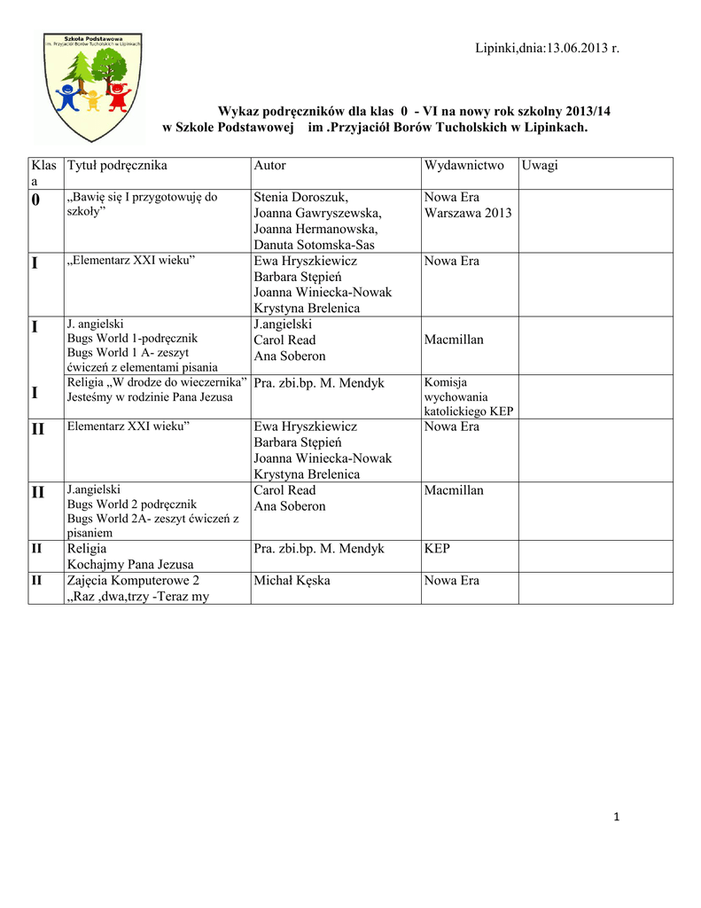 Lipinki,dnia:13.06.2013 r. Wykaz podręczników dla klas 0 - VI na nowy rok szkolny 2013/14 w Szkole Podstawowej im .Przyjaciół Borów Tucholskich w Lipinkach. Klas Tytuł podręcznika a Autor Wydawnictwo Stenia Doroszuk, Joanna Gawryszewska, Joanna Hermanowska, Danuta Sotomska-Sas Ewa Hryszkiewicz Barbara Stępień Joanna Winiecka-Nowak Krystyna Brelenica J.angielski Carol Read Ana Soberon Nowa Era Warszawa 2013 0 „Bawię się I przygotowuję do szkoły” I „Elementarz XXI wieku” I I J. angielski Bugs World 1-podręcznik Bugs World 1 A- zeszyt ćwiczeń z elementami pisania Religia „W drodze do wieczernika” Pra. zbi.bp. M. Mendyk Jesteśmy w rodzinie Pana Jezusa II Elementarz XXI wieku” II J.angielski Bugs World 2 podręcznik Bugs World 2A- zeszyt ćwiczeń z pisaniem II Religia Kochajmy Pana Jezusa Zajęcia Komputerowe 2 „Raz ,dwa,trzy -Teraz my II Uwagi Nowa Era Macmillan Komisja wychowania katolickiego KEP Ewa Hryszkiewicz Barbara Stępień Joanna Winiecka-Nowak Krystyna Brelenica Carol Read Ana Soberon Nowa Era Pra. zbi.bp. M. Mendyk KEP Michał Kęska Nowa Era Macmillan 1 Wykaz podręczników na nowy rok szkolny 2013/14 w Szkole Podstawowej im. Przyjaciół Borów Tucholskich w Lipinkach, klasa III Klasa Tytuł podrecznika Raz ,dwa,trzy-Teraz my!III podręcznik Matematyka-ćwiczenia Autor Hanna Klimkowska Małgorzata Sieciszewska Honorata Waszkiewicz Bogusław Lankiewicz Krystyna Sawicka Ewa Swoboda Michał Kęska Zajecia komputerowe-3 do pakietu Raz,dwa,trzy-Teraz my! J.angielskiCarol Read Bugs World 3-podrecznik Ana Soberon Bugs World 3 -zeszyt ćwiczeń Religia- Jezusowa wspólnota ks.Władysław Kulik serc Wydawnictwo Nowa Era Uwagi Nowa Era Nowa Era Macmillan WAM 2 Wykaz podręczników do klasy IV na rok szkolny 2013-14 Przedmiot Tytuł Język polski „Słowa na start”podrecznik do kształcenia literackiego i kulturowego „Słowa na start”podręcznik do kształcenia językowego Matematyka „Matematyka z plusem” Przyroda Autor Wydawnictwo Marlena Derlikiewicz Nowa Era D.Chwastniewska,A.Gorzołc zyńska-Mróz,D.Roźek Nowa Era M.Dobrowolska, M.Karpińska,P.Zarzycki, M.Jucewicz „Przyrodo witaj” E.Chromek,E.Kłos,W.Kofta, Podręcznik i ćwiczenia E.Laskowska,A,Melson J. angielski „Evolution 1” podręcznik Nick Beare + zeszyt dwiczeo Historia „Historia wokół nas” „Zaproszeni przez Boga” - Drogi przymierza. Zajęcia „Informatyka komputerow europejczyka” e Technika „Jak to działa” Religia Plastyka „Do dzieła” Muzyka „Klucz do muzyki” Uwagi Gdańskie Wydawnictwo Oświatowe Wydawnictwo Szkolne i Pedagogiczne Macmillan Radosław Lolo,Anna Pieńkowska, R.Towalski, W.Kawalt Pod kierunkiem ks.Zbigniewa Marka WSiP Danuta Kiałka Katarzyna Kiałka Helion ul. Kościuszki 44-100 Gliwice Lech Łabęcki Marta Łabęcka Jadwiga Lukas Krystyna Onak Urszula Smoczyńska, Katarzyna JakóbczakDrążek, Agnieszka Sołtysik Nowa Era WAM Kraków Nowa Era WSiP 3 Wykaz podręczników do klasy V na rok szkolny 2013-14 Przedmiot Tytuł Język polski „Słowa na stert „ Matematyka „Matematyka z plusem” Autor M. Derlikiewicz, D Chwastniewska, A. Gorzałczyńska H.Dobrowolska,Zarzycki,Juc ewicz,Karpiński Przyroda „Przyrodo witaj!” E.Gromek,E Kłos,E.Laskowska J.angielski Historia ‘Evolution 2” „Historia wokół nas” Nick Beare Radosław Lolo,Anna Pieńkowska,R.Towalski Pod kierunkiem ks.Zbigniewa Marka SJ Religia Obdarowani przez Boga -Drogi przymierza Informatyka „Zajęcia komputerowe” Grażyna Koba Technika „Jak to działa” Plastyka „Do dzieła” Muzyka „Klucz do muzyki” Lech Łabęcki Marta Łabęcka Jadwiga Lukas Krystyna Onak Urszula Smoczyńska, Katarzyna JakóbczakDrążek, Agnieszka Sołtysik Wydawnictwo Nowa Era Uwagi Gdańskie Wydawnictwo Oświatowe Wydawnictwa Szkolne i Pedagogiczne Macmillan WSiP WAM MiGra – Wrocław 2012 Nowa Era Nowa Era WSiP 4 Wykaz podręczników do kasy VI na rok szkolny 2013-14 Przedmiot Tytuł Język polski „Oglądam Świat „ 6 Matematyka Przyroda J. angielski Historia Religia Informatyka Technika Plastyka Muzyka Autor Wydawnictwo Uwagi D.Chwostek Nowa Era E.Nowosielska „Matematyka z M.Dobrowolska,M.Jucewicz, Gdańskie plusem” M.Karpinski Wydawnictwo Oświatowe „Przyrodo witaj” E.Gromek,E.Kłos, Wydawnictwa E.Laskowska Szkolne i Pedagogiczne Project Third Edition- 3 Tom Hutchinson Oxford podrecznik + ćwiczenia „Historia wokół nas” Anna Pieńkowska WSiP Radosław Lolo Przemienieni przez Pod redakcją ks. Zbigniewa WAM Kraków Boga- Drogi Marka - SJ przymierza „Zajęcia komputerowe” Grażyna Koba MiGra – Wrocław 2012 „Technika wokół Halina Józefowicz Nowa Era ciebie” Elżbieta Kaczmarek „Do dzieła” Jadwiga Lukas Nowa Era Krystyna Onak Urszula Smoczyoska, Katarzyna WSiP „Klucz do muzyki” Jakóbczak-Drążek, Agnieszka Sołtysik 5