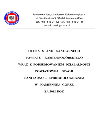 Powiatowa Stacja Sanitarno Epidemiologiczna ul. Sienkiewicza 5; 58-400 Kamienna Góra tel. (075) 645-01-40; fax. (075) 645-01-41 e-mail: [email protected] OCENA STANU POWIATU SANITARNEGO KAMIENNOGÓRSKIEGO WRAZ Z PODSUMOWANIEM DZIAŁALNOŚCI POWIATOWEJ STACJI SANITARNO – EPIDEMIOLOGICZNEJ W KAMIENNEJ GÓRZE ZA 2012 ROK Aktualnie w skład Powiatowej Stacji wchodzą następujące komórki organizacyjne i samodzielne stanowiska pracy: 1) Oddział Nadzoru Terenowego, w skład którego wchodzą: a) Sekcja Higieny Żywności Żywienia i Przedmiotów Użytku; b) Sekcja Higieny Komunalnej; c) Sekcja Higieny Dzieci i Młodzieży; d) Sekcja Oświaty Zdrowotnej i Promocji Zdrowia; e) Sekcja Epidemiologii; f) Sekcja Higieny Pracy; g) Sekcja Poboru Prób. 2) Oddział Ekonomiczny i Administracyjny; 3) Samodzielne Stanowisko Pracy Głównego Specjalisty ds. Systemu Jakości; 4) Samodzielne Stanowisko Pracy ds. Organizacji, Statystyki i Kadr; 5) Samodzielne Stanowisko Pracy ds. Obsługi Prawnej; 6) Samodzielne Stanowisko Pracy ds. Zapobiegawczego Nadzoru Sanitarnego; 7) Samodzielne Stanowisko Pracy – Informatyk; 8) Samodzielne Stanowisko Pracy – Główny Księgowy; 9) Samodzielne Stanowisko Pracy Sekretarki Medycznej. W 2012 roku pod nadzorem stacji znajdowało się 981 obiektów / było 961 / - Sekcja Higieny Żywienia, Żywności i Przedmiotów Użytku nadzorowała - 408 obiektów - Sekcja Higieny Dzieci i Młodzieży - 37 placówek - Sekcja Higieny Komunalnej – 309 obiektów - Sekcja Higieny Pracy – 129 obiekty - Sekcja Epidemiologii – 98 obiekty - Sekcja Oświaty Zdrowotnej – nie posiada pod stałym nadzorem żadnych obiektów. - Sekcja Zapobiegawczego Nadzoru Sanitarnego - nie posiada pod stałym nadzorem żadnych obiektów. 2 Sekcja Żywienia Żywności i Przedmiotów Użytku I. Charakterystyka stanu sanitarnego obiektów żywności i żywienia Według rejestru zakładów w roku 2012 Sekcja HŻŻ i PU nadzorowała 408 obiektów (w liczbie tej nie ujęto pięciu obiektów, które nie prowadziły działalności w roku 2012 – z powodu jej zawieszenia). W roku sprawozdawczym 2012 rozpoczęło działalność 48 zakładów, a likwidacji uległo 47. Pracownicy Sekcji HŻŻ i PU w 2012r.: przeprowadzili 795 kontrole sanitarne (kompleksowe, tematyczne, sprawdzające). wydali łącznie 96 decyzji, w tym: decyzje w wyniku naruszenia wymagań higienicznych i sanitarnych, decyzje zmieniające realizację nałożonych obowiązków oraz decyzje o zakazie wprowadzania do obrotu środka spożywczego. nałożyli 27 mandatów karnych kredytowanych na łączną sumę 5850 zł. W roku sprawozdawczym 2012 Państwowy Powiatowy Inspektor Sanitarny w Kamiennej Górze nie wydał decyzji unieruchomienia zakładów oraz nie kierował wniosków do sądu. Stan sanitarny grup obiektów Obiekty produkcji żywności W roku sprawozdawczym na nadzorowanym terenie znajdowały się 23 obiekty produkcji żywności. W obiektach tych przeprowadzono łącznie 83 kontroli sanitarnych. W grupie zakładów „piekarnie” za stwierdzone nieprawidłowości w zakresie złego stanu sanitarno higienicznego zastosowano postępowanie mandatowe – 2 mandaty karne na sumę 500zł. W grupie zakładów „ciastkarnie” za zły stan sanitarno – porządkowy ukarano przedsiębiorcę 1 mandatem karnym na sumę 300zł. W ramach urzędowej kontroli żywności pobrano próbki do badań mikrobiologicznych w niżej wymienionych zakładach: - piekarniach - 5 próbek, - ciastkarniach - 9 próbek, Na podstawie sprawozdań z badań wszystkie próbki oceniono jako prawidłowe. Ponadto w roku sprawozdawczym pobrano do badań w ramach urzędowej kontroli żywności i monitoringu 4 próbki lodów, wyprodukowanych (z koncentratu) w automatach do lodów. Zbadane próbki w zakresie parametrów mikrobiologicznych oceniono jako prawidłowe. Obiekty obrotu żywnością Na nadzorowanym terenie znajdowało się 231 obiektów obrotu żywnością. W grupie tej przeprowadzono łącznie 526 kontroli sanitarnych, w tym 222 kontroli w ramach systemu RASFF oraz 14 kontroli w wyniku wniesionych interwencji przez konsumentów. 3 Kontrole sanitarne interwencyjne dotyczyły wprowadzania do obrotu żywności po upływie daty minimalnej trwałości, terminu przydatności do spożycia lub żywności o zmienionych cechach organoleptycznych. Przeprowadzone czynności kontrolne potwierdziły zasadność ośmiu interwencji, w wyniku czego wobec osób odpowiedzialnych zastosowano postępowanie mandatowe. Najczęstsze nieprawidłowości w zakresie stanu sanitarnego występujące w sklepach zły stan sanitarny w pomieszczeniach socjalnych i magazynowych; brudne, zapajęczone ściany, posadzki; brudne urządzenia i sprzęt. Za stwierdzone nieprawidłowości w tej grupie obiektów osoby winne zaniedbań ukarano mandatami karnymi (łącznie 19 mandatów karnych na kwotę 4150 zł). Ponadto wydano 4 decyzje o zakazie wprowadzania do obrotu środków spożywczych. Obiekty żywienia zbiorowego Według rejestru na nadzorowanym terenie znajdowało się 90 obiektów żywienia zbiorowego otwartego i zamkniętego. W tej grupie przeprowadzono 161 kontroli sanitarnych. Za stwierdzone nieprawidłowości sanitarno-porządkowe w zakładach żywienia zbiorowego otwartego nałożono 5 mandatów karnych na kwotę 900zł, w tym w zakładach małej gastronomii 1 mandat na sumę 300zł. Przedsiębiorcy w zakładach żywienia zbiorowego systematycznie modernizują obiekty oraz inwestują w nowe urządzenia i sprzęt co ma wpływ na poprawę stanu sanitarno-technicznego w tych zakładach. Personel zakładów żywienia zbiorowego zamkniętego systematycznie podnosi kwalifikacje w zakresie zasad racjonalnego żywienia ludzi oraz wdrażania i utrzymania systemu HACCP poprzez udział w szkoleniach zewnętrznych. Podczas kontroli sanitarnych w zakładach żywienia zbiorowego zamkniętego dokonywano oceny sposobu żywienia, zwracano uwagę na prawidłowość sporządzanych jadłospisów. W przypadku stwie