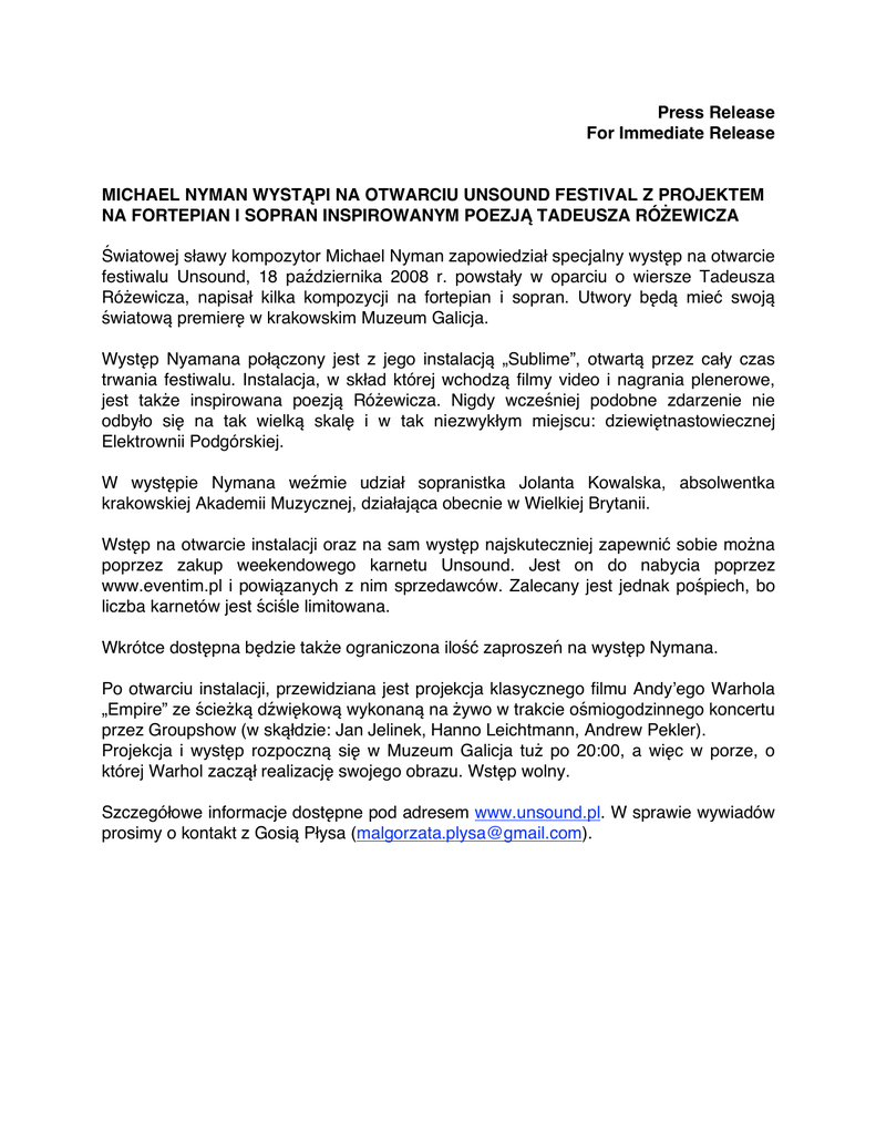 Press Release For Immediate Release MICHAEL NYMAN WYSTĄPI NA OTWARCIU UNSOUND FESTIVAL Z PROJEKTEM NA FORTEPIAN I SOPRAN INSPIROWANYM POEZJĄ TADEUSZA RÓŻEWICZA Światowej sławy kompozytor Michael Nyman zapowiedział specjalny występ na otwarcie festiwalu Unsound, 18 października 2008 r. powstały w oparciu o wiersze Tadeusza Różewicza, napisał kilka kompozycji na fortepian i sopran. Utwory będą mieć swoją światową premierę w krakowskim Muzeum Galicja. Występ Nyamana połączony jest z jego instalacją „Sublime”, otwartą przez cały czas trwania festiwalu. Instalacja, w skład której wchodzą filmy video i nagrania plenerowe, jest także inspirowana poezją Różewicza. Nigdy wcześniej podobne zdarzenie nie odbyło się na tak wielką skalę i w tak niezwykłym miejscu: dziewiętnastowiecznej Elektrownii Podgórskiej. W występie Nymana weźmie udział sopranistka Jolanta Kowalska, absolwentka krakowskiej Akademii Muzycznej, działająca obecnie w Wielkiej Brytanii. Wstęp na otwarcie instalacji oraz na sam występ najskuteczniej zapewnić sobie można poprzez zakup weekendowego karnetu Unsound. Jest on do nabycia poprzez www.eventim.pl i powiązanych z nim sprzedawców. Zalecany jest jednak pośpiech, bo liczba karnetów jest ściśle limitowana. Wkrótce dostępna będzie także ograniczona ilość zaproszeń na występ Nymana. Po otwarciu instalacji, przewidziana jest projekcja klasycznego filmu Andy’ego Warhola „Empire” ze ścieżką dźwiękową wykonaną na żywo w trakcie ośmiogodzinnego koncertu przez Groupshow (w skąłdzie: Jan Jelinek, Hanno Leichtmann, Andrew Pekler). Projekcja i występ rozpoczną się w Muzeum Galicja tuż po 20:00, a więc w porze, o której Warhol zaczął realizację swojego obrazu. Wstęp wolny. Szczegółowe informacje dostępne pod adresem www.unsound.pl. W sprawie wywiadów prosimy o kontakt z Gosią Płysa ([email protected]).