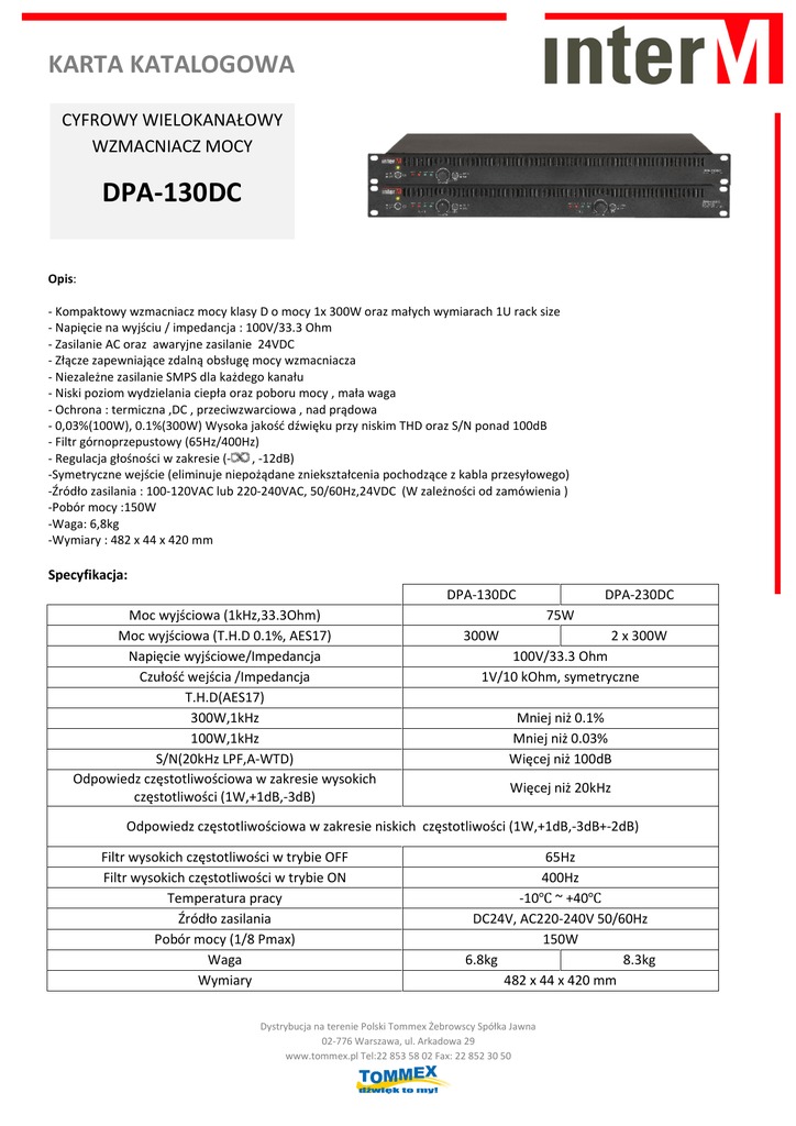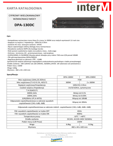 KARTA KATALOGOWA CYFROWY WIELOKANAŁOWY WZMACNIACZ MOCY DPA-130DC Opis: - Kompaktowy wzmacniacz mocy klasy D o mocy 1x 300W oraz małych wymiarach 1U rack size - Napięcie na wyjściu / impedancja : 100V/33.3 Ohm - Zasilanie AC oraz awaryjne zasilanie 24VDC - Złącze zapewniające zdalną obsługę mocy wzmacniacza - Niezależne zasilanie SMPS dla każdego kanału - Niski poziom wydzielania ciepła oraz poboru mocy , mała waga - Ochrona : termiczna ,DC , przeciwzwarciowa , nad prądowa - 0,03%(100W), 0.1%(300W) Wysoka jakość dźwięku przy niskim THD oraz S/N ponad 100dB - Filtr górnoprzepustowy (65Hz/400Hz) - Regulacja głośności w zakresie (, -12dB) -Symetryczne wejście (eliminuje niepożądane zniekształcenia pochodzące z kabla przesyłowego) -Źródło zasilania : 100-120VAC lub 220-240VAC, 50/60Hz,24VDC (W zależności od zamówienia ) -Pobór mocy :150W -Waga: 6,8kg -Wymiary : 482 x 44 x 420 mm Specyfikacja: DPA-130DC Moc wyjściowa (1kHz,33.3Ohm) Moc wyjściowa (T.H.D 0.1%, AES17) Napięcie wyjściowe/Impedancja Czułość wejścia /Impedancja T.H.D(AES17) 300W,1kHz 100W,1kHz S/N(20kHz LPF,A-WTD) Odpowiedz częstotliwościowa w zakresie wysokich częstotliwości (1W,+1dB,-3dB) DPA-230DC 75W 300W 2 x 300W 100V/33.3 Ohm 1V/10 kOhm, symetryczne Mniej niż 0.1% Mniej niż 0.03% Więcej niż 100dB Więcej niż 20kHz Odpowiedz częstotliwościowa w zakresie niskich częstotliwości (1W,+1dB,-3dB+-2dB) Filtr wysokich częstotliwości w trybie OFF Filtr wysokich częstotliwości w trybie ON Temperatura pracy Źródło zasilania Pobór mocy (1/8 Pmax) Waga Wymiary 65Hz 400Hz -10℃ ~ +40℃ DC24V, AC220-240V 50/60Hz 150W 6.8kg 8.3kg 482 x 44 x 420 mm Dystrybucja na terenie Polski Tommex Żebrowscy Spółka Jawna 02-776 Warszawa, ul. Arkadowa 29 www.tommex.pl Tel:22 853 58 02 Fax: 22 852 30 50 KARTA KATALOGOWA Panel Tylny: Dystrybucja na terenie Polski Tommex Żebrowscy Spółka Jawna 02-776 Warszawa, ul. Arkadowa 29 www.tommex.pl Tel:22 853 58 02 Fax: 22 852 30 50